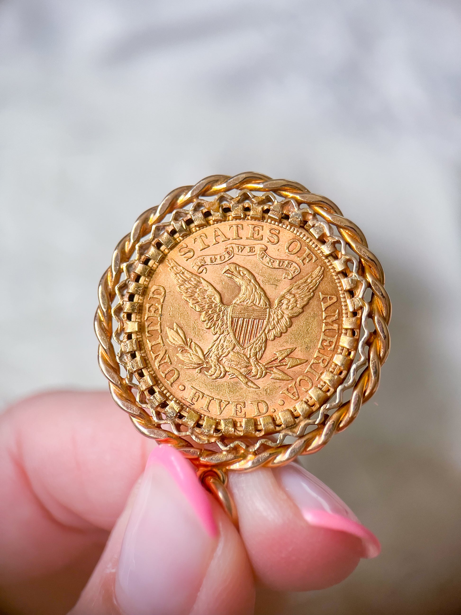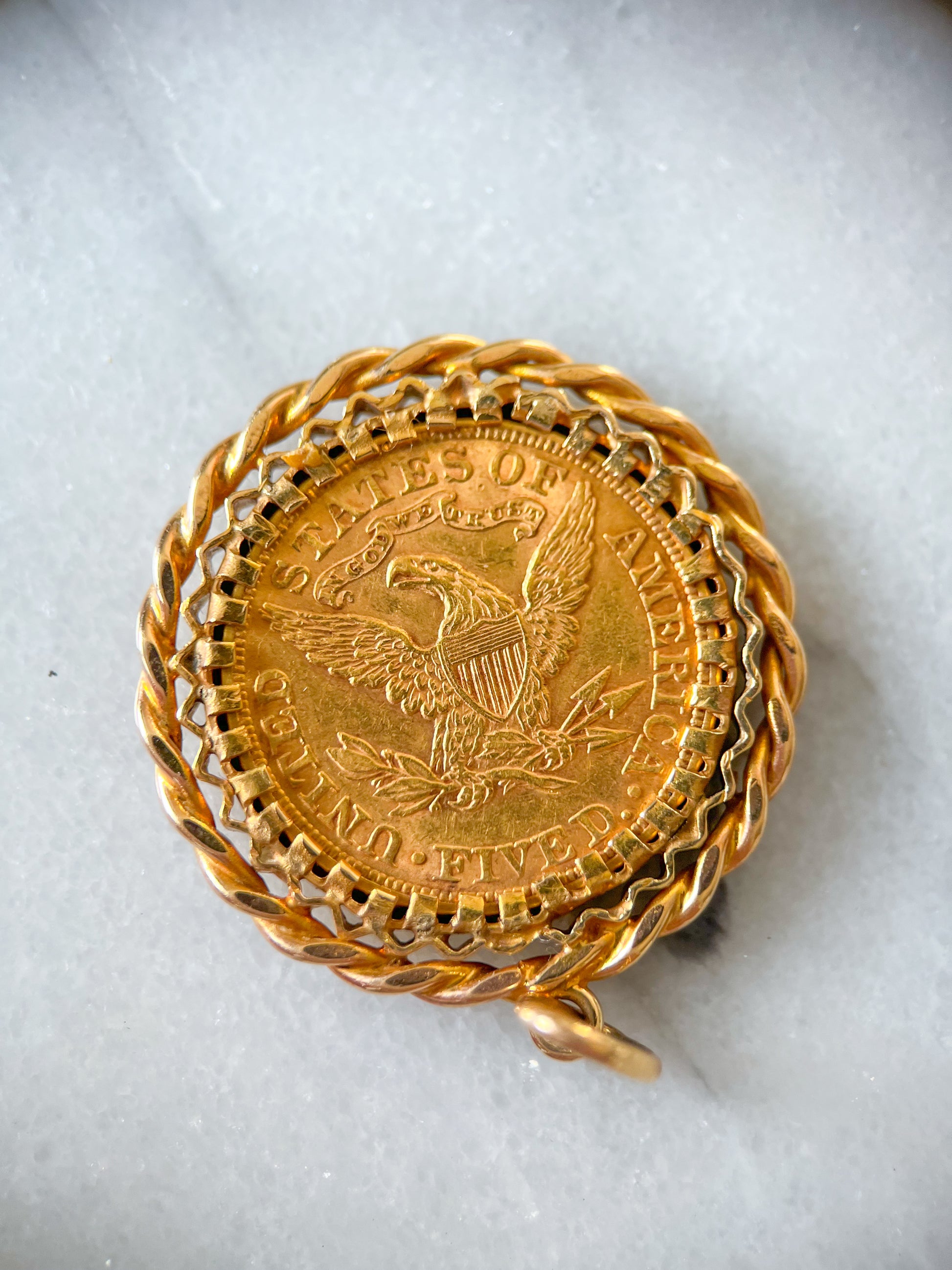 Vintage U.S. Liberty Head 21k Yellow Gold 5 Dollar Coin Pendant