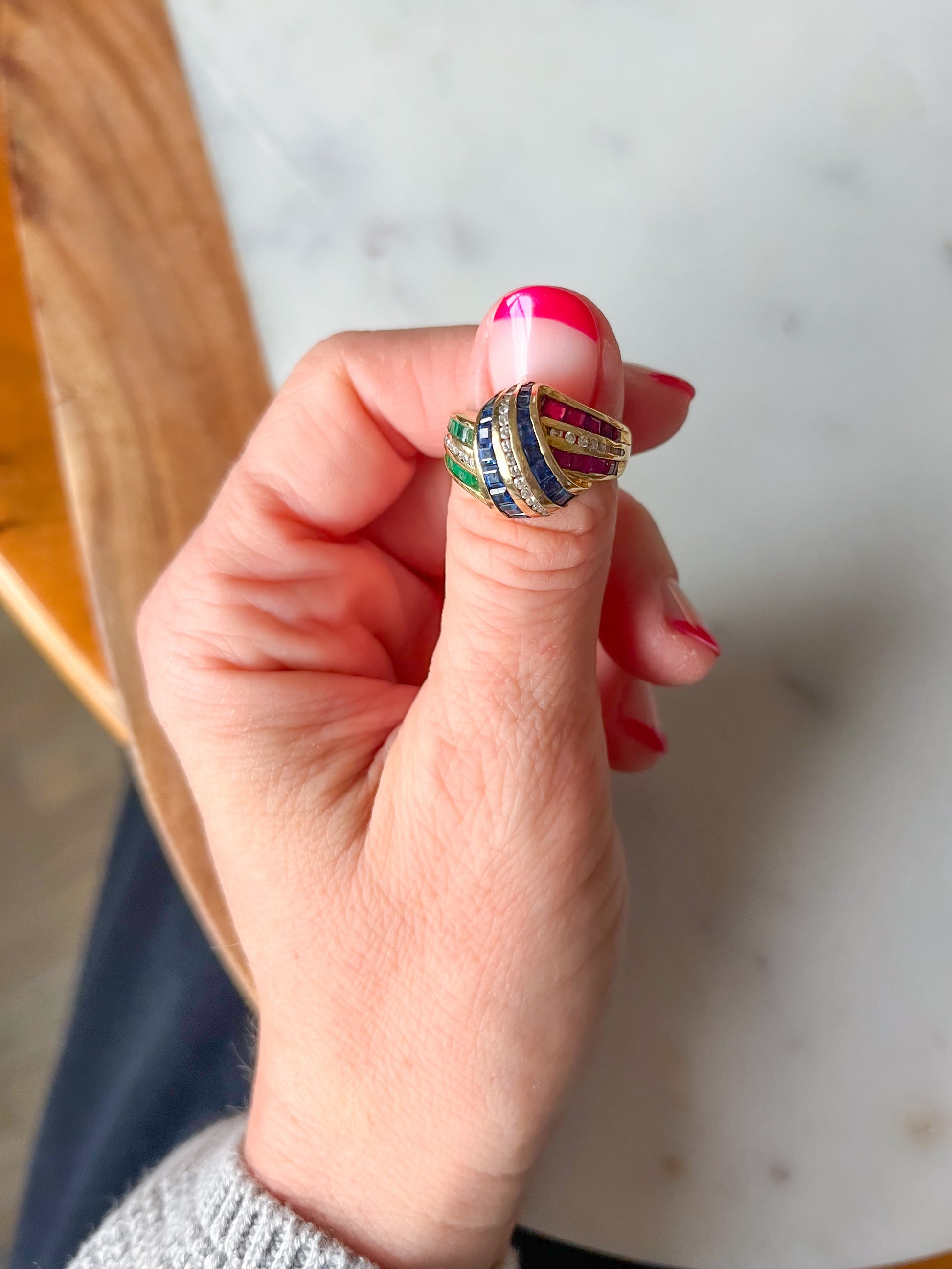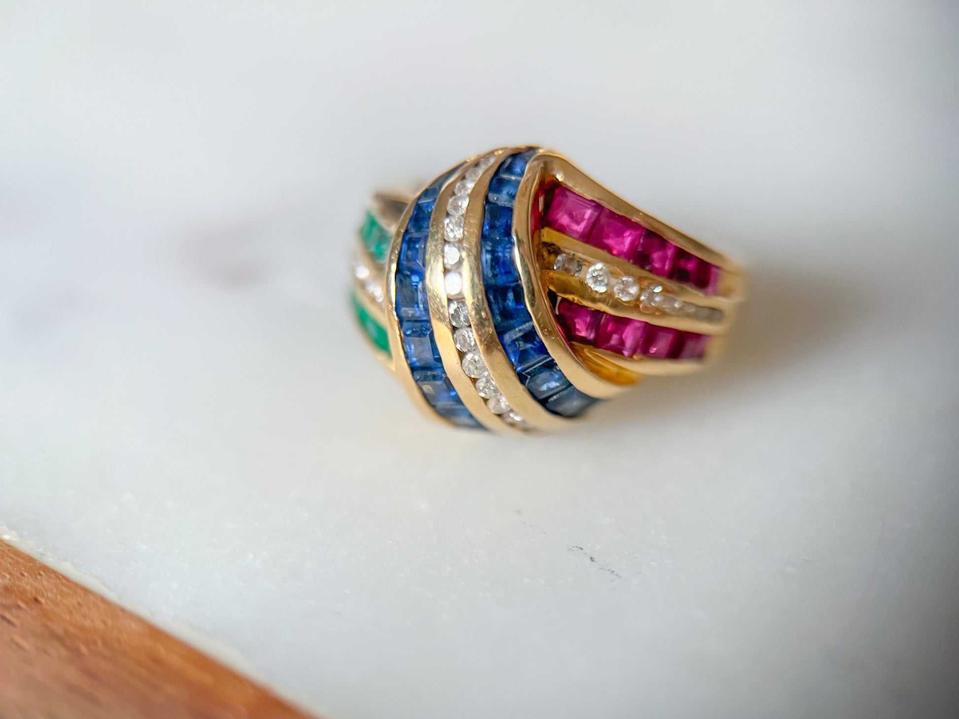 Vintage 14k Yellow Gold Natural Sapphire, Ruby, Emerald and Diamond Ring, circa 1990s