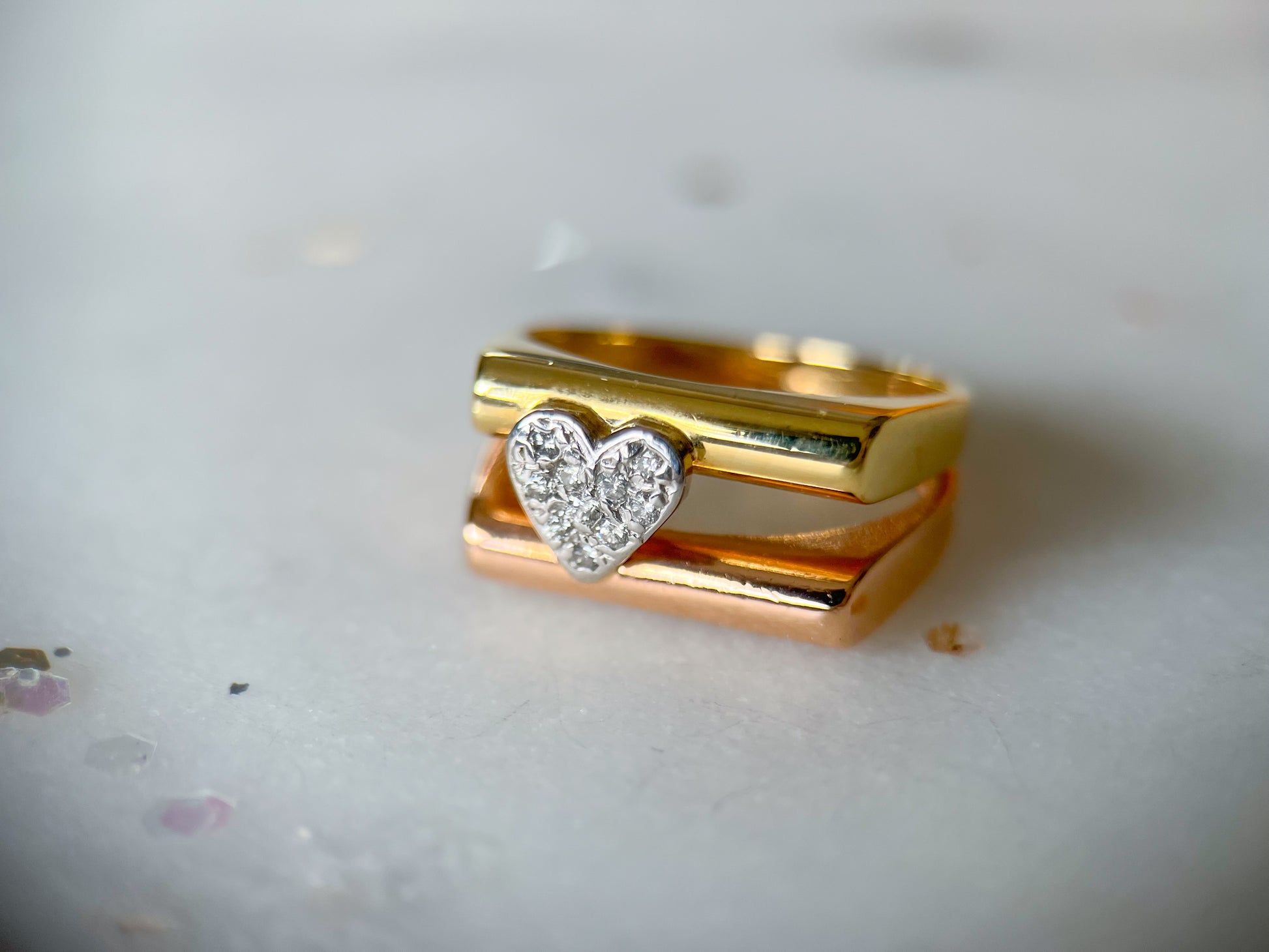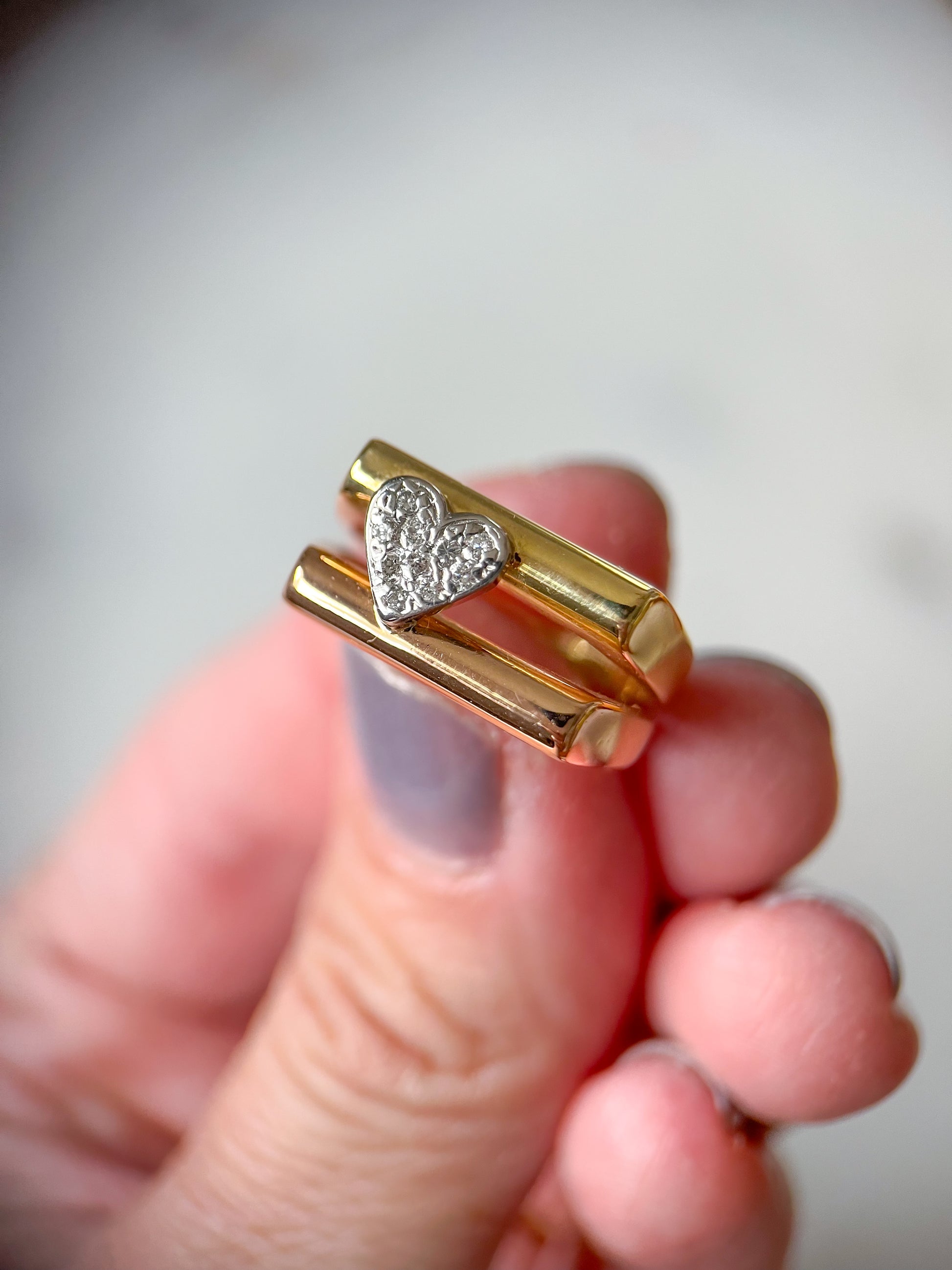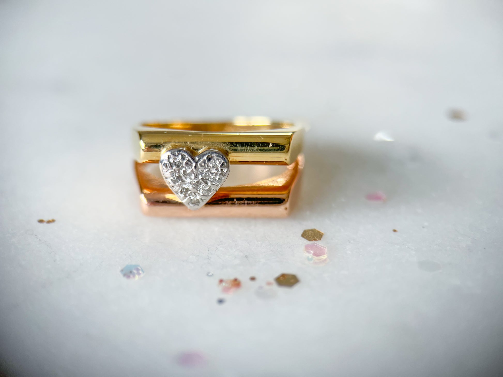 Vintage Double Bar Natural Diamond Heart Two Toned 14k Rose and Yellow Gold Ring