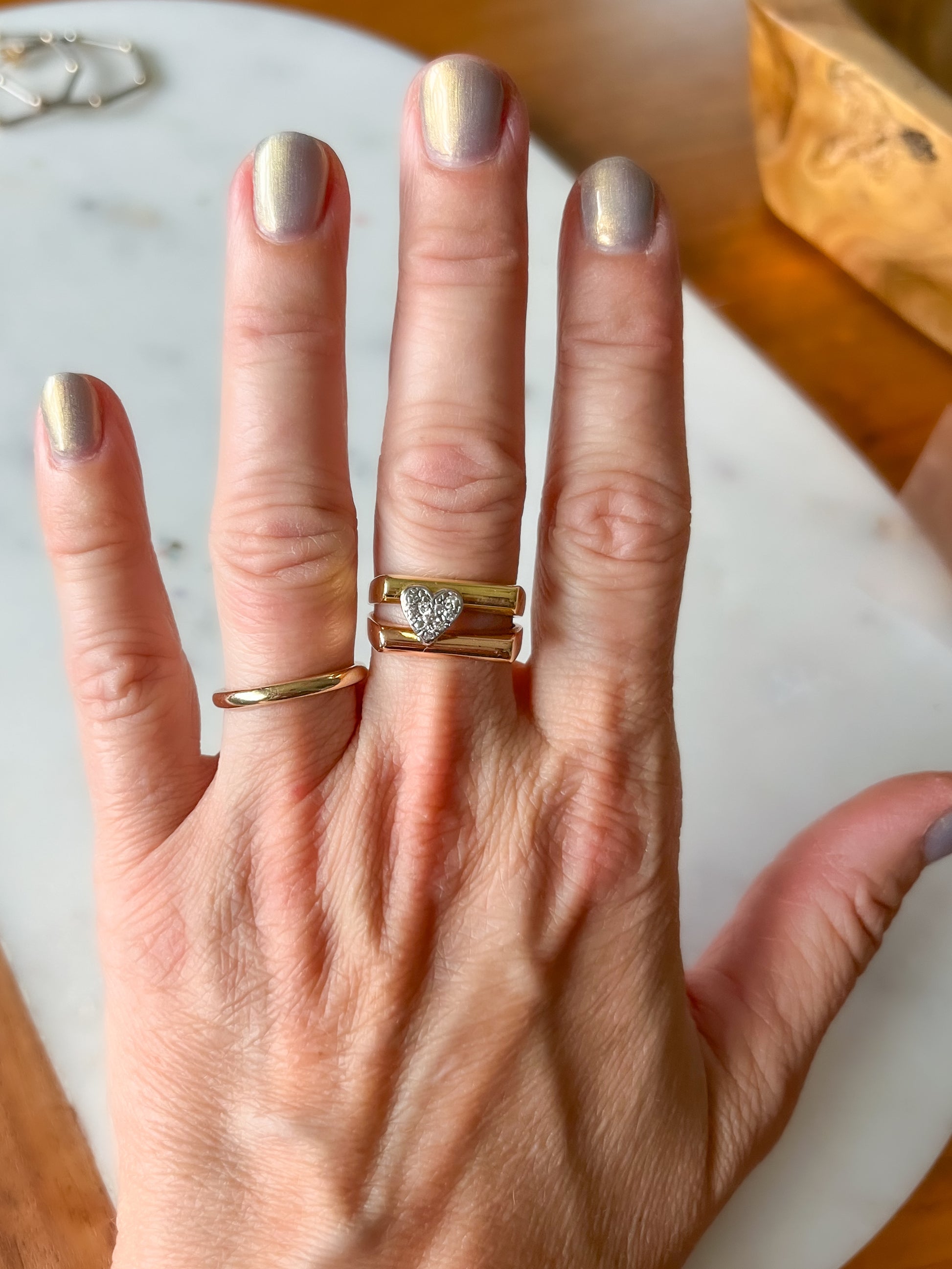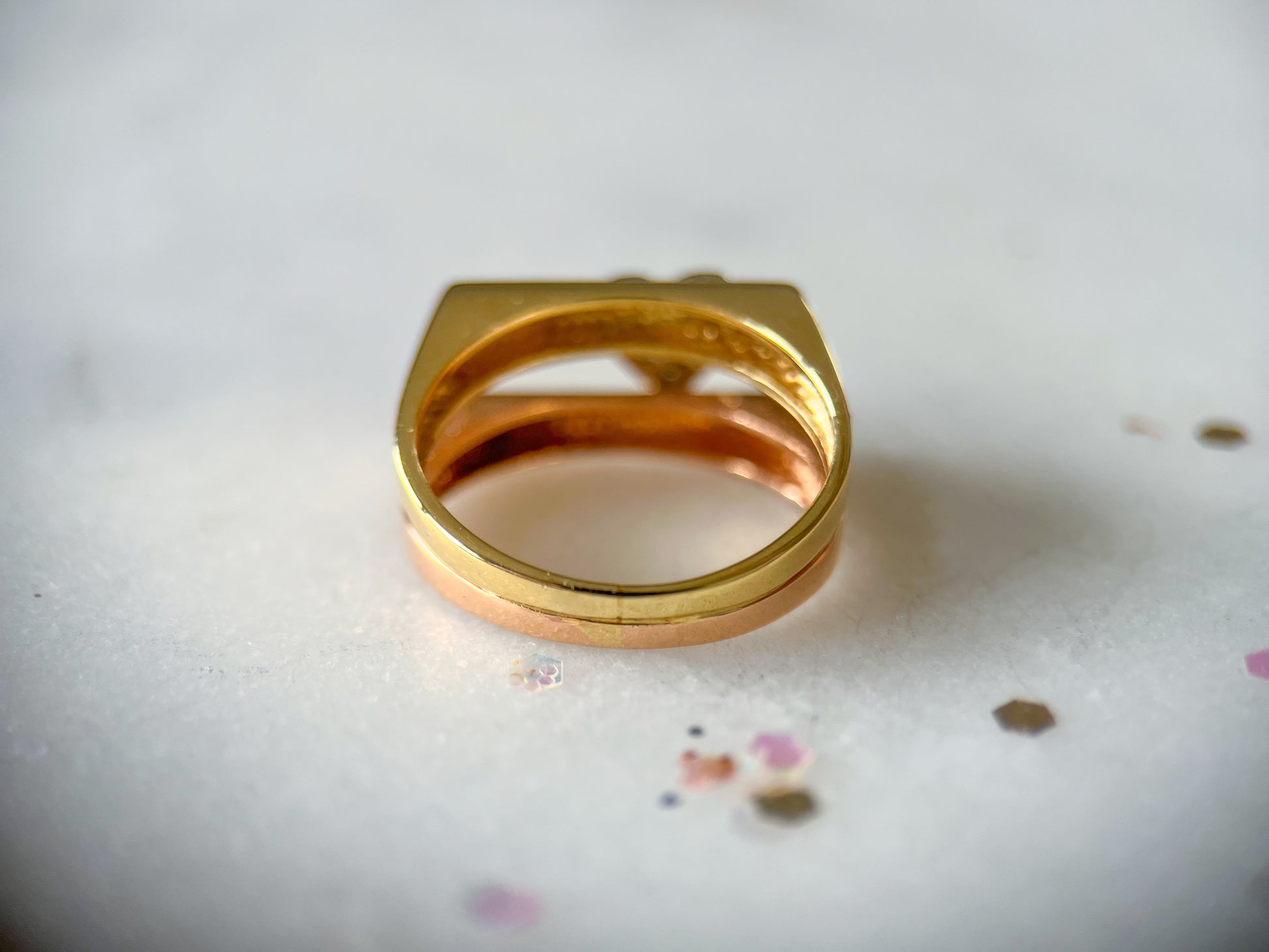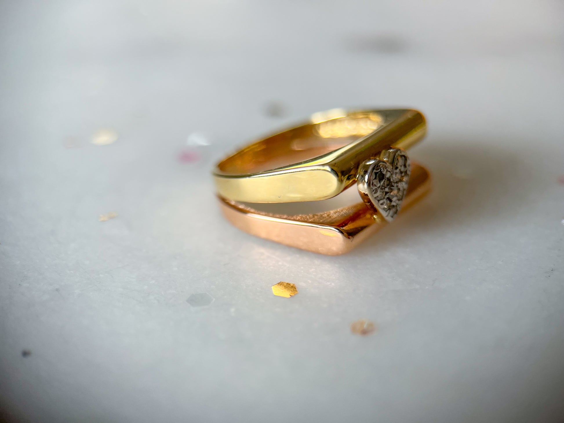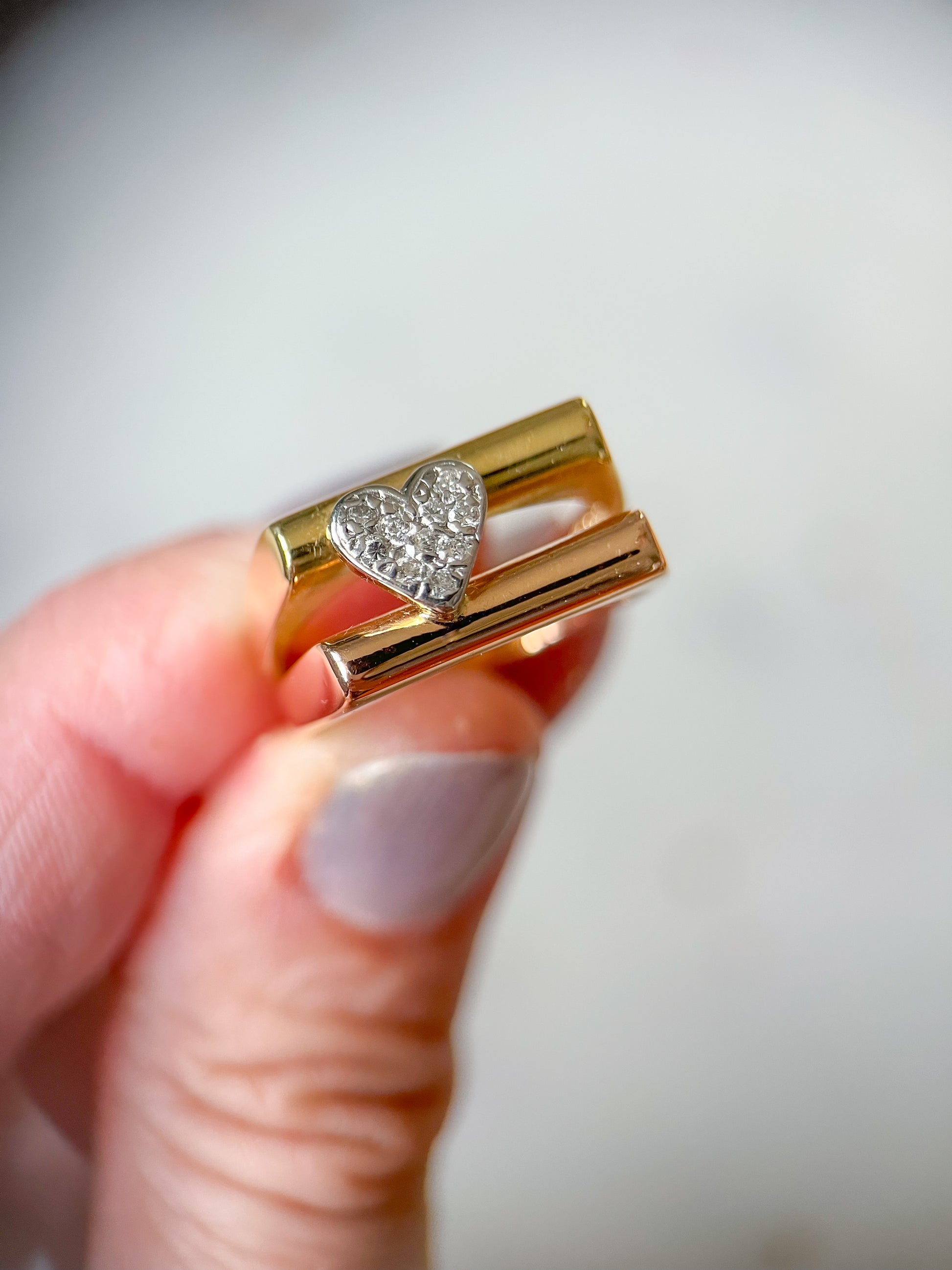Vintage Double Bar Natural Diamond Heart Two Toned 14k Rose and Yellow Gold Ring