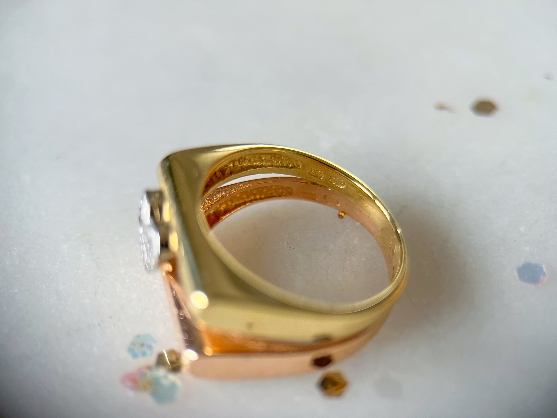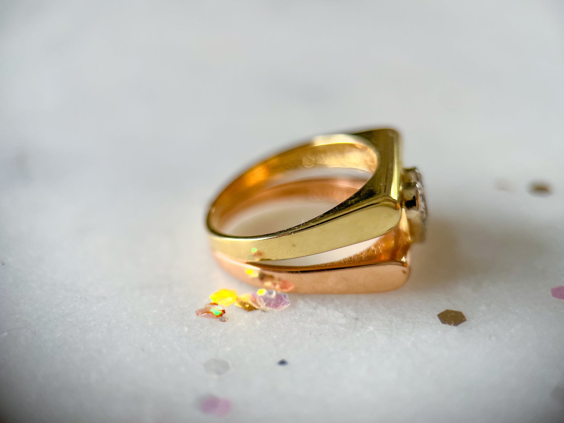 Vintage, 14k two toned rose gold and yellow gold ring with natural diamonds. This ring is a size 5 1/4 and boasts a beautiful heart made of small, round, natural diamonds, weighing approx. 0.10cttw. This ring weighs 3.77 g and is stunning! Can be resized at your local jeweler within reason.