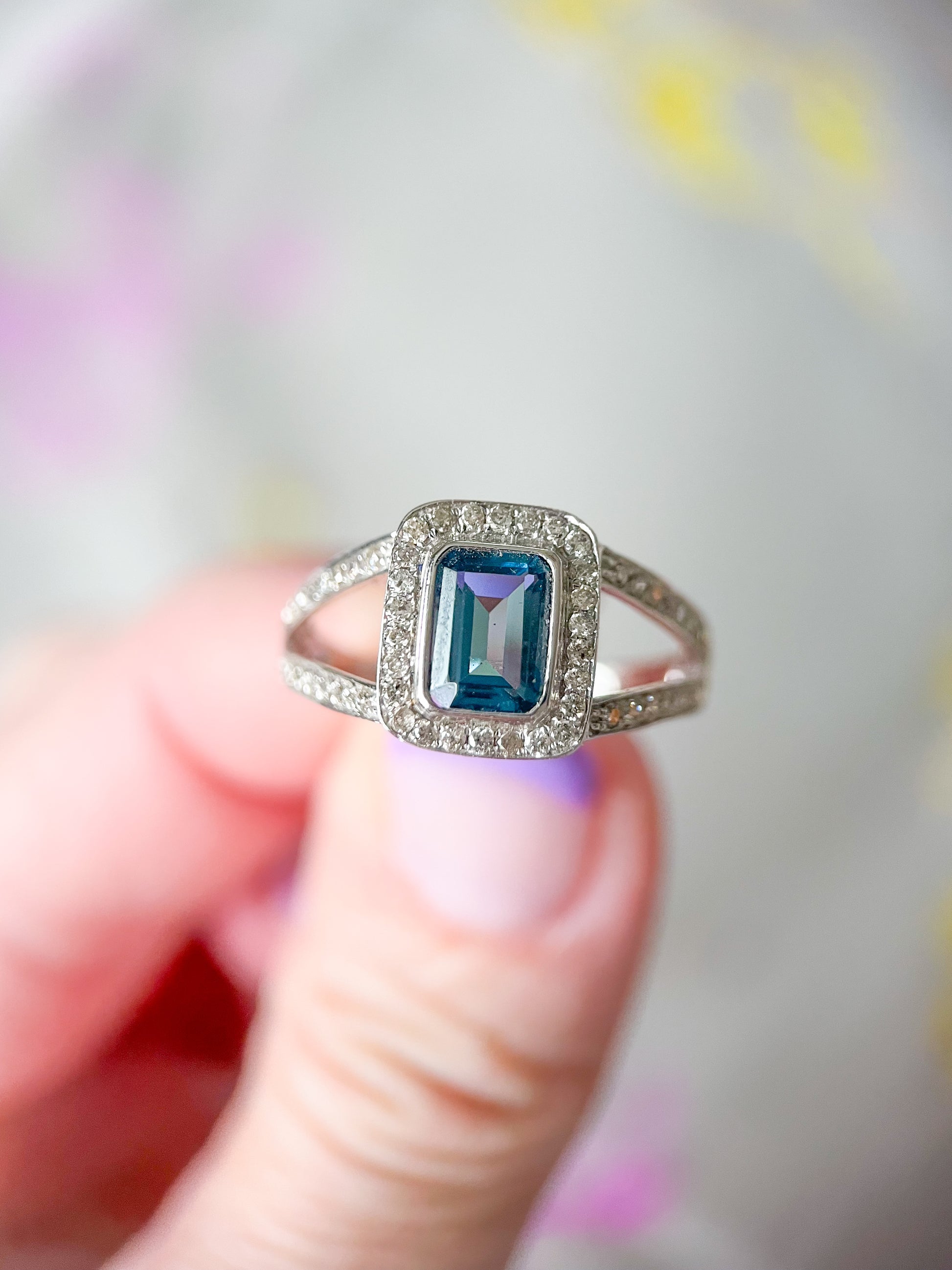 Vintage Emerald Topaz 14k White Gold Double Shank Ring