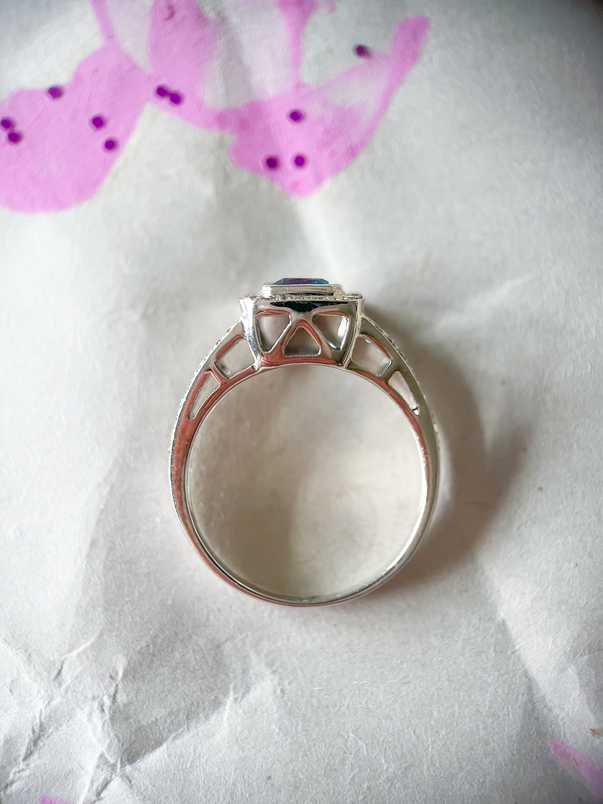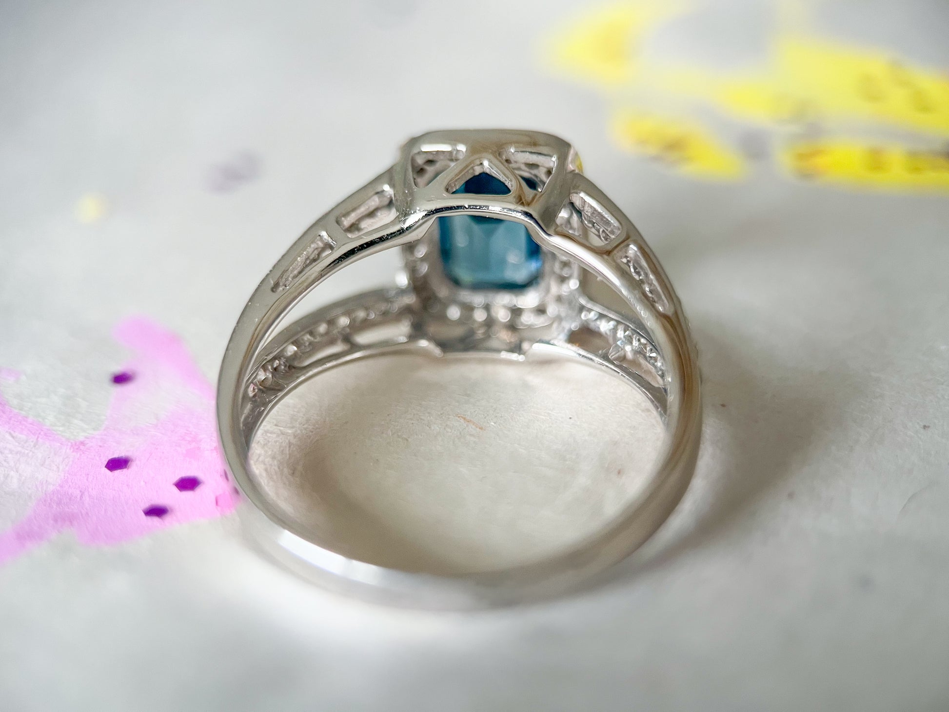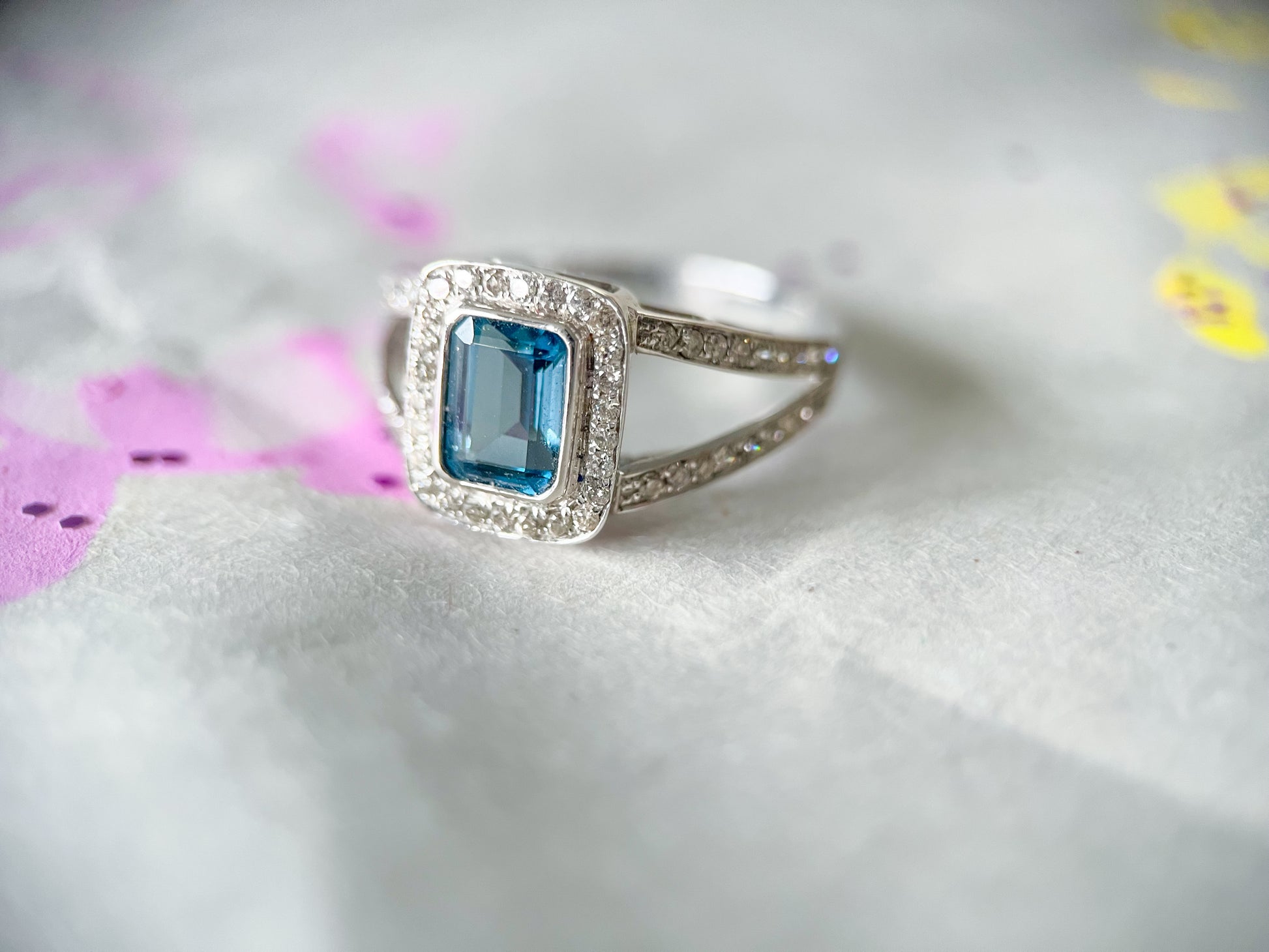 Beautiful emerald cut, natural topaz, set in 14k white gold, with natural diamonds. This ring is a size 7 1/2 and can be resized at your local jeweler.
