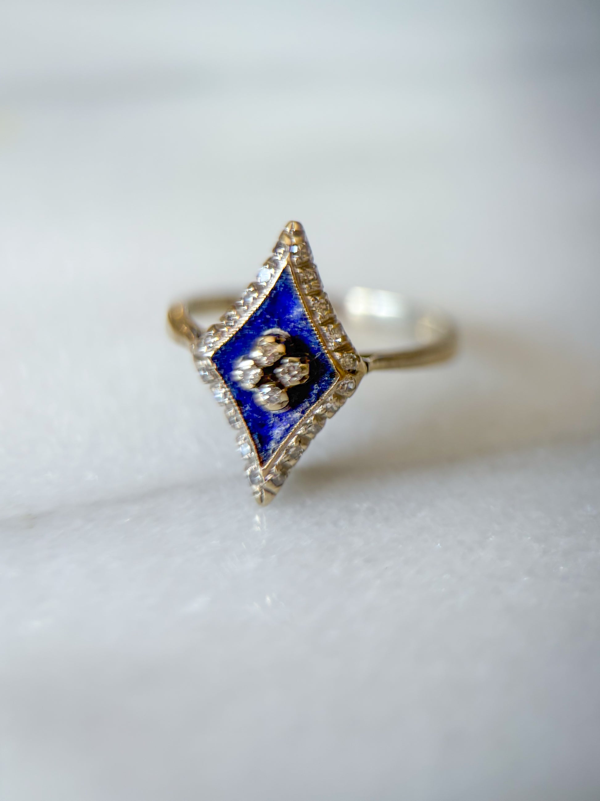 Really stunning, 10k white gold statement ring featuring blue enamel and natural diamonds. Ring is a size 6, able to be resized at your local jeweler.