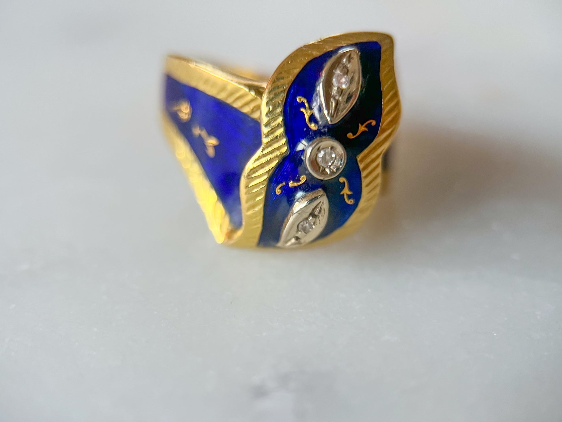 WOW. This vintage, 18k enamel ring is stunning! The ring has a beautiful ribbon design with dark blue enamel and 3 small diamonds. The edges of the ring have beautiful etching detail. Ring is a size 7.25, able to be resized at your local jeweler.