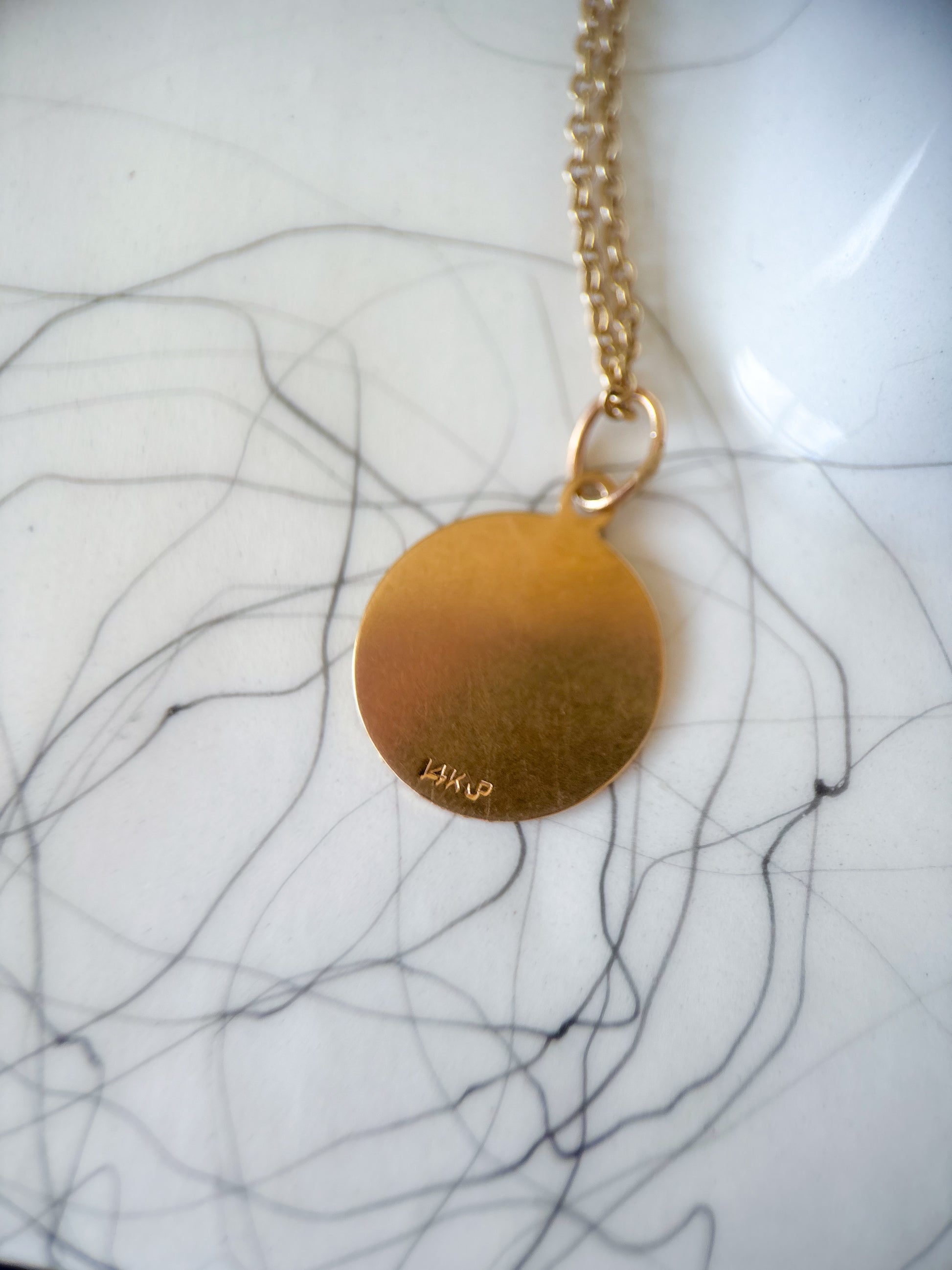 One of 14 charms that were removed from a charm bracelet. This vintage, 14k yellow gold circle engine turned charm is simply beautiful. No engraving on back. Chain not included.