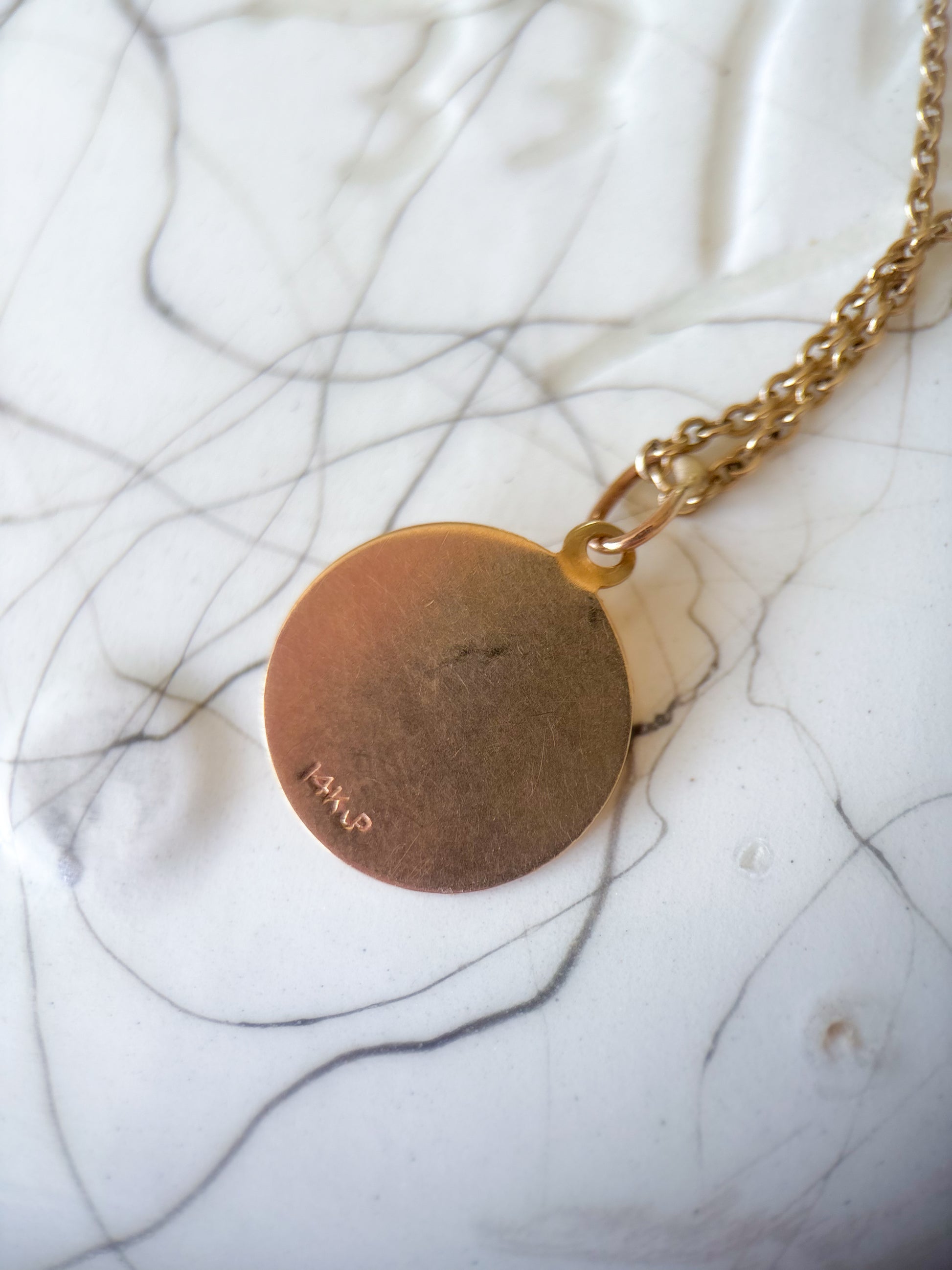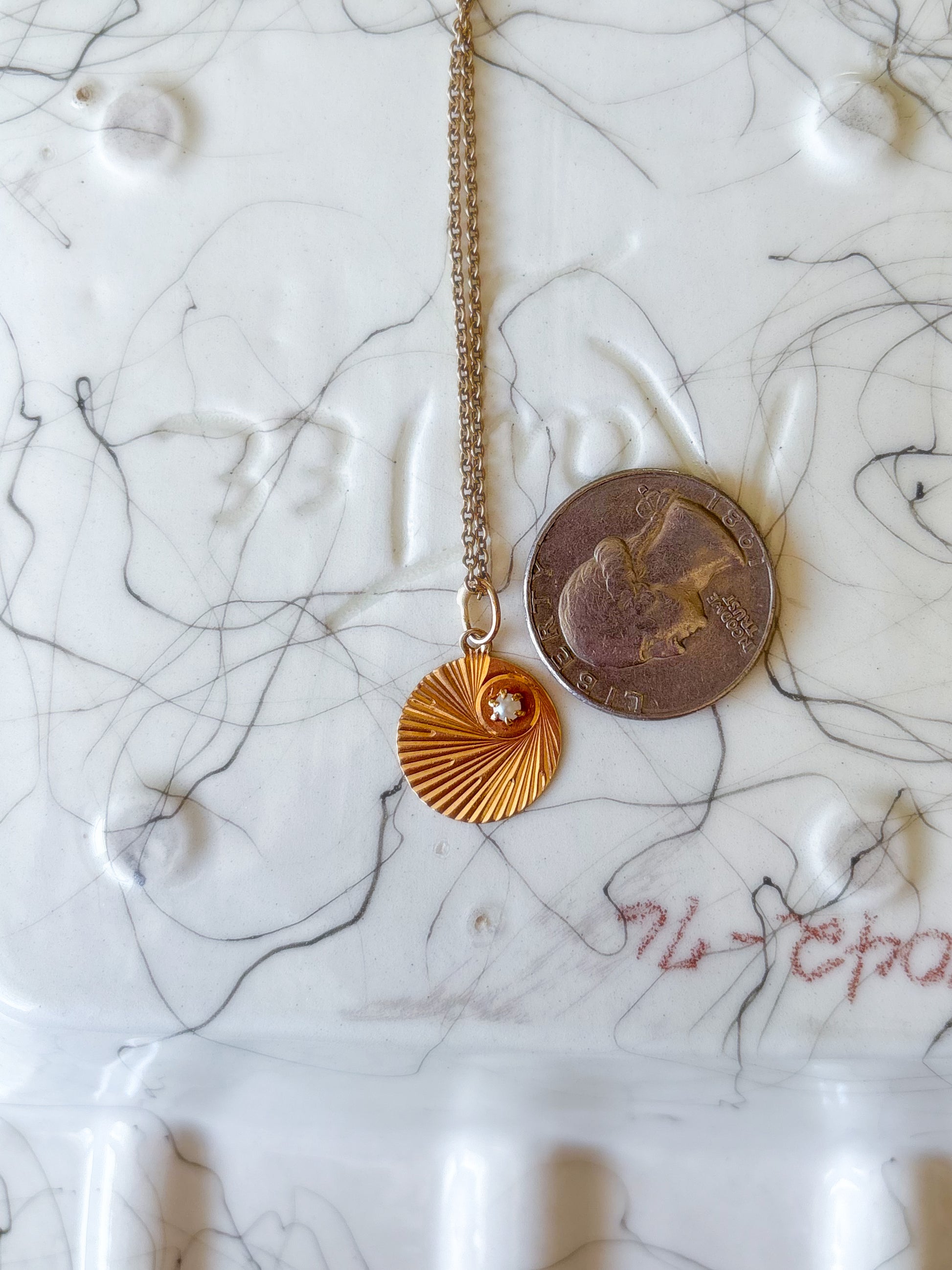 Vintage Engine Turned Circle 14k Yellow Gold Charm with Pearl