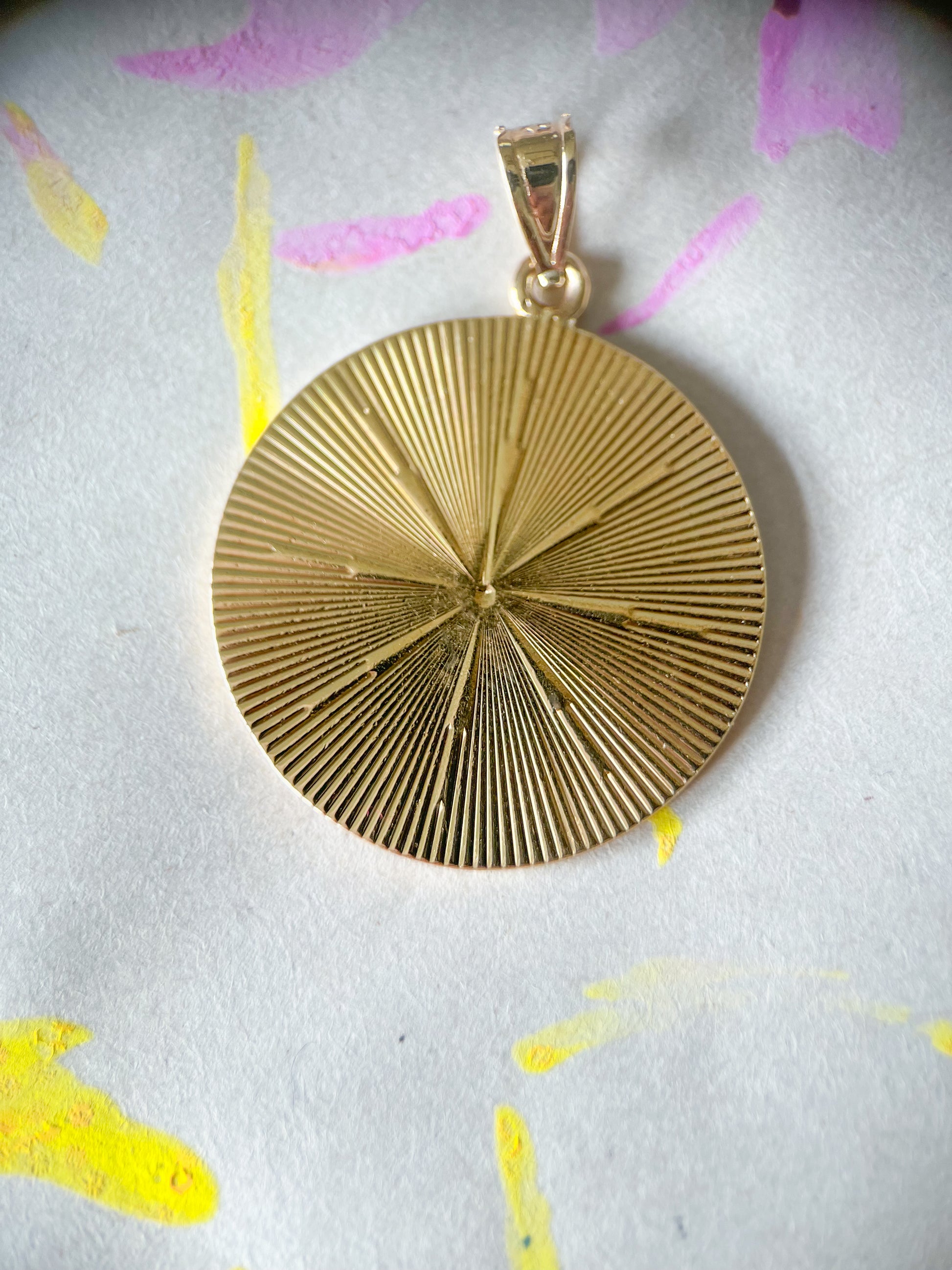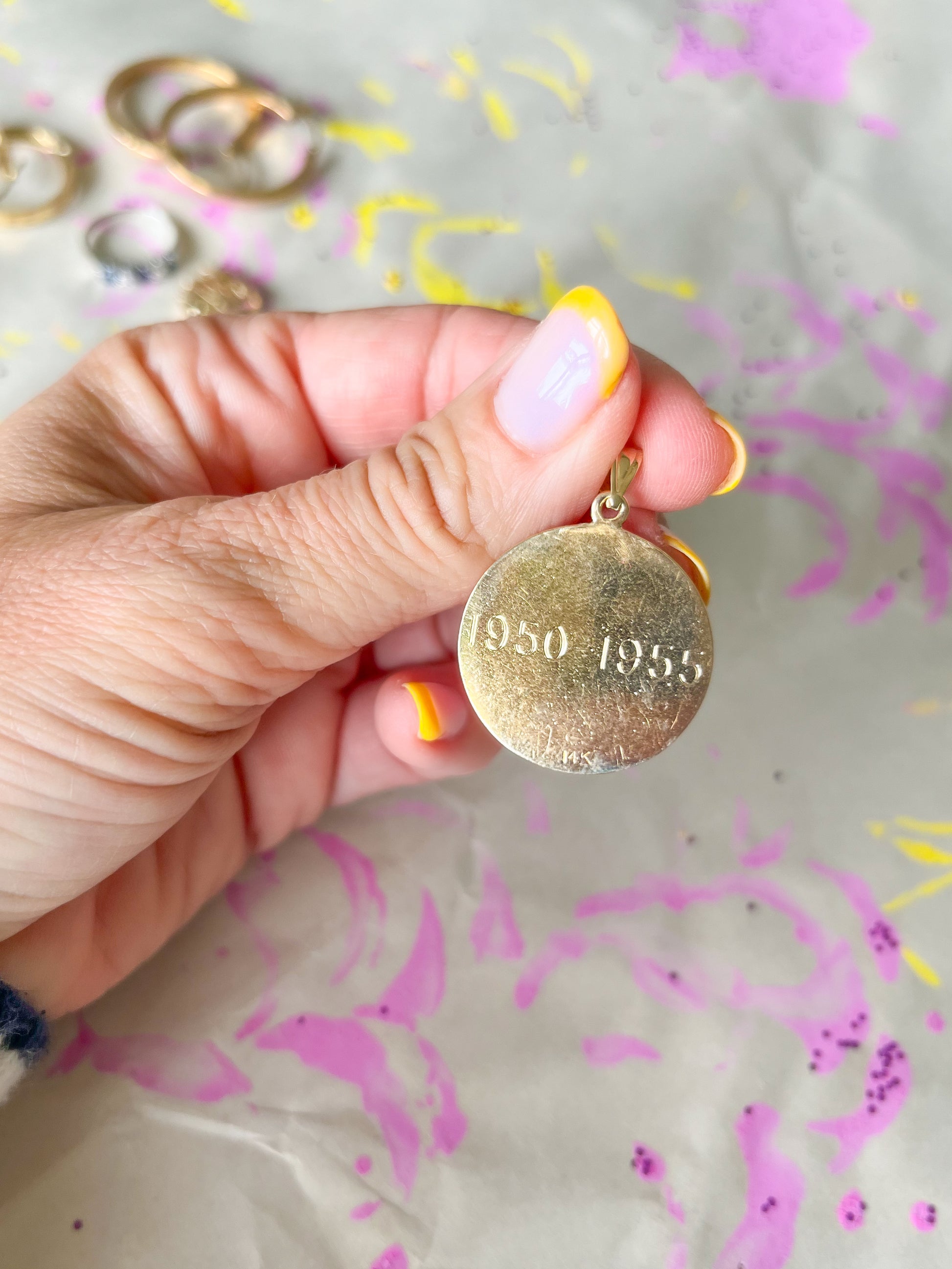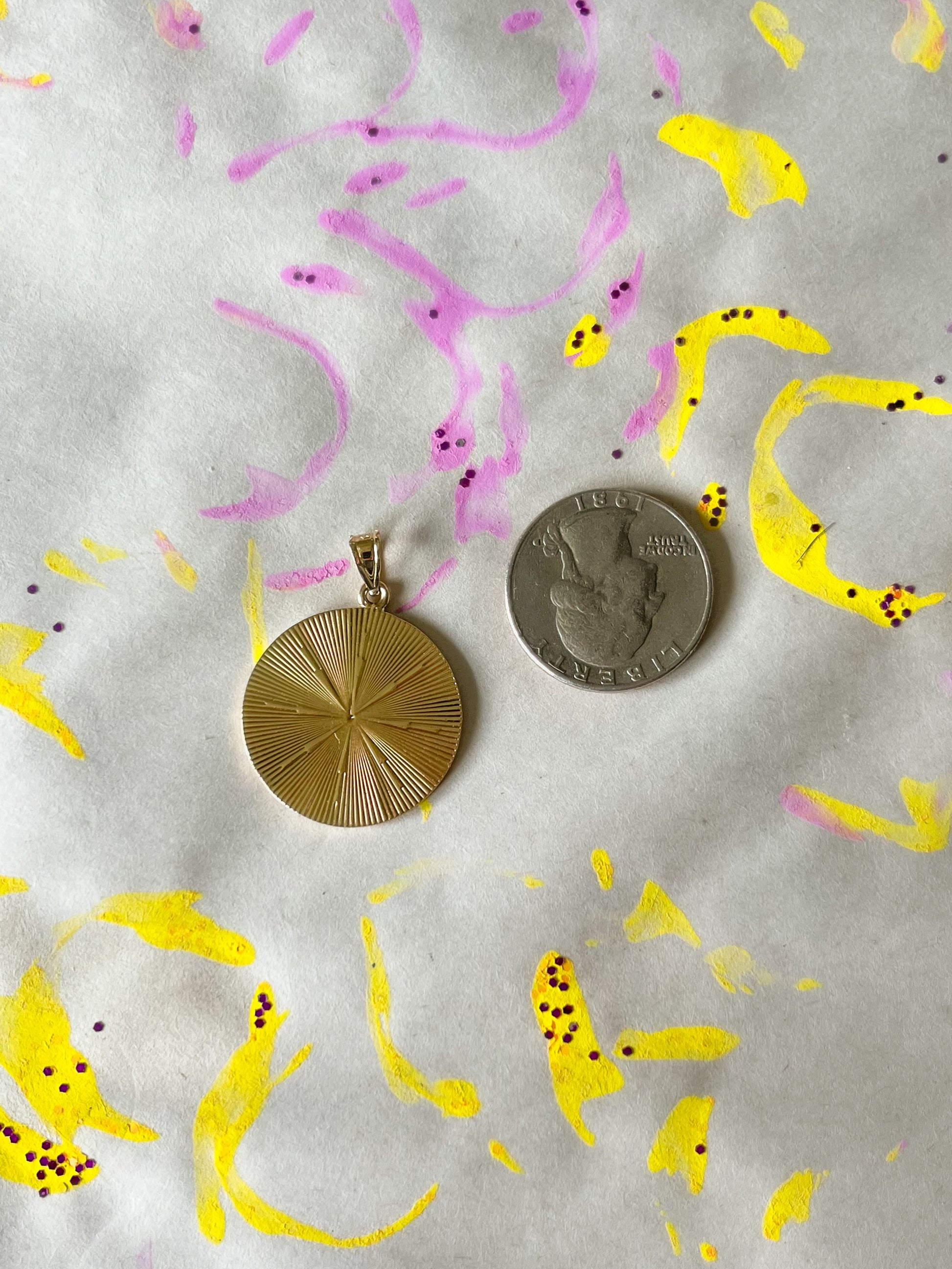 Absolutely insane, 14k yellow gold engine turned disk charm. Perfect as is, or great for engraving. The back currently is engraved with 1950-1955. Chain not included.