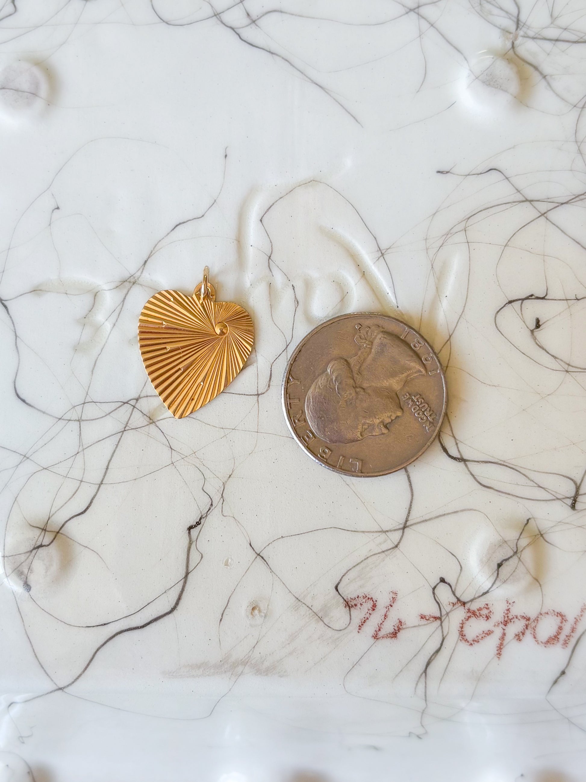One of 14 charms that were removed from a charm bracelet. This vintage, 14k yellow gold heart engine turned charm is simply beautiful. It is currently engraved with the following text: "I am the Lord thy God". Chain not included.