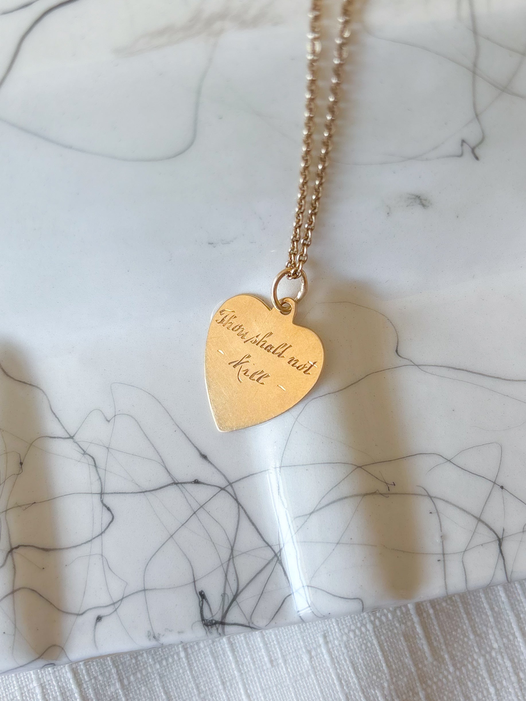 Vintage Engine Turned Heart 14k Yellow Gold Charm, Engraved: "Thou Shall Not Kill"