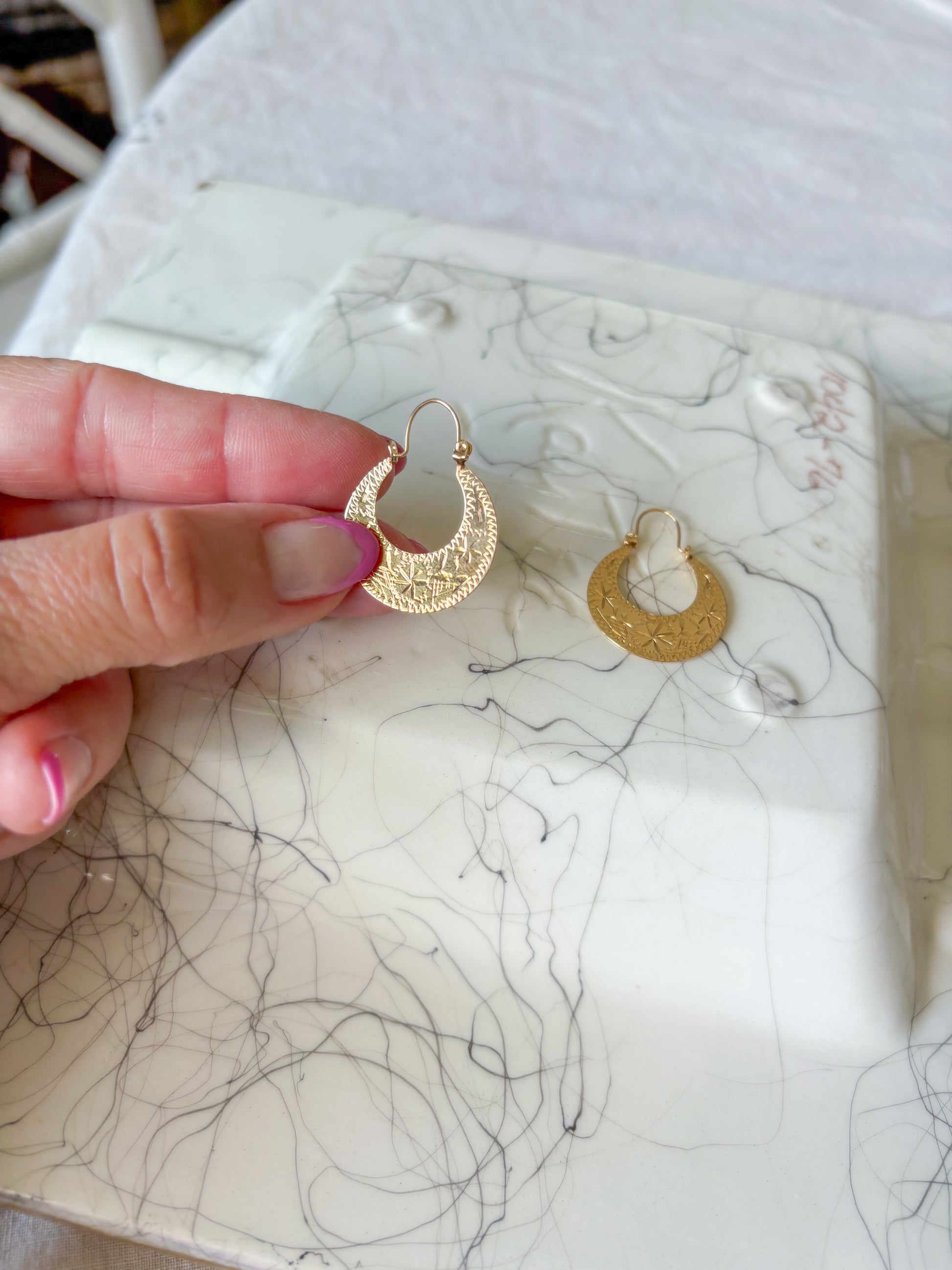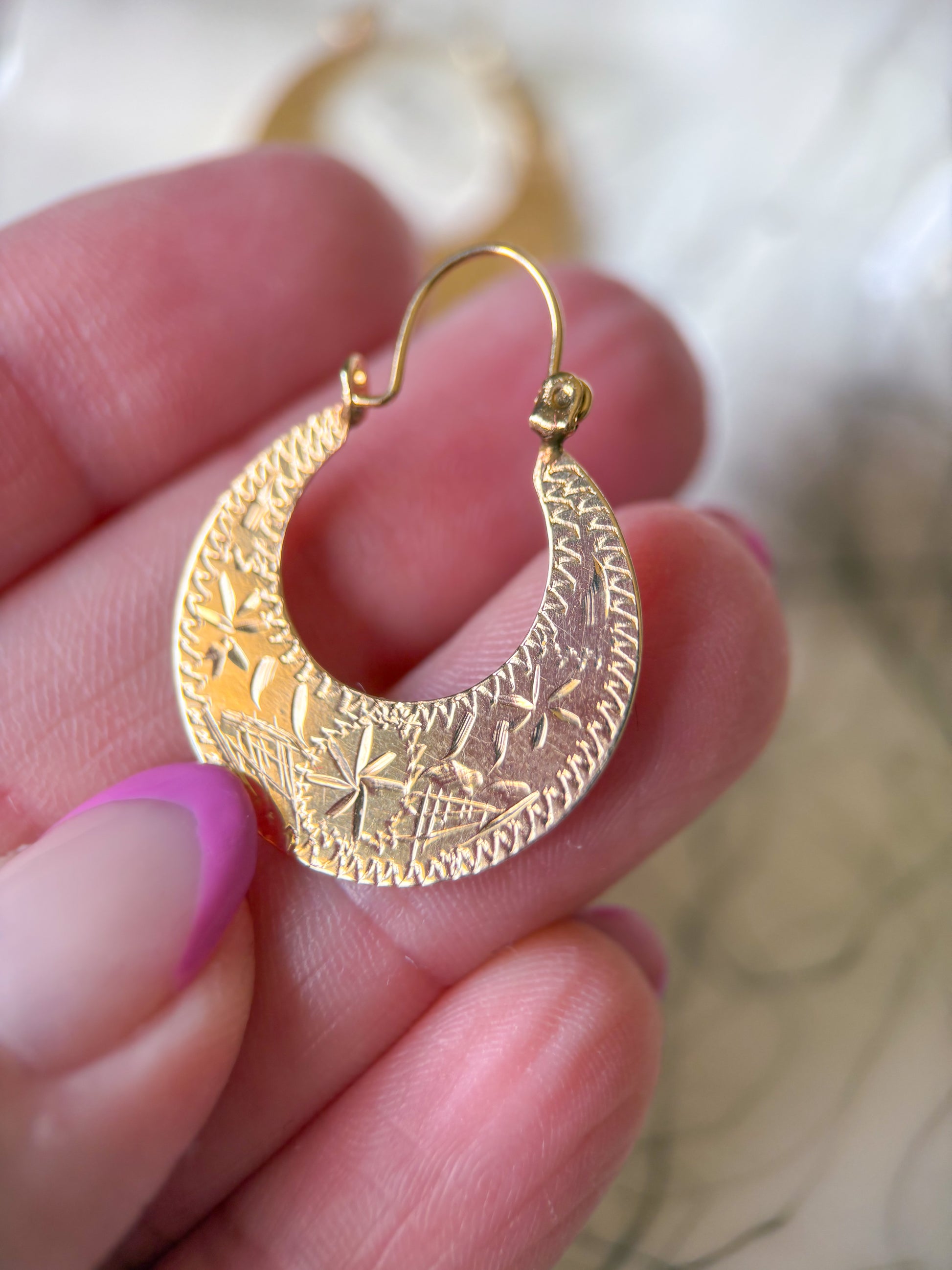 Simply in love! These vintage, 14k yellow gold, flat etched "bag" hoops are just awesome!!