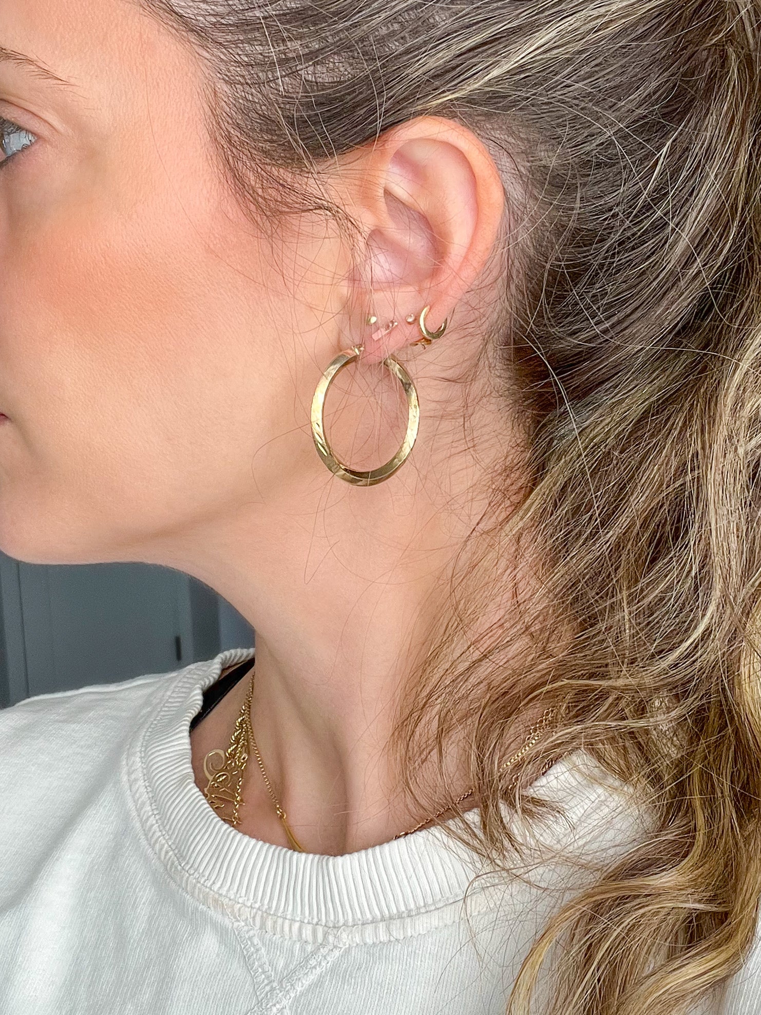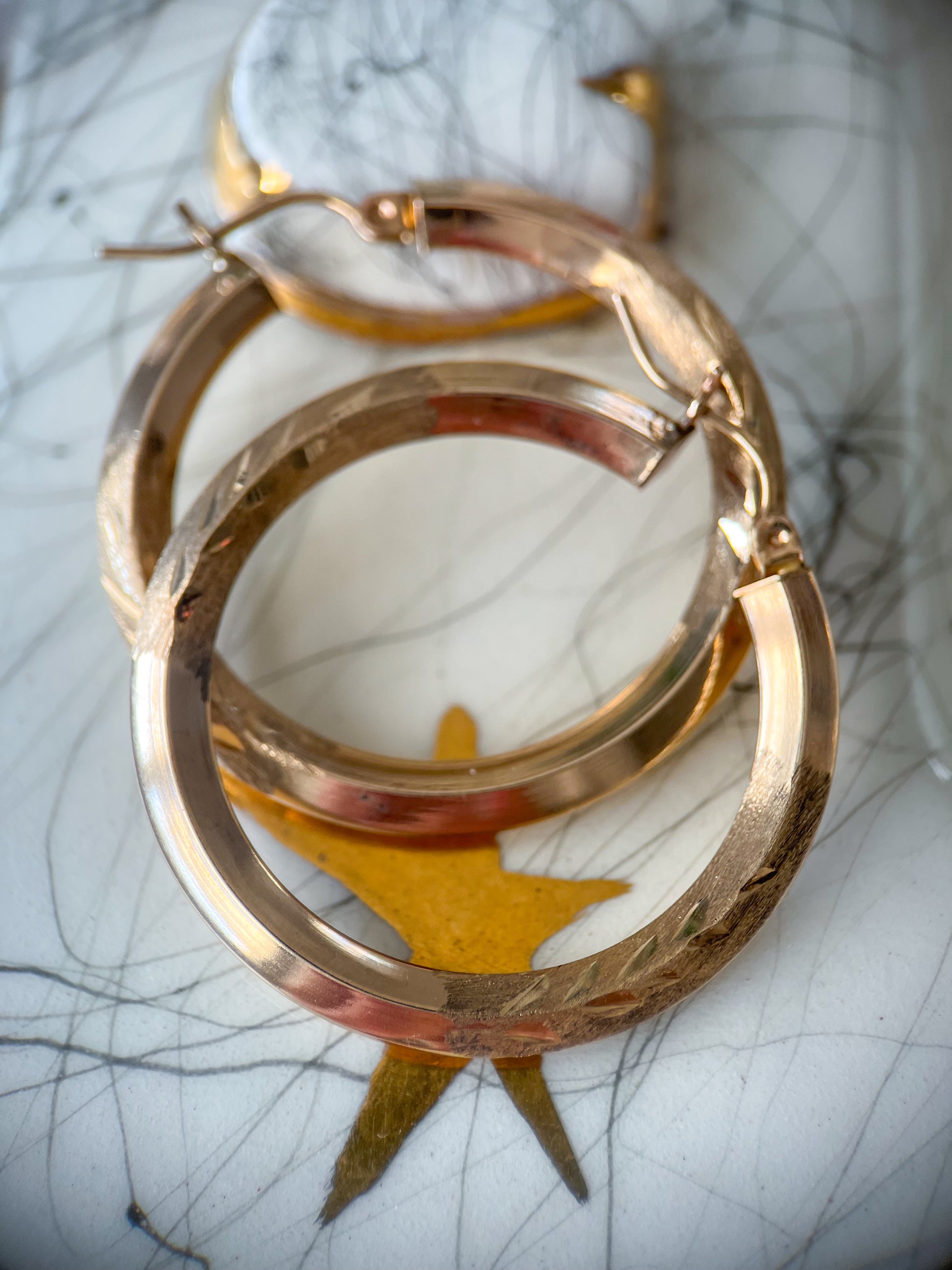 Vintage, 10k yellow gold, faceted tube hoops with floral etching design.