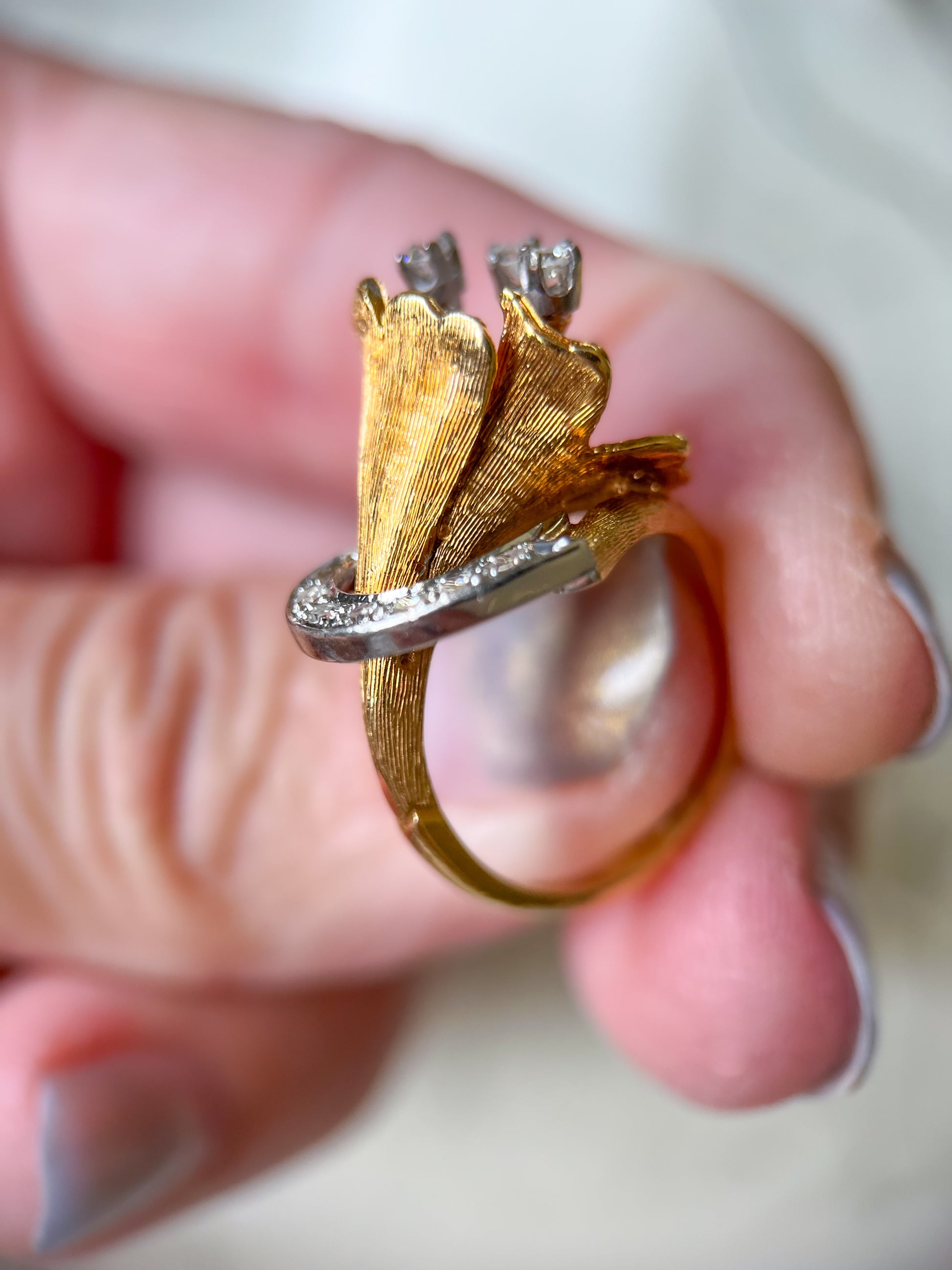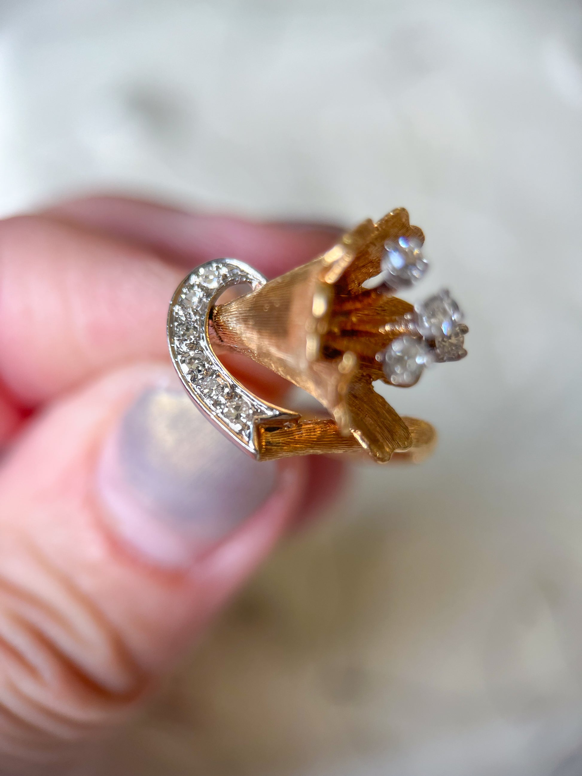 Beautiful, vintage, abstract, half heart and flower design in 18k yellow gold and natural round diamonds. This ring is truly stunning and so unique. It weighs 6.00 grams and is a size 3 1/2. It is able to be resized at your local jeweler.