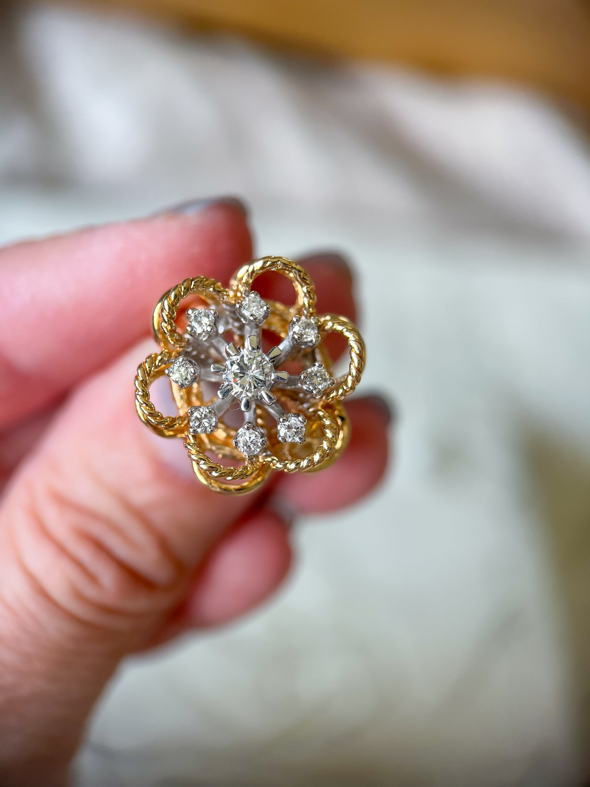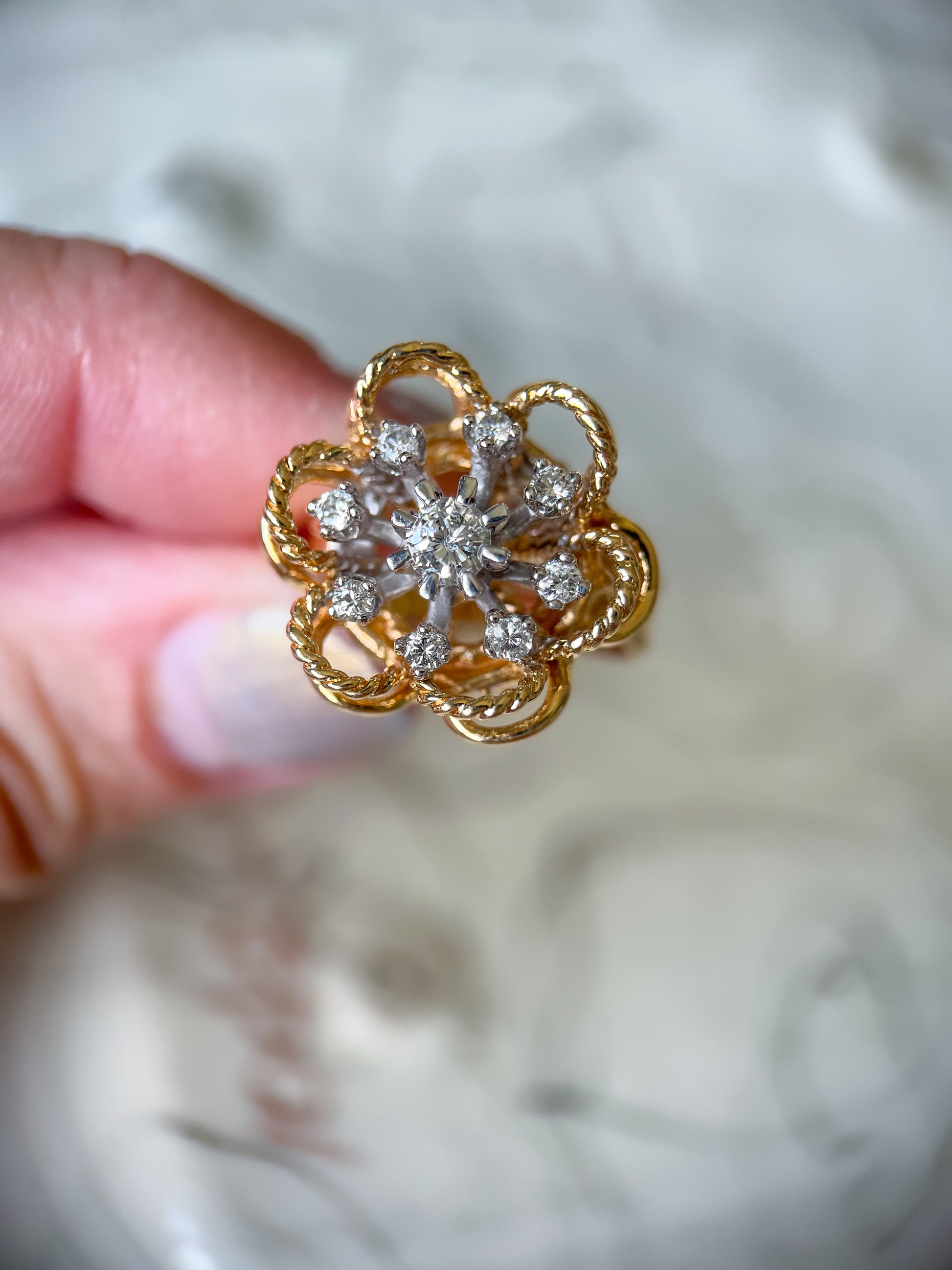 Beautiful, vintage ring featuring open design of 14k yellow gold and round, natural diamonds. This ring is most likely from the 1960s. We love the delicate but large flower, on a nice, thick band. This ring weighs 7.68 grams and is a size 6 1/2. It is able to be resized at your local jeweler.