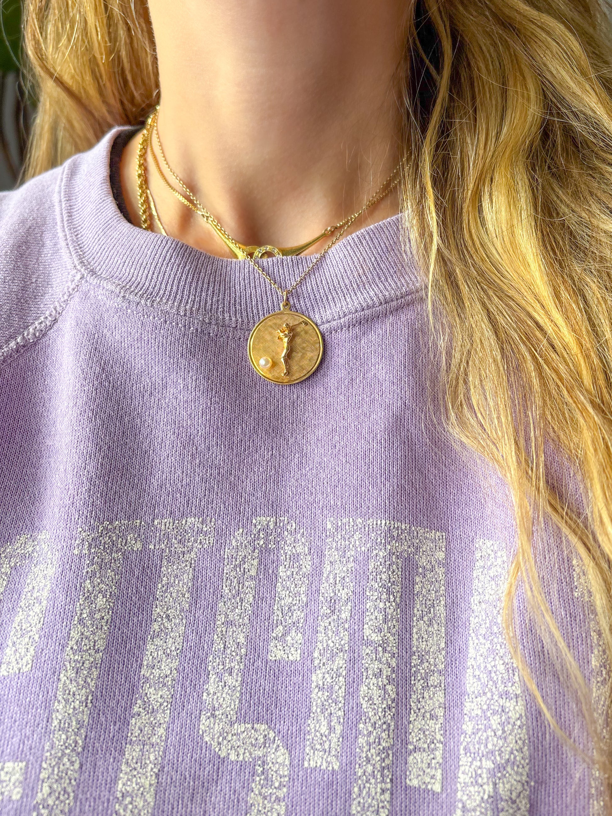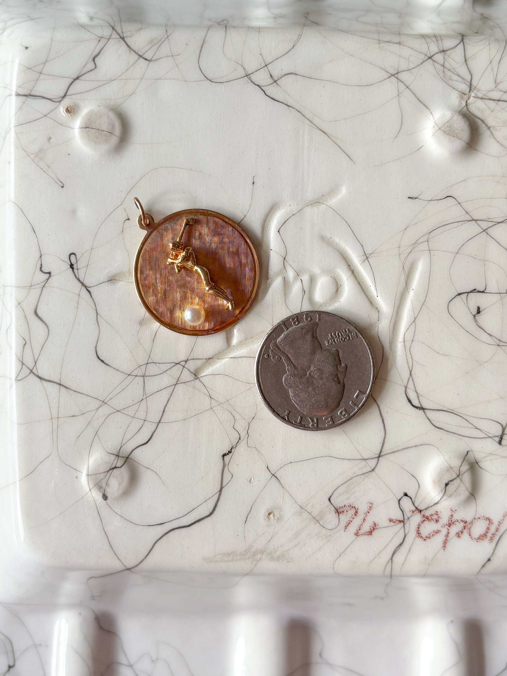 Obsessed with this vintage, 14k yellow gold disk charm featuring a golfer and natural pearl! Chain not included.