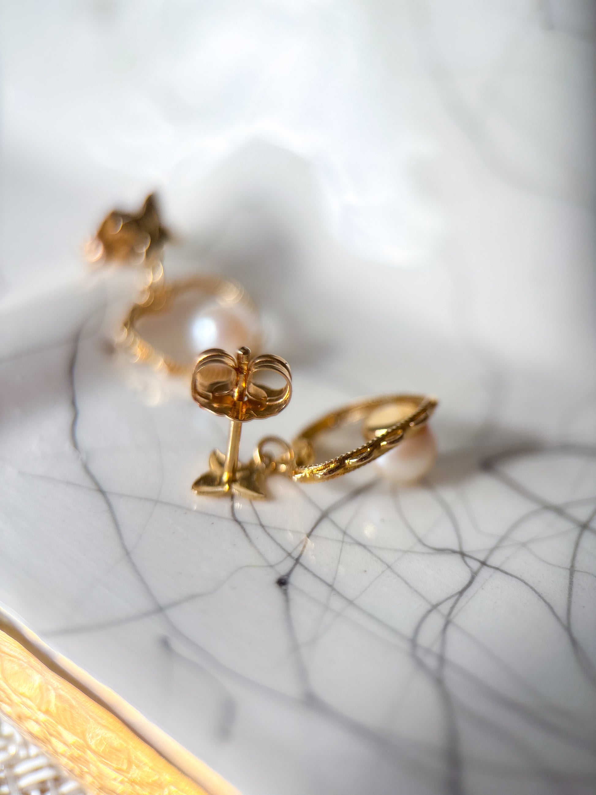 Really beautiful, simple, vintage, 14k yellow gold pearl and heart drop earrings.