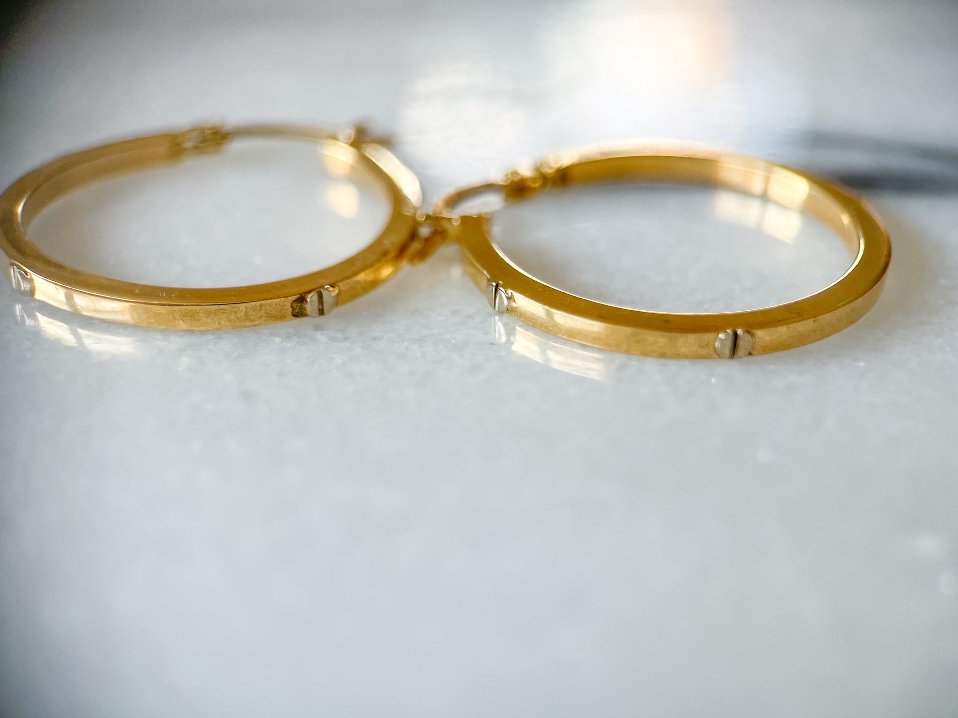 Everyone loves this 'cartier' style screw head design! These hoops are made of 10k white and yellow gold. These hoops are NOT Cartier, but have the beautiful, same screw head accents. They are thin, and large and stunning!