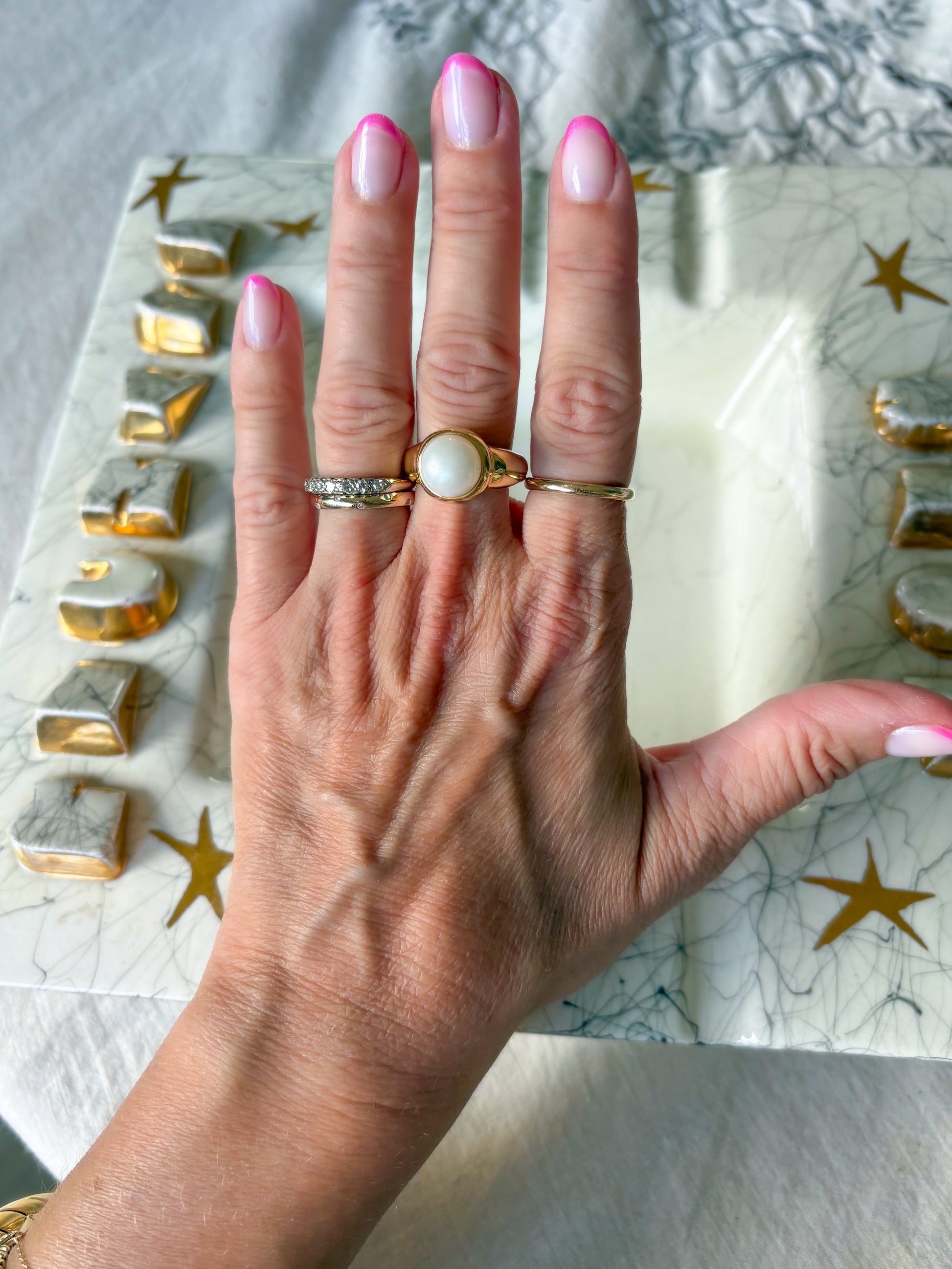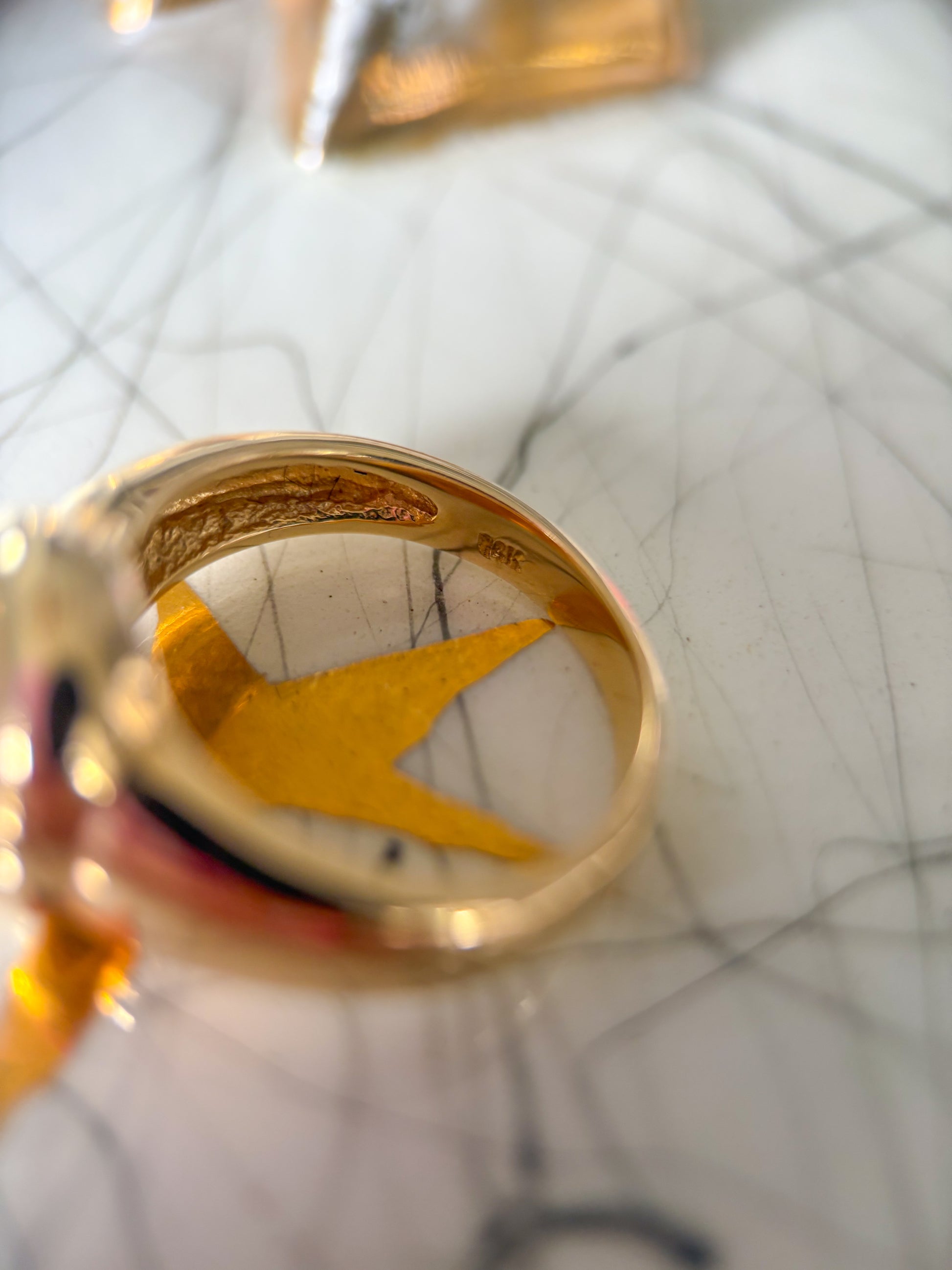 WOW! What a show stopper this one is! Check out this stunning, 14k yellow gold and pearl vintage ring! It is a size 7 1/4 and can be resized at your local jeweler.
