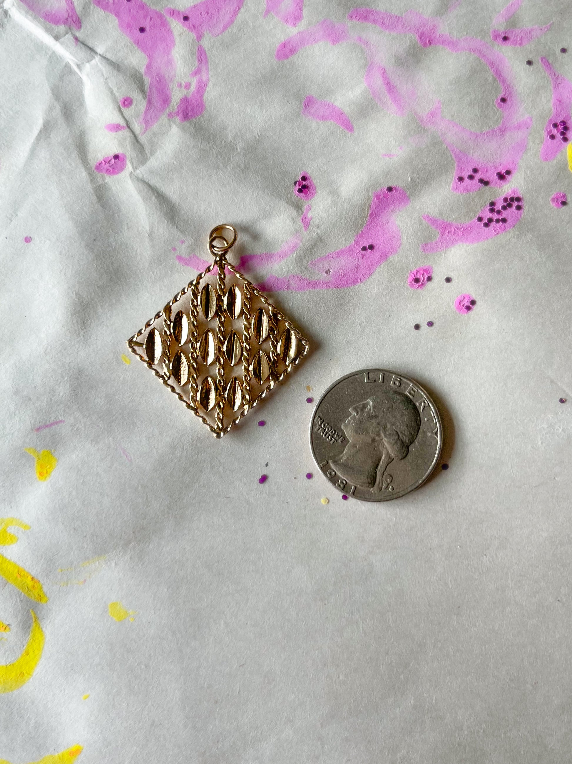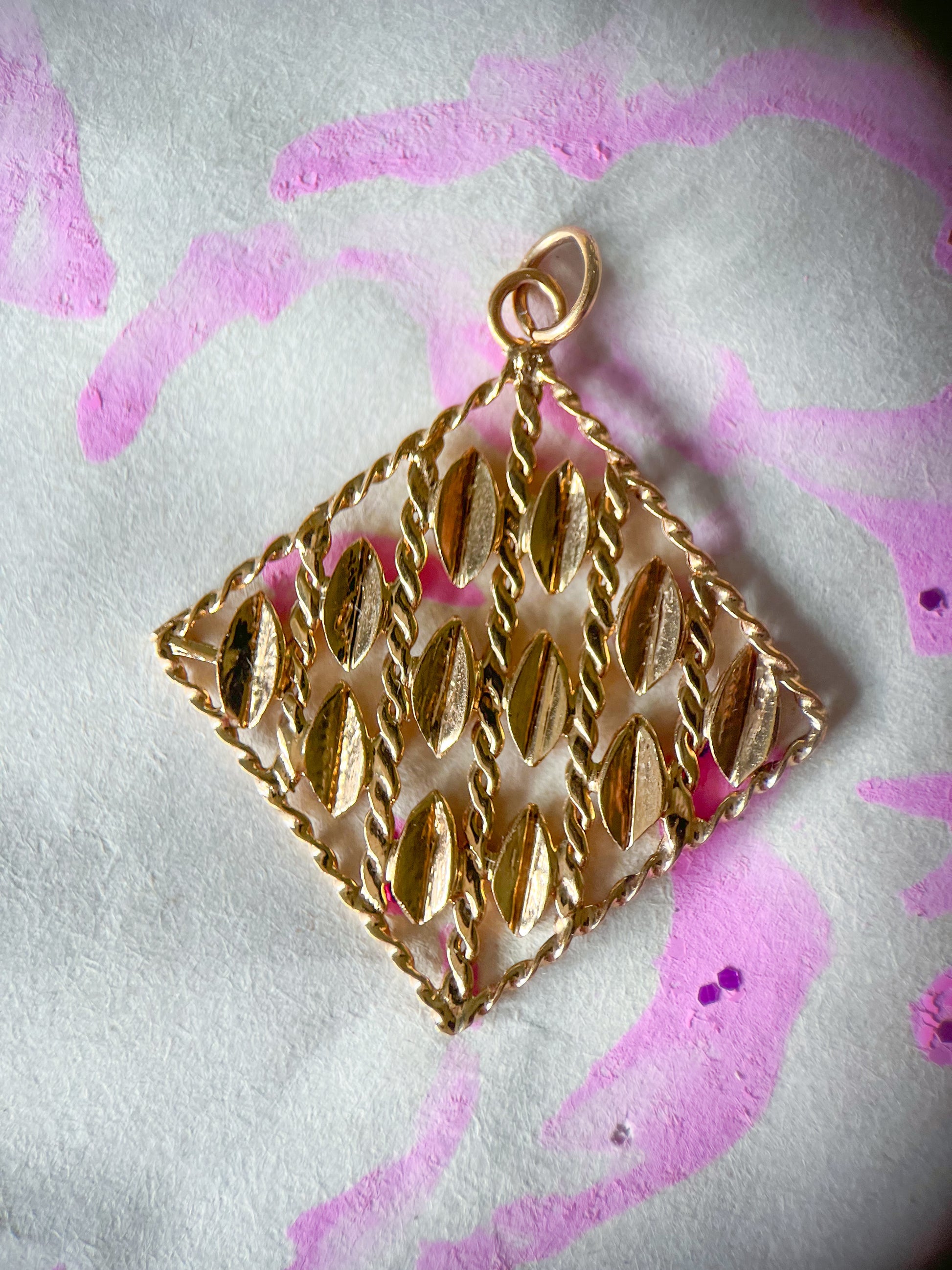 Large, 10k yellow gold, vintage, open square with vertical rope chain detailing. Chain not included.