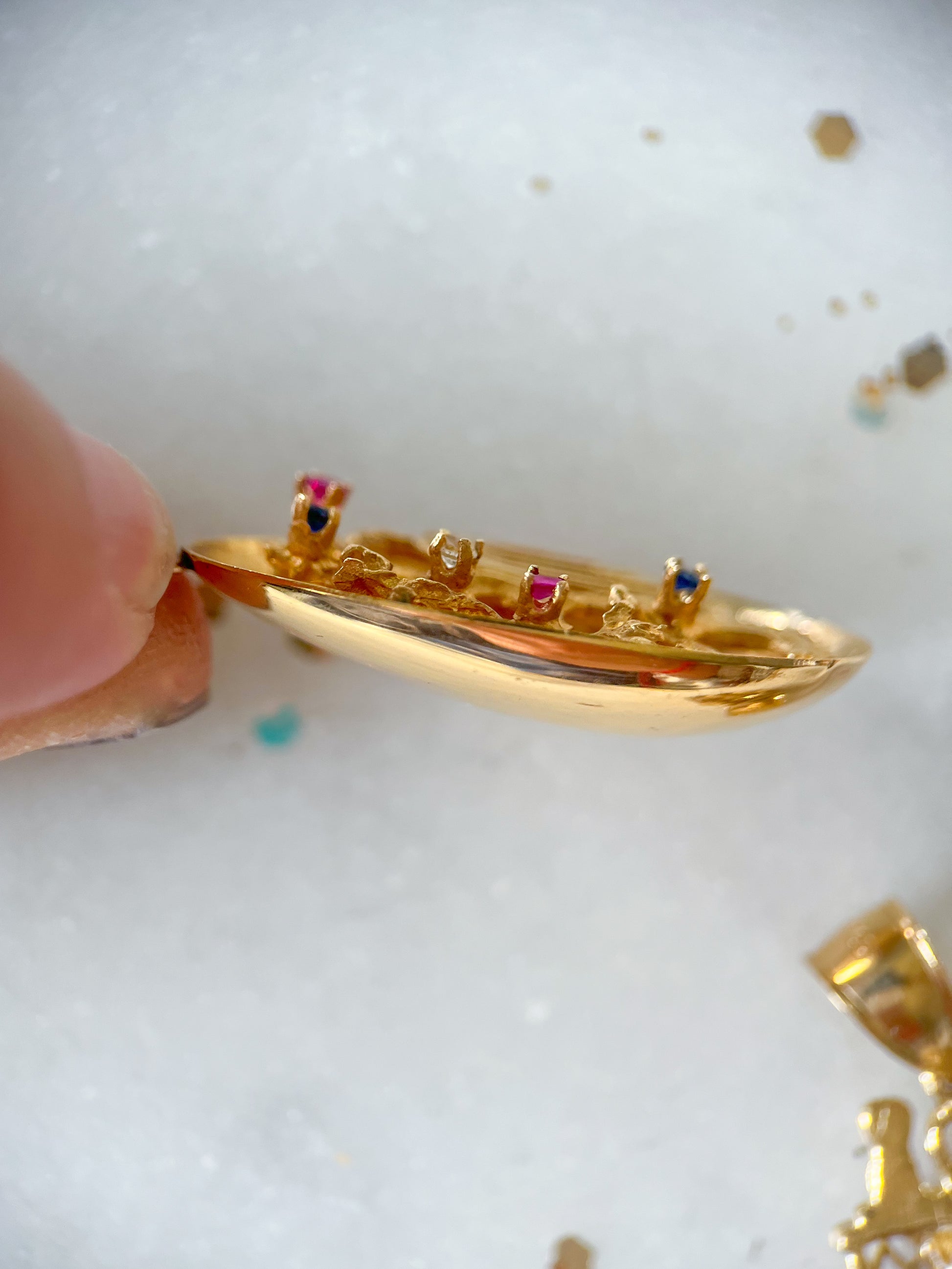One beautiful, vintage, large, tree of life 14k yellow gold charm - featuring stones that are not natural diamonds, rubies and sapphires. Chain not included.