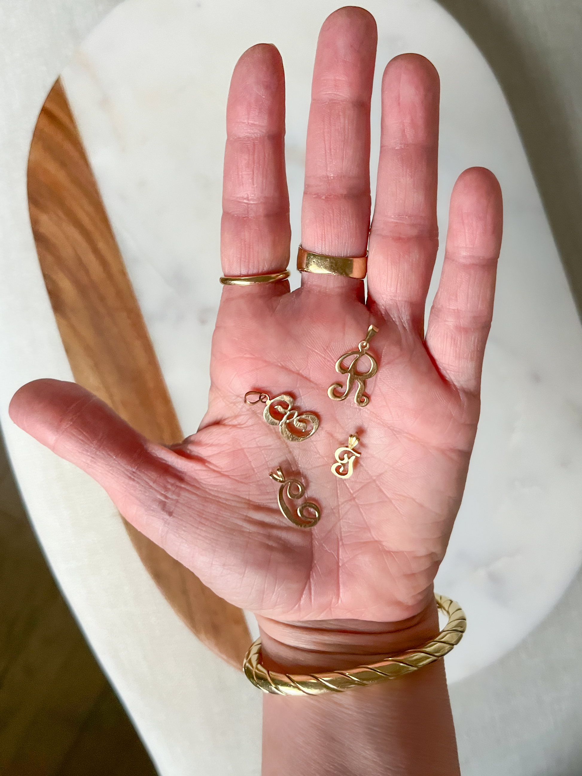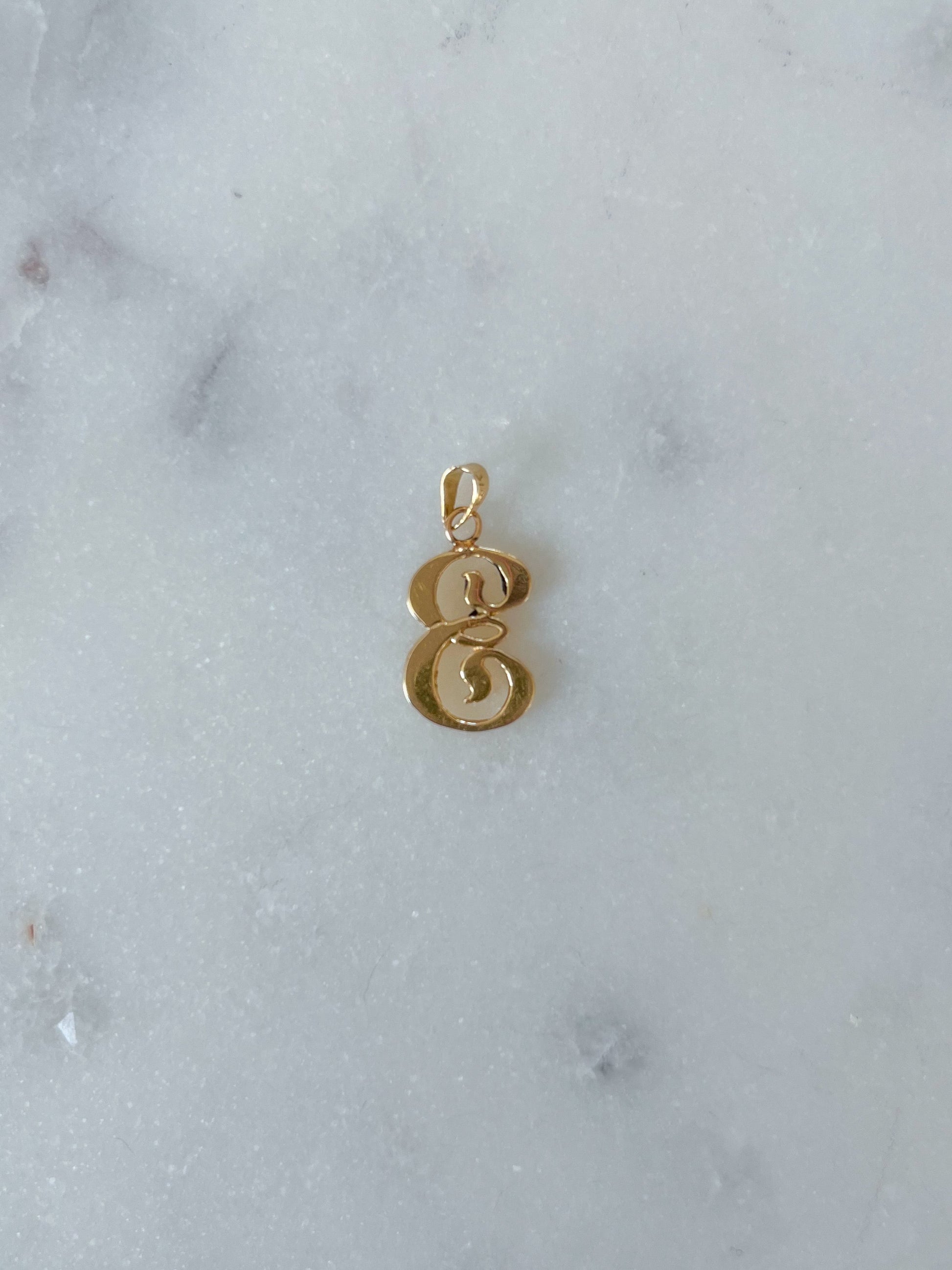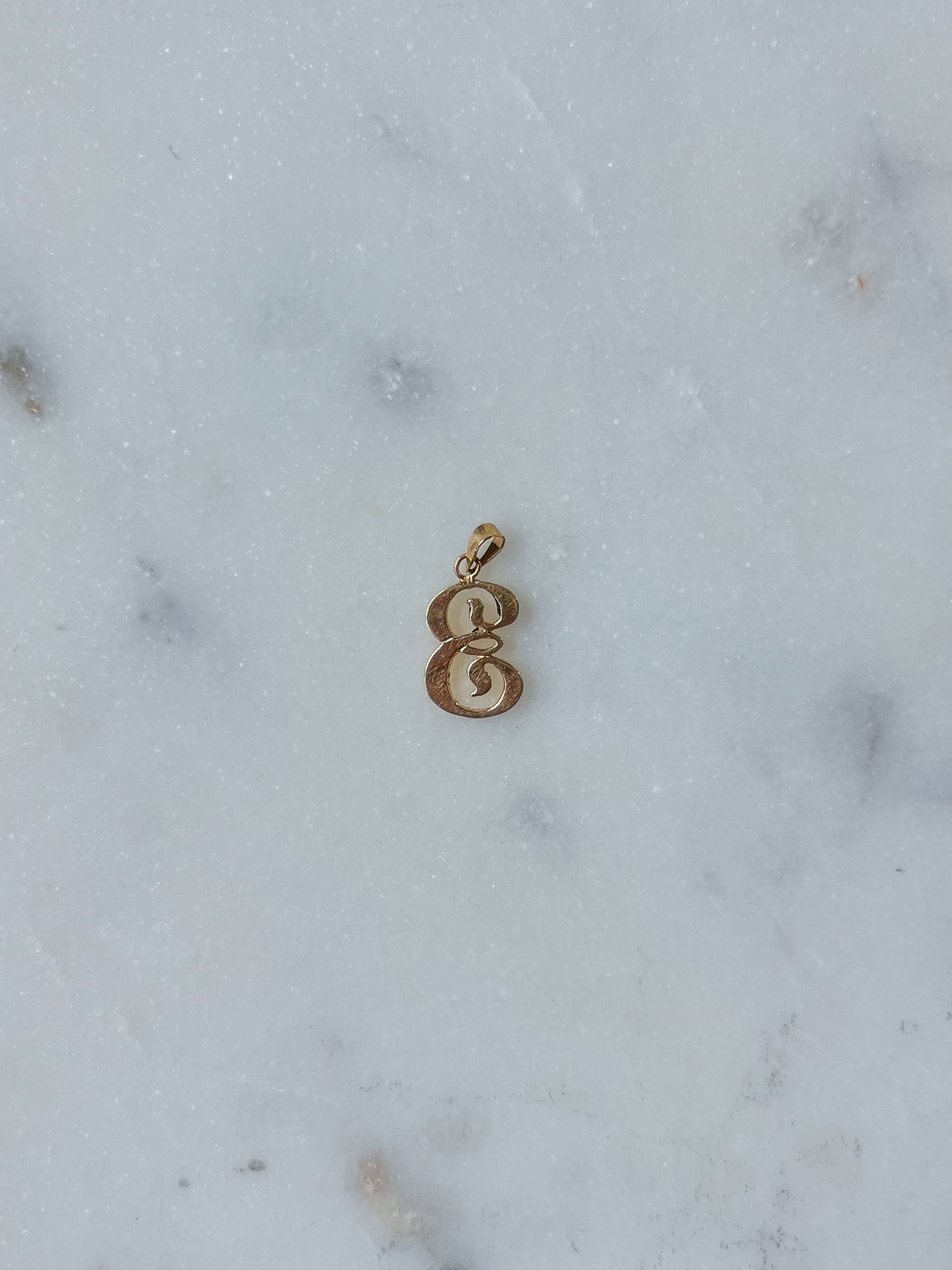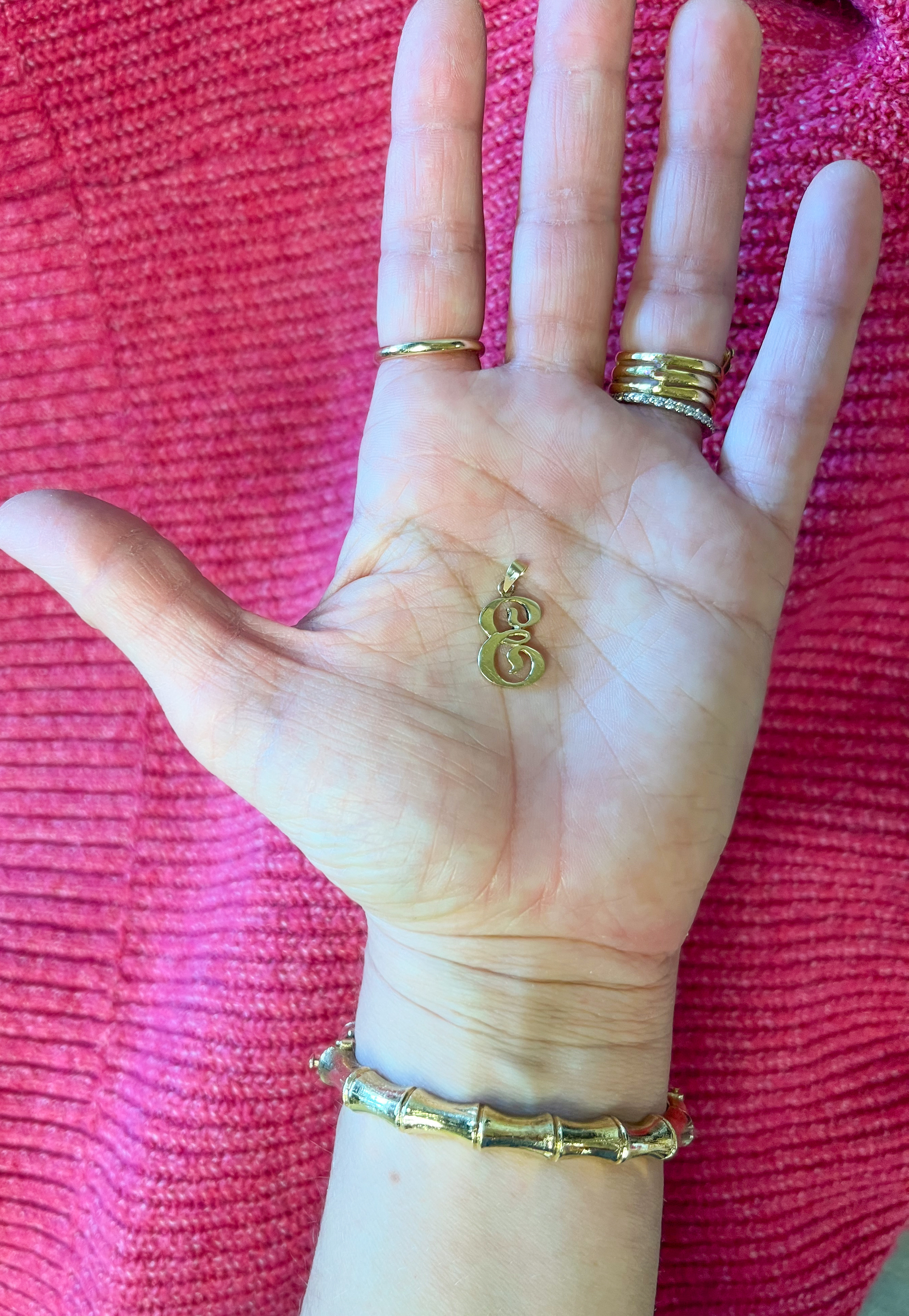 Vintage 14k yellow gold script "E". This large "E" was originally a stick pin that we transformed into a hefty charm. It's quite thick and bold and we love it. Chain not included.