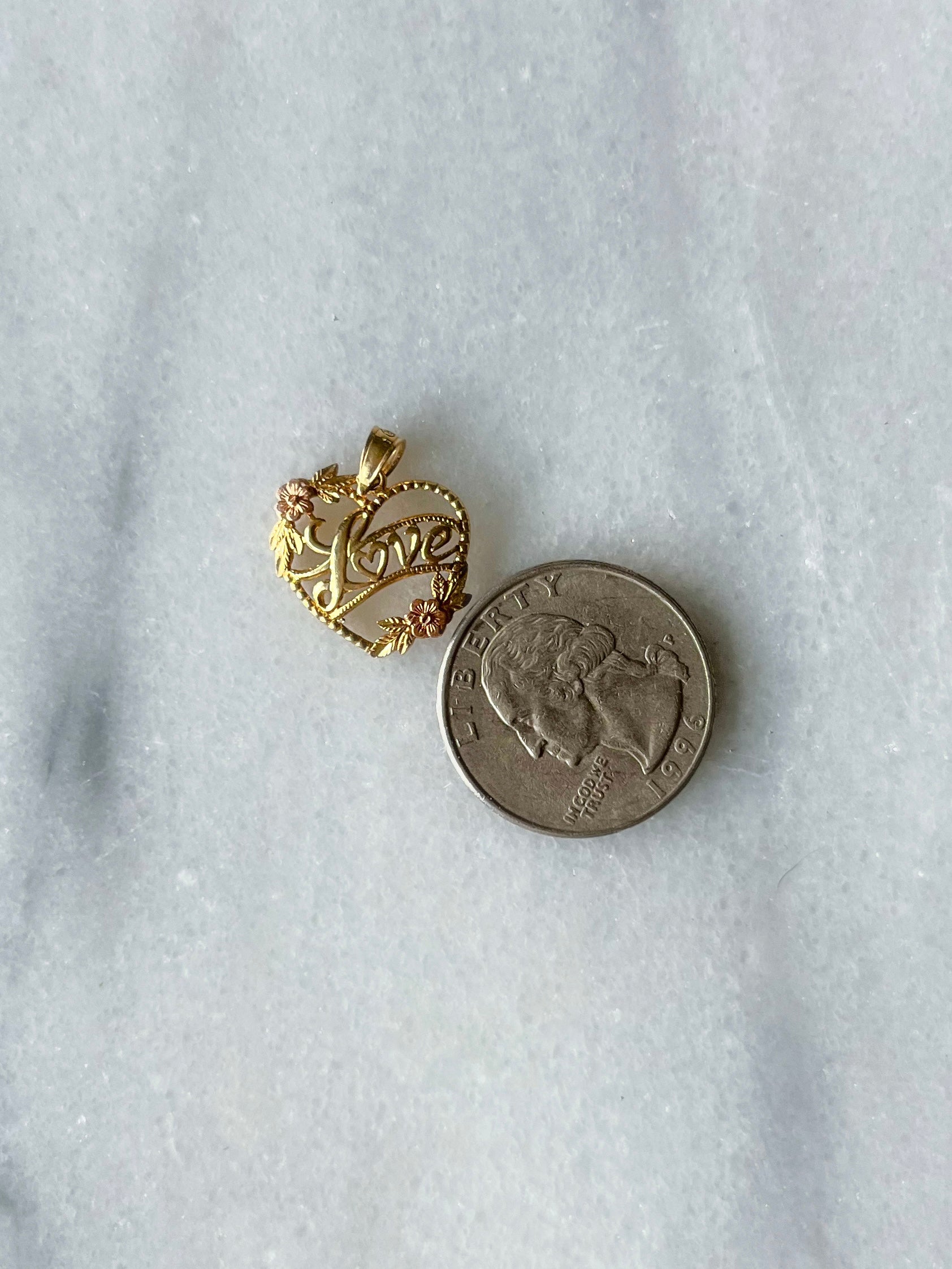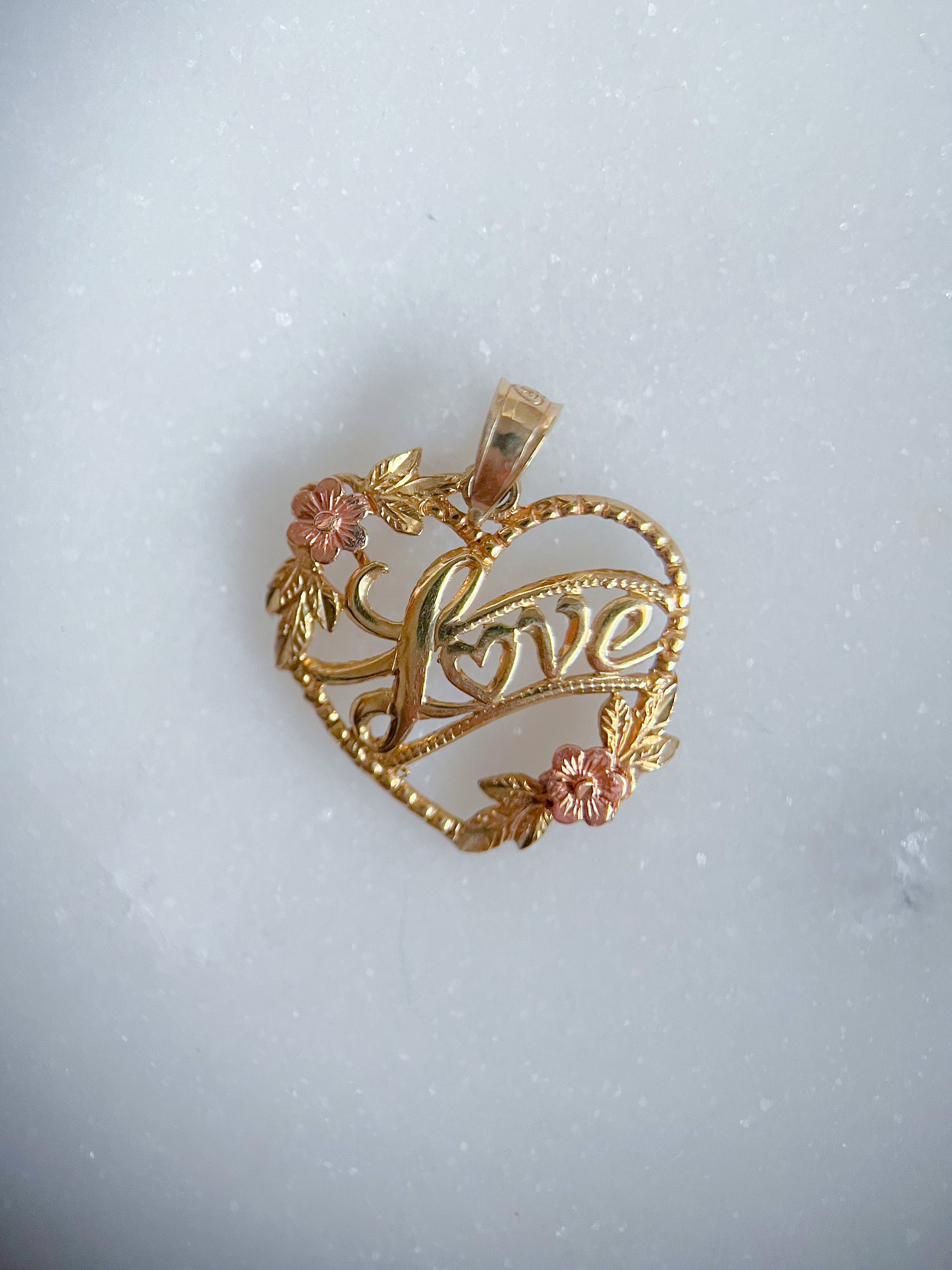 Vintage 10k yellow gold heart “LOVE” charm. Sweet, two toned charm perfect for necklace, and perfect for you or the one you love. Chain not included.