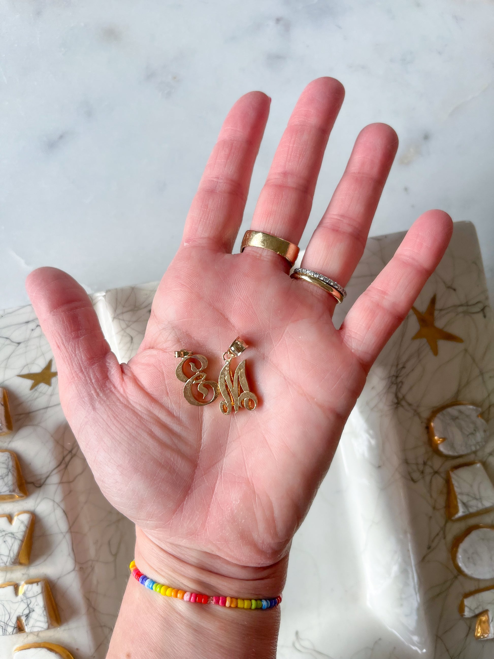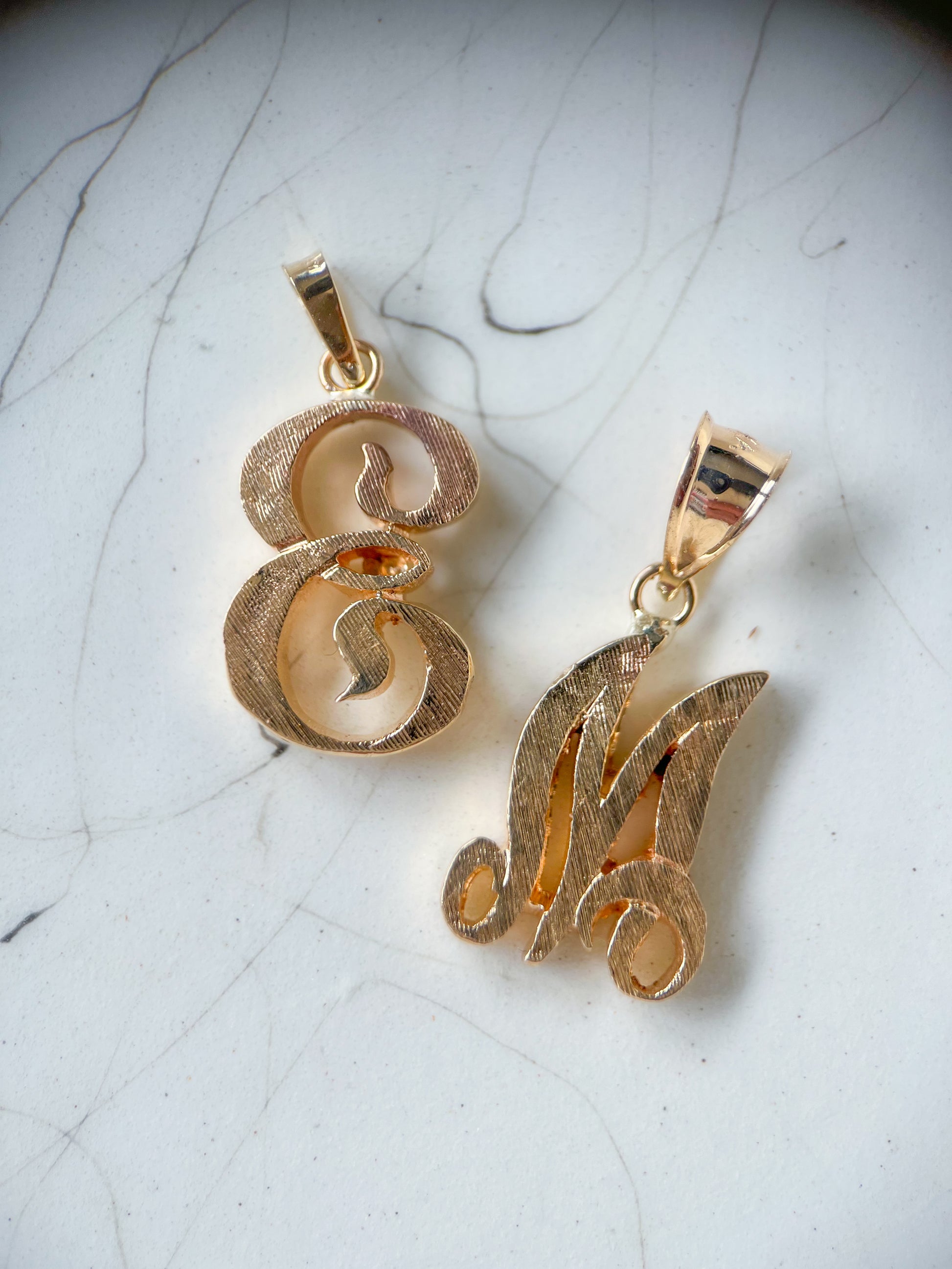 Vintage, 14k yellow gold etched letter "M" charms. This charm is nice and thick and simply stunning. We have two! Chain not included.