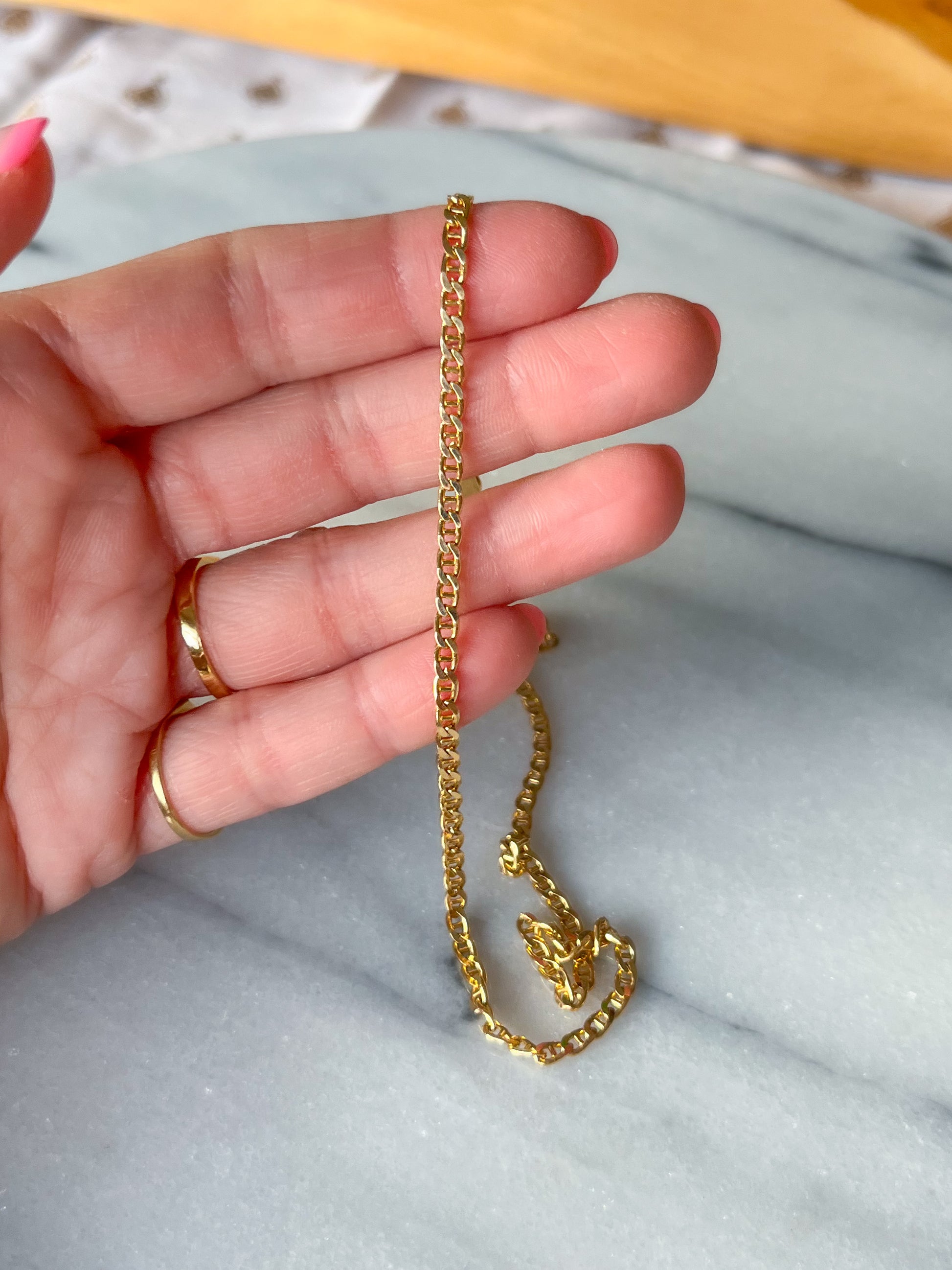 I am absolutely in LOVE with this stunning, vintage, 14k yellow gold mariner chain! It is silky and beautiful and goes with everything. Put it on and never take it off.