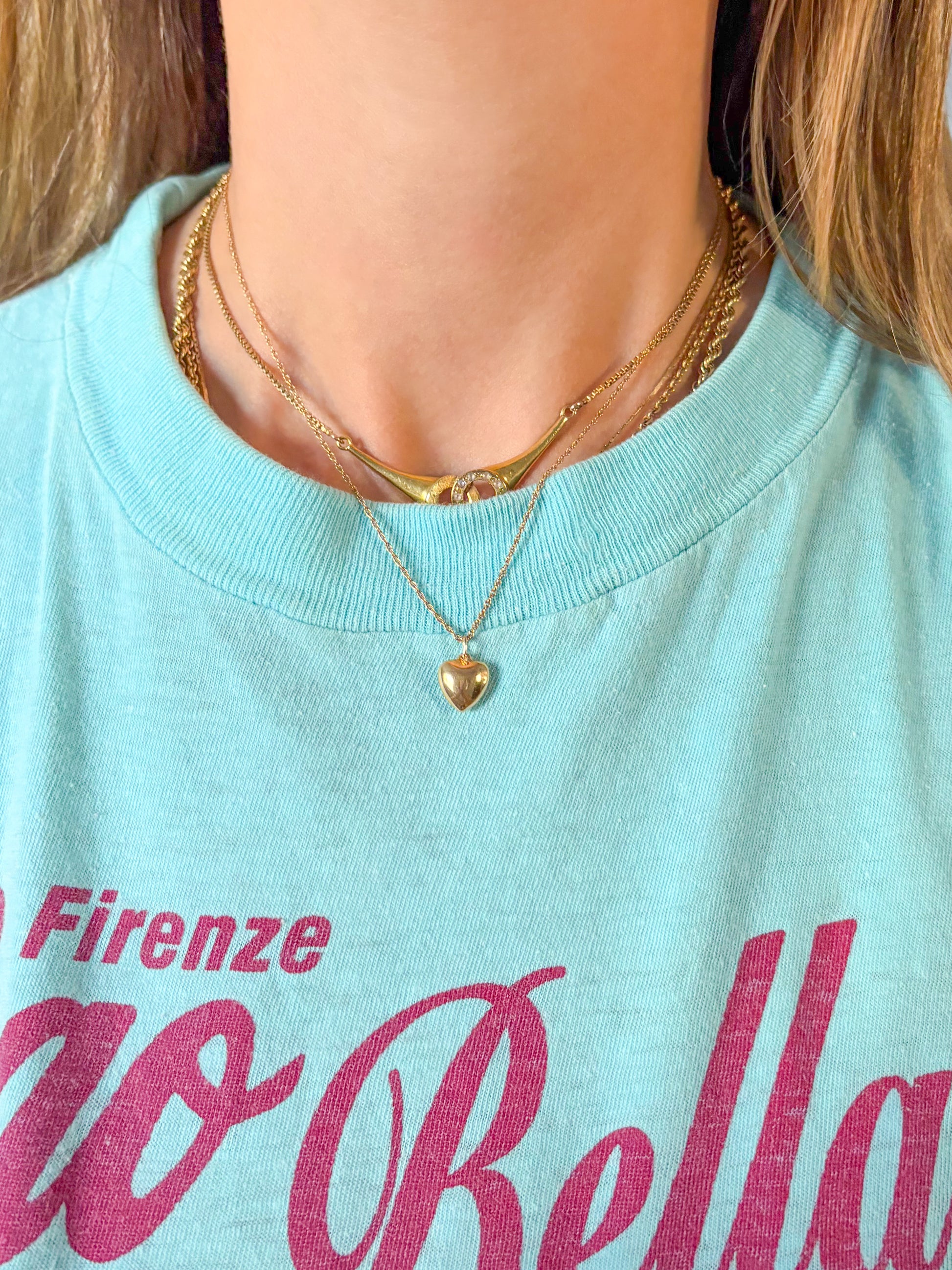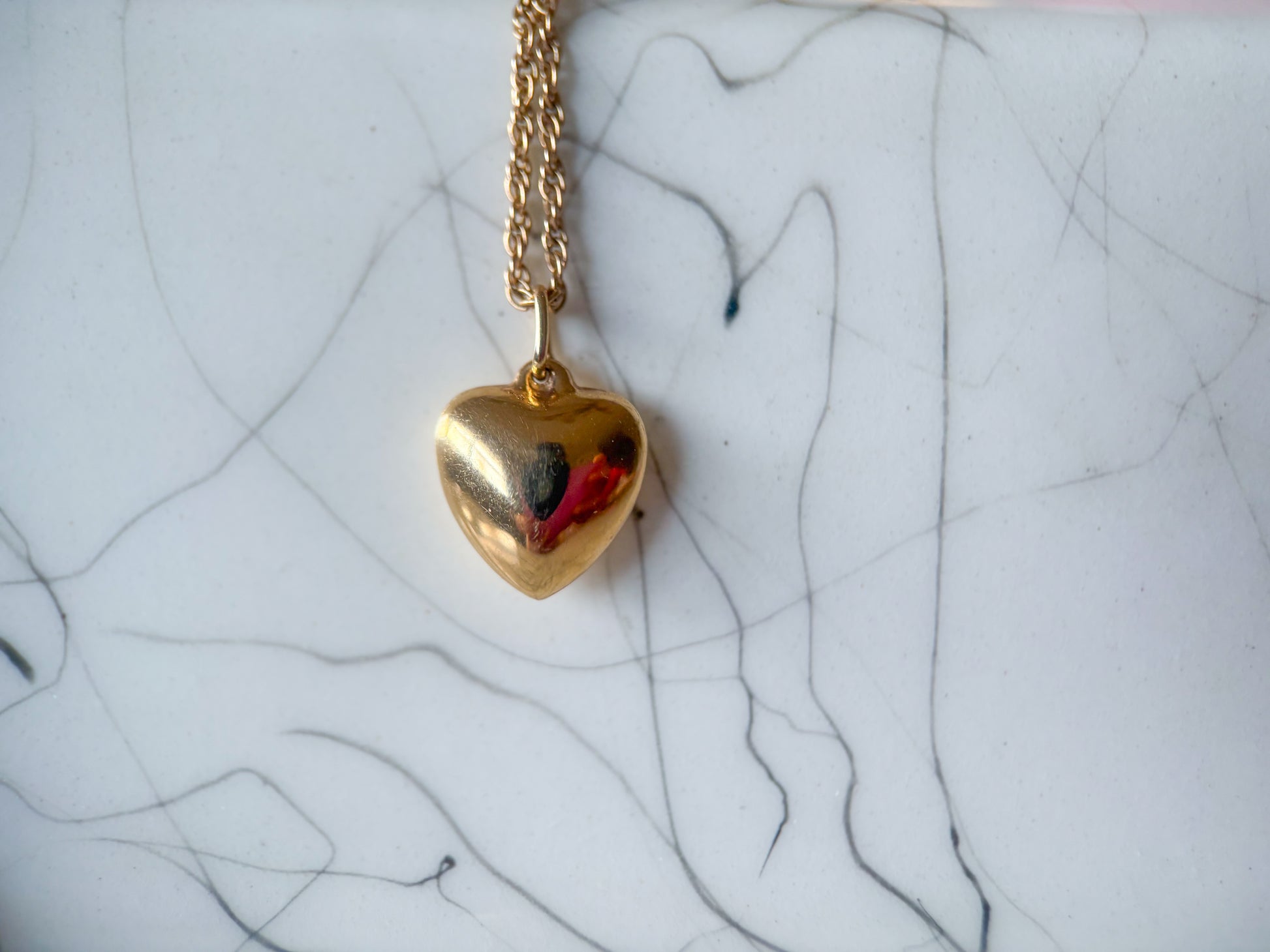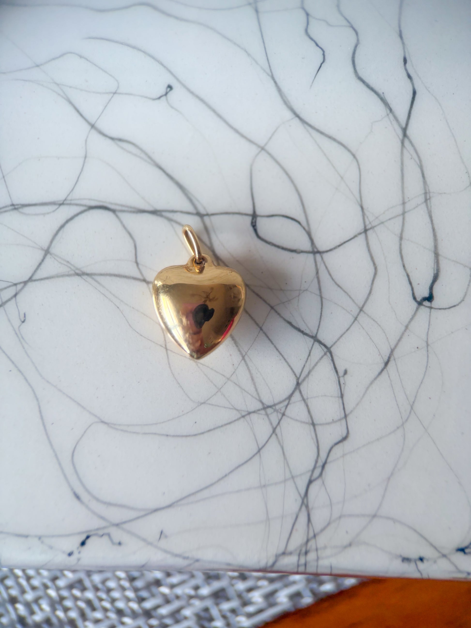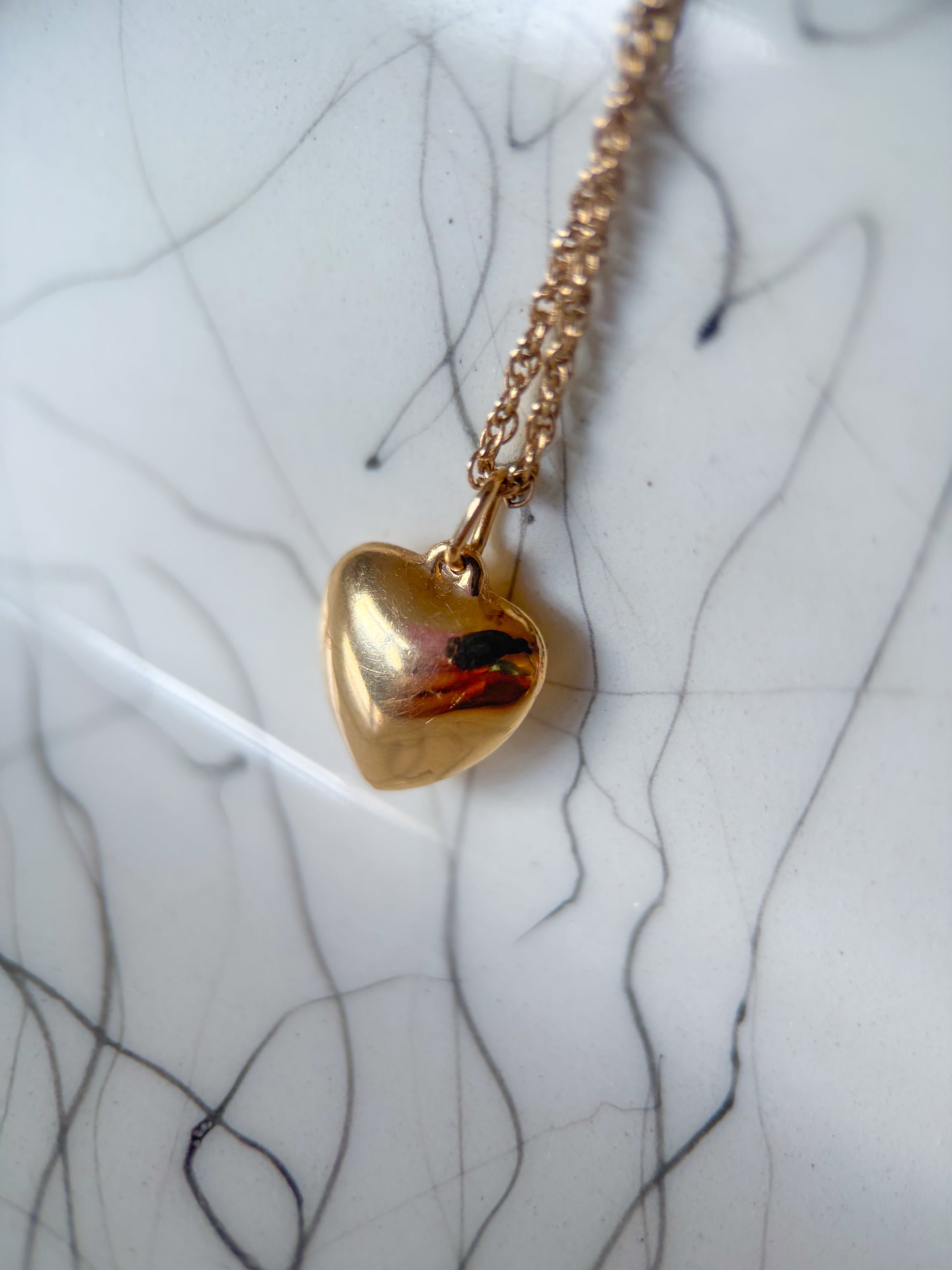 Sweet, vintage, mini, puffy, shiny heart. Made with 14k yellow gold. Chain not included.
