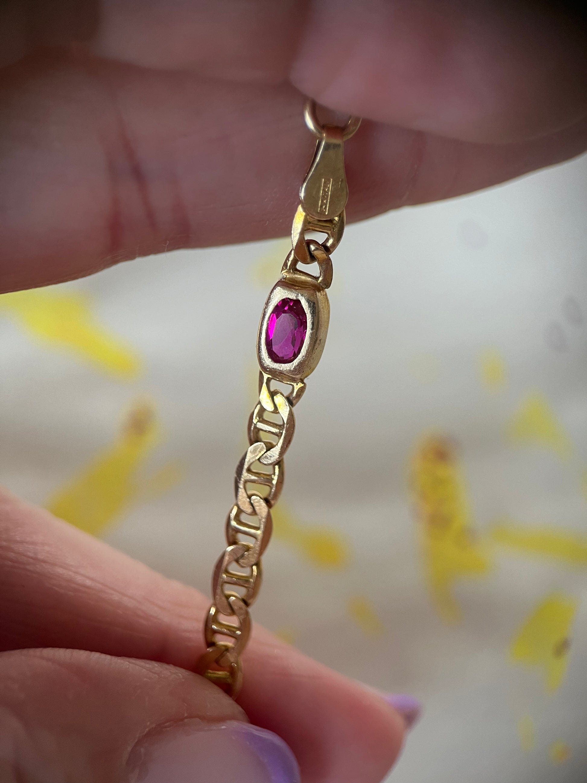 In love with this vintage, 14k yellow gold mariner chain with synthetic gemstones. This beauty weighs over 7 grams and is 8 inches long.