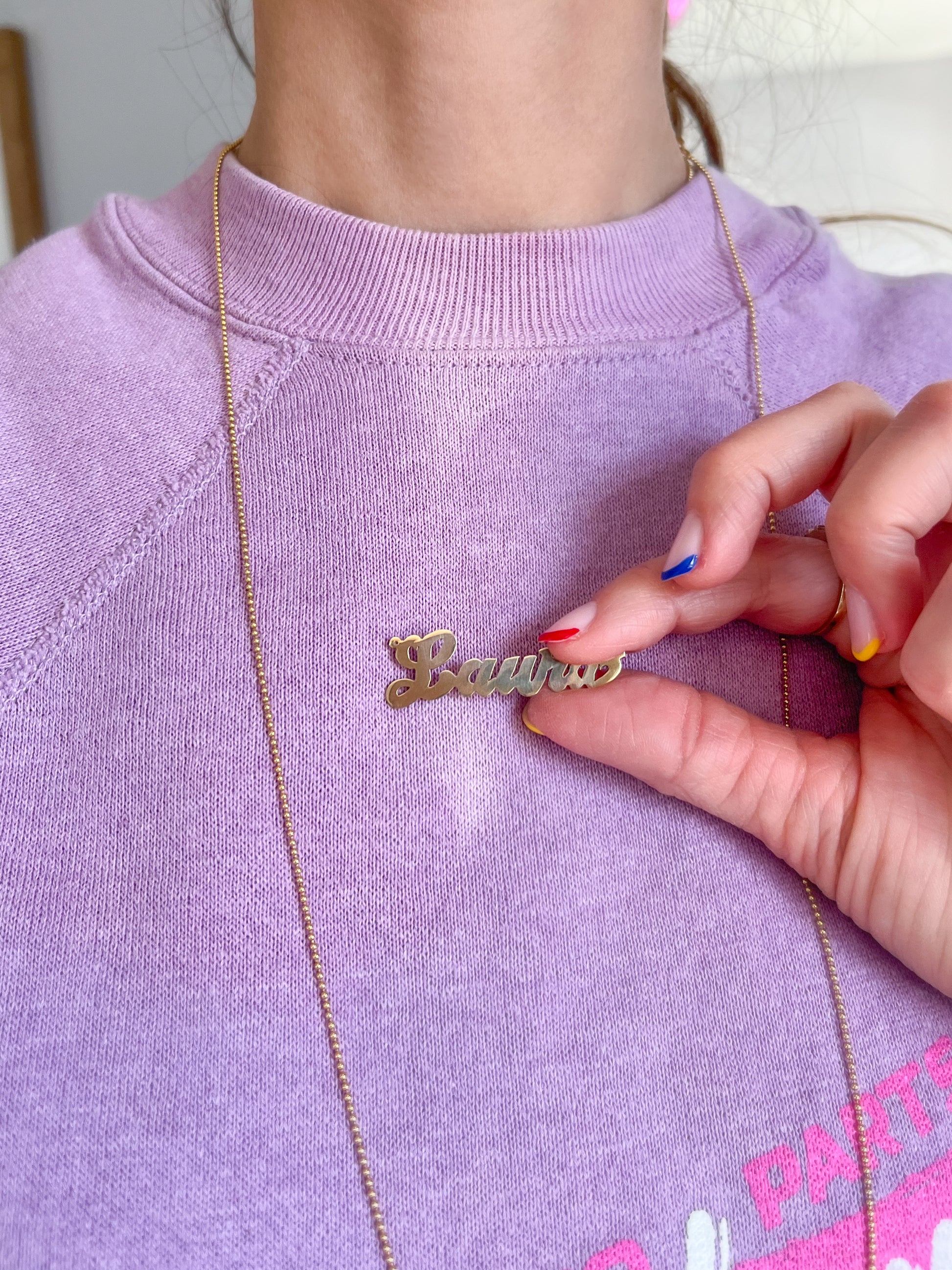 These vintage, 14k yellow gold name plates are not on chains. You can buy the name and get a chain added at your local jeweler, or we can do it for you - please message us if you'd like us to turn it into a necklace for you. These prices are just for the name plate.