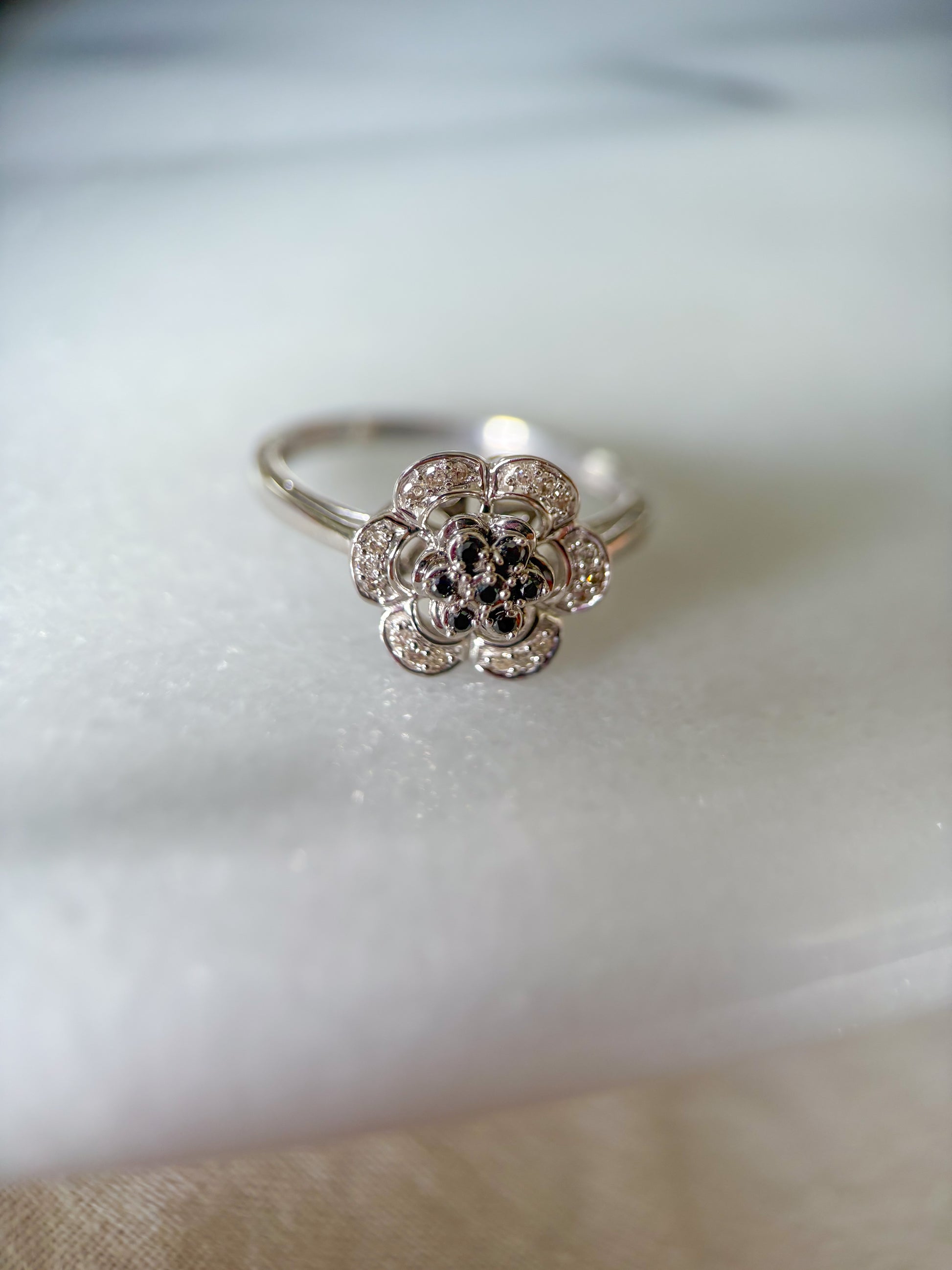 Vintage Natural Black Diamond Flower 14k White Gold Ring