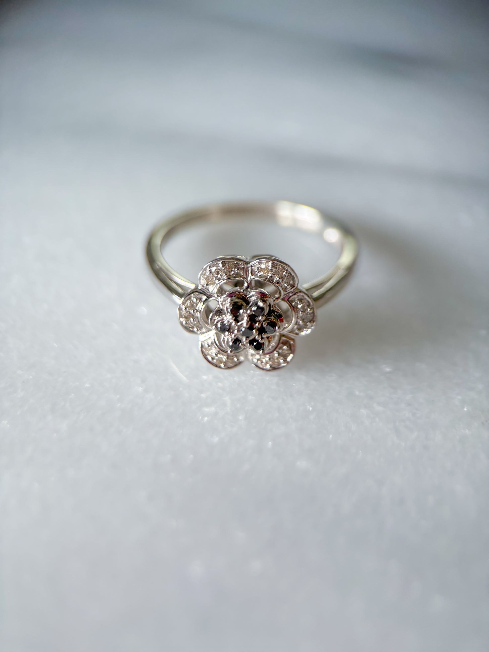 Beautiful, vintage, 14k white gold ring featuring natural white and black diamonds in the shape of a beautiful flower. This ring is a size 6 3/4 and can be resized at your local jeweler.