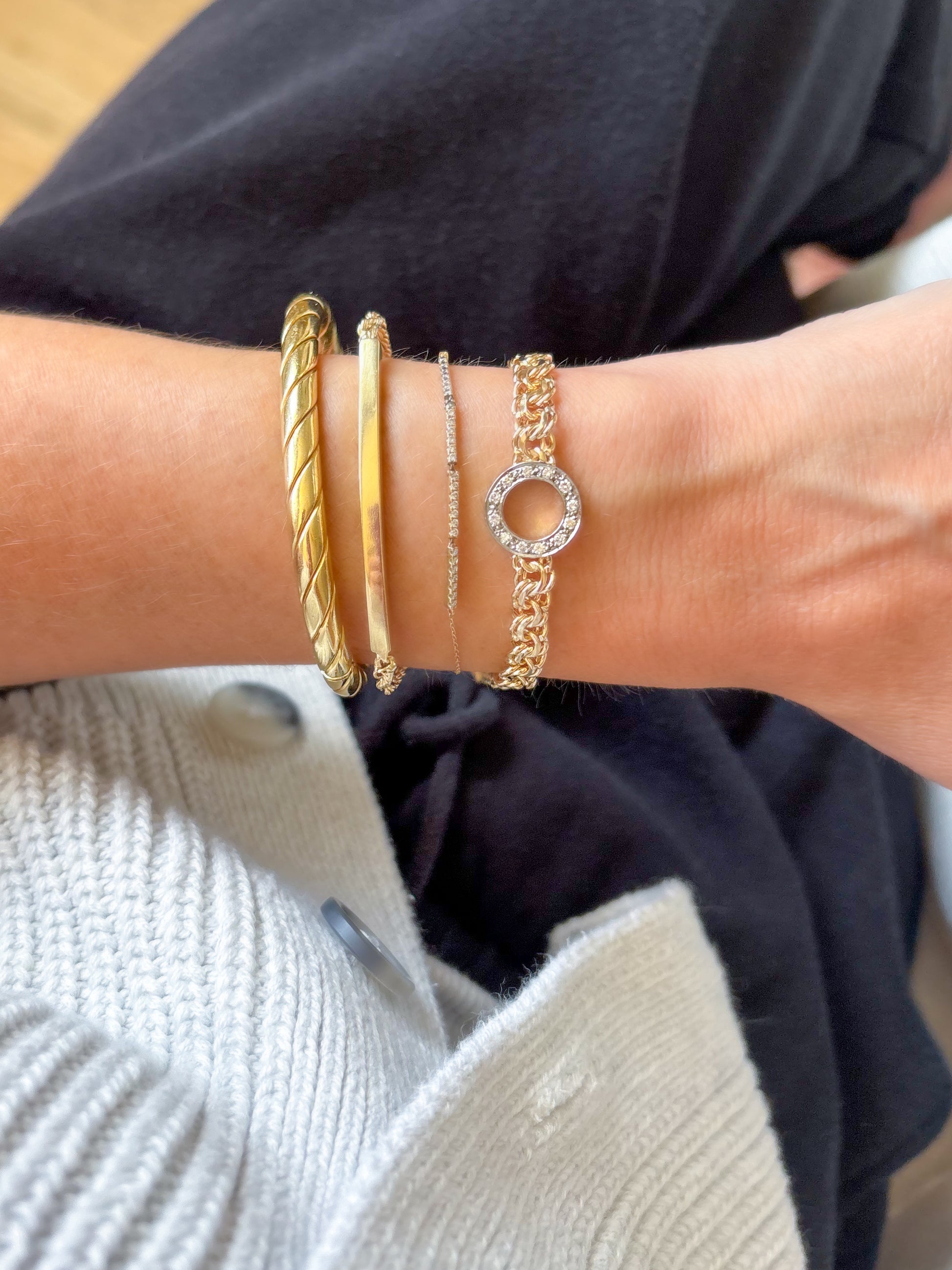 This piece was created from a super long necklace. It is simply stunning. Made of 14k yellow gold and natural diamonds - this bracelet weighs over 14 grams and features a ring of approximately 0.36 carat total weight of diamonds.