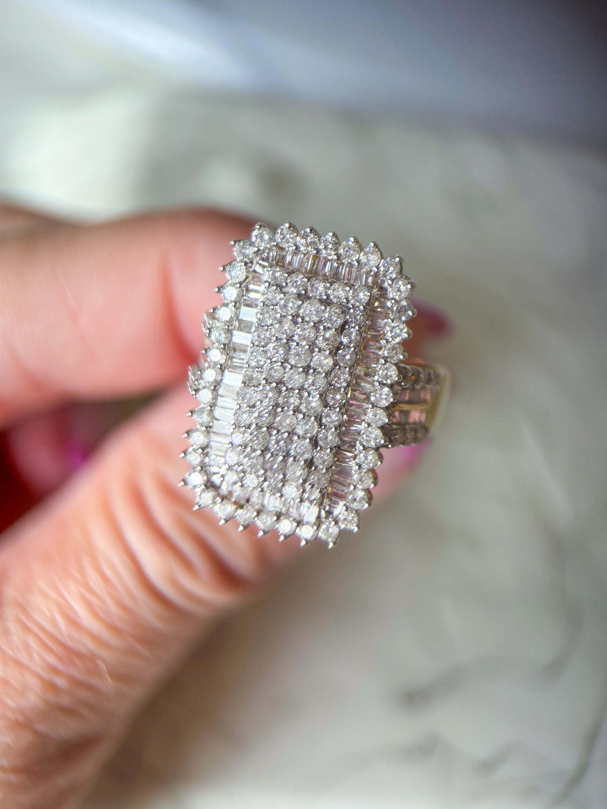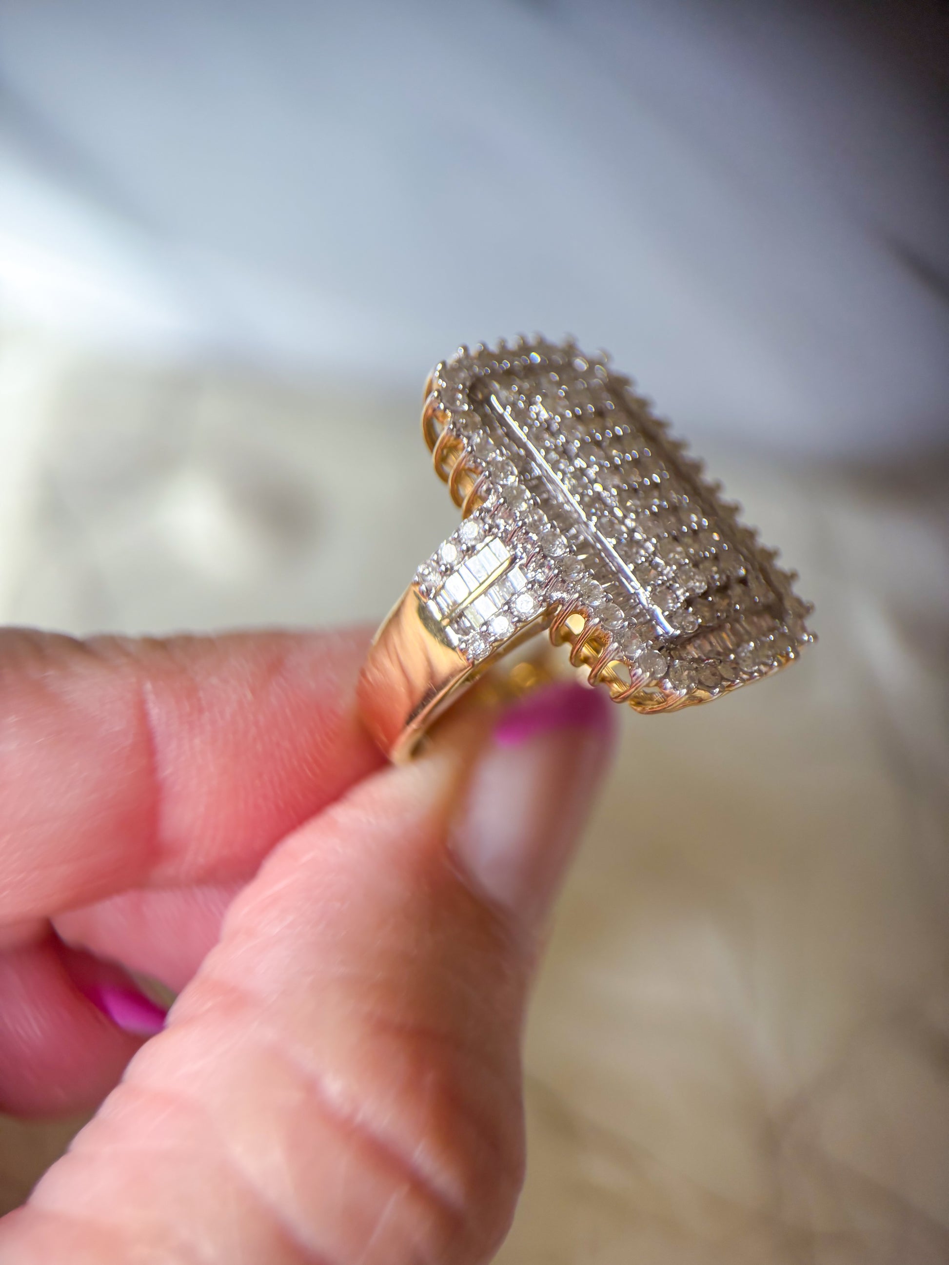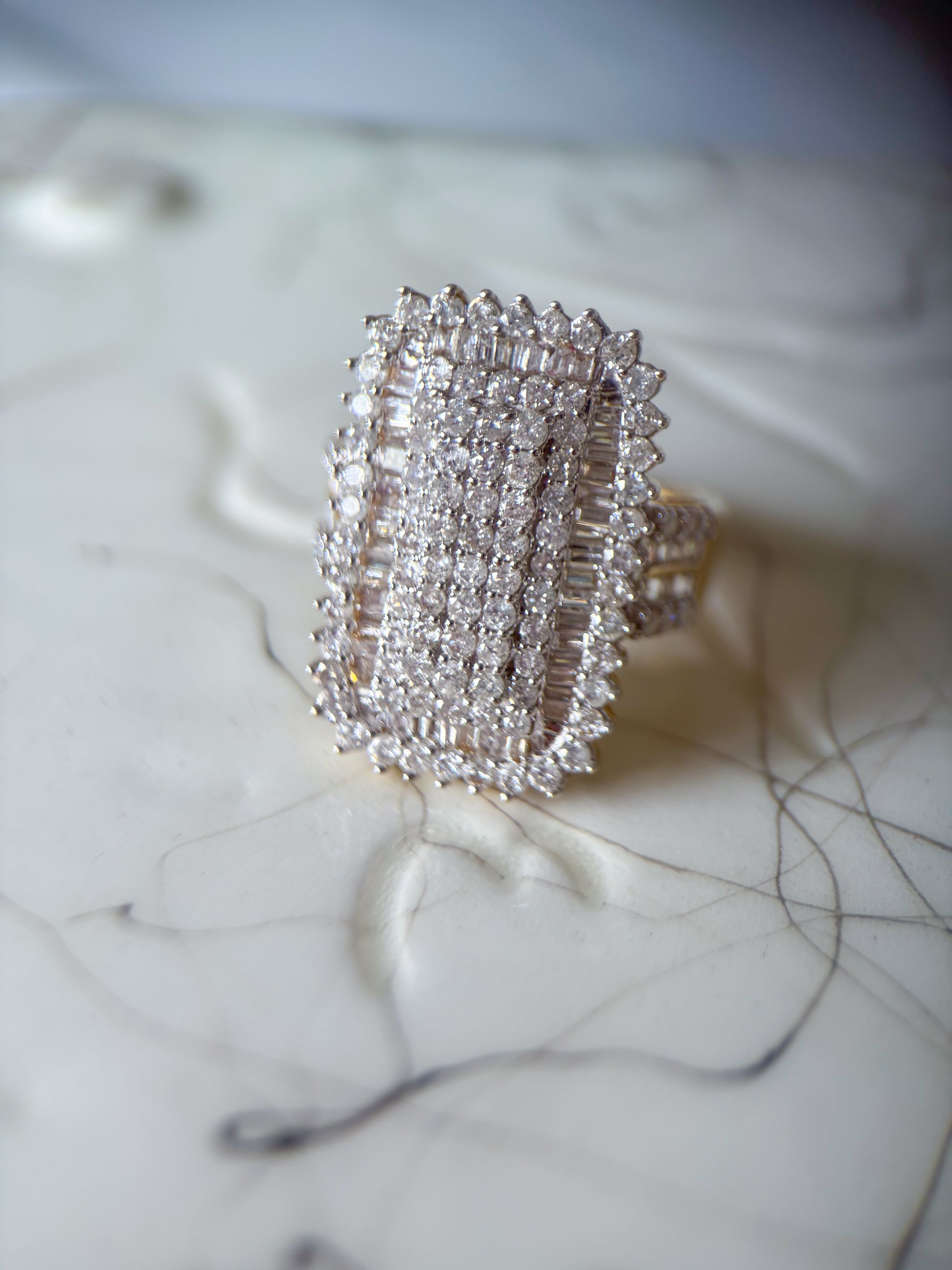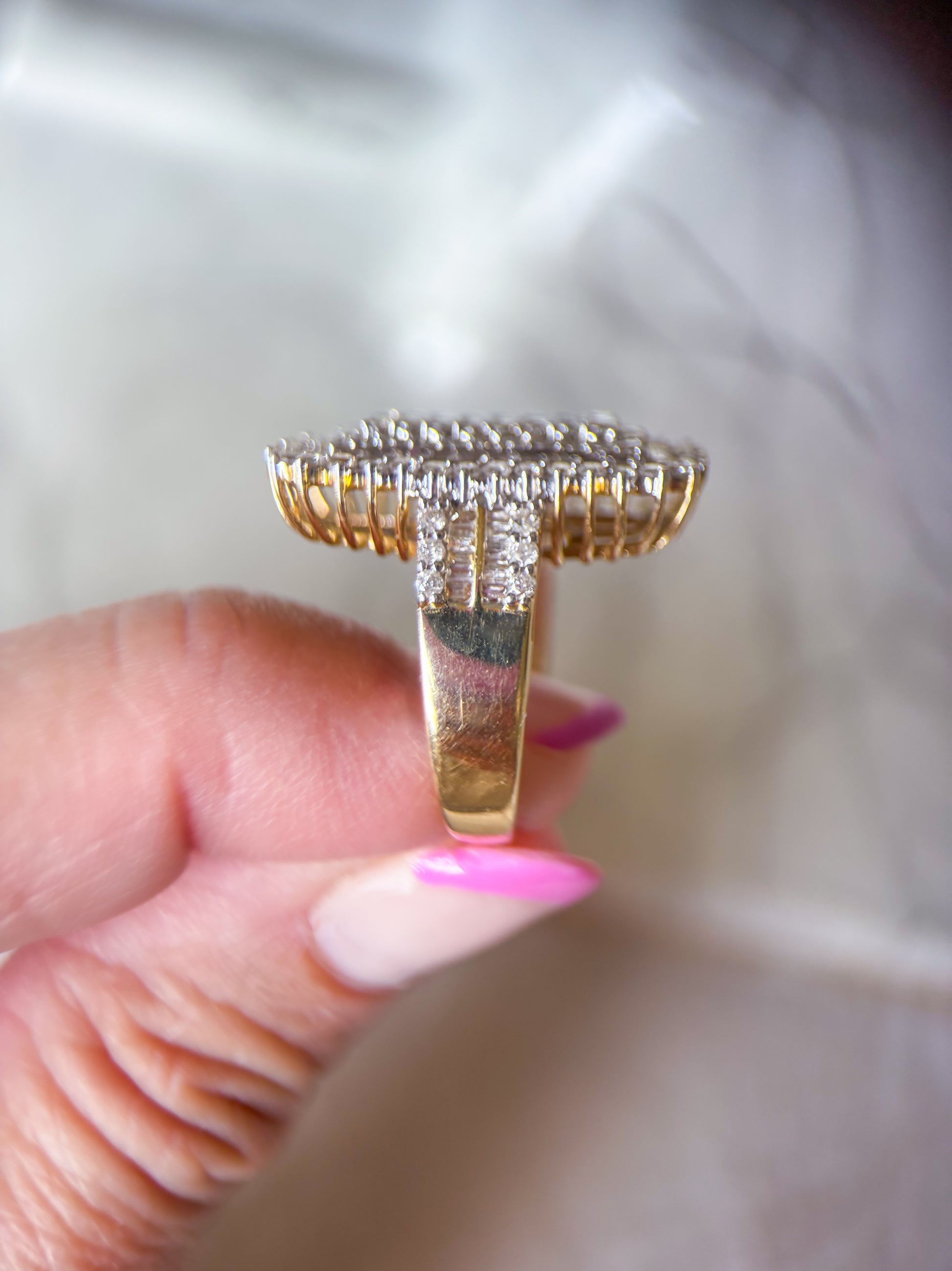WOW! This vintage, 14k yellow gold and natural diamond ring is a show stopper! If you are looking for bling, this is your gal! This stunning ring features round and baguette shaped diamonds. Ring is a size 5 1/2 and can be resized at your local jeweler.
