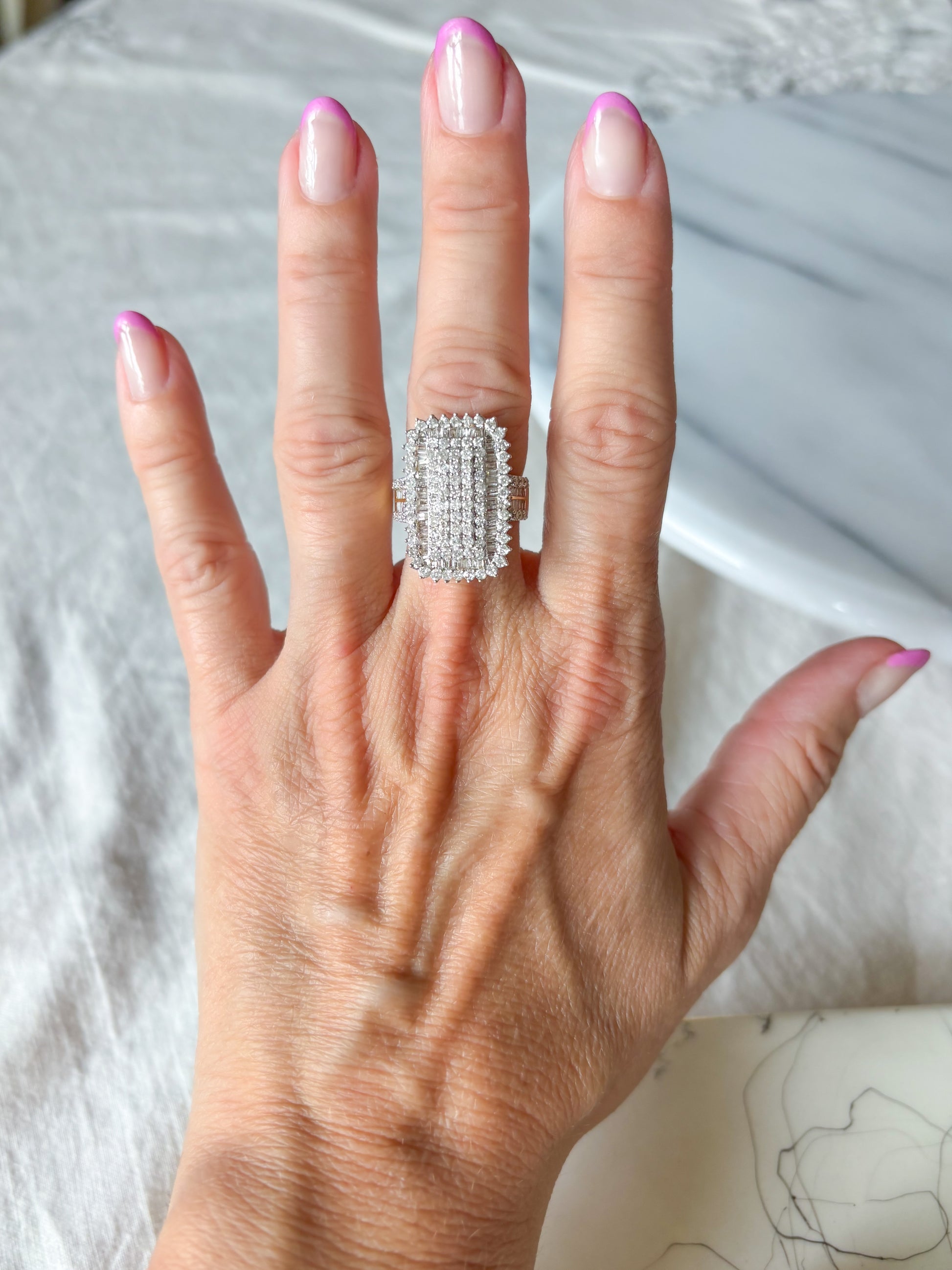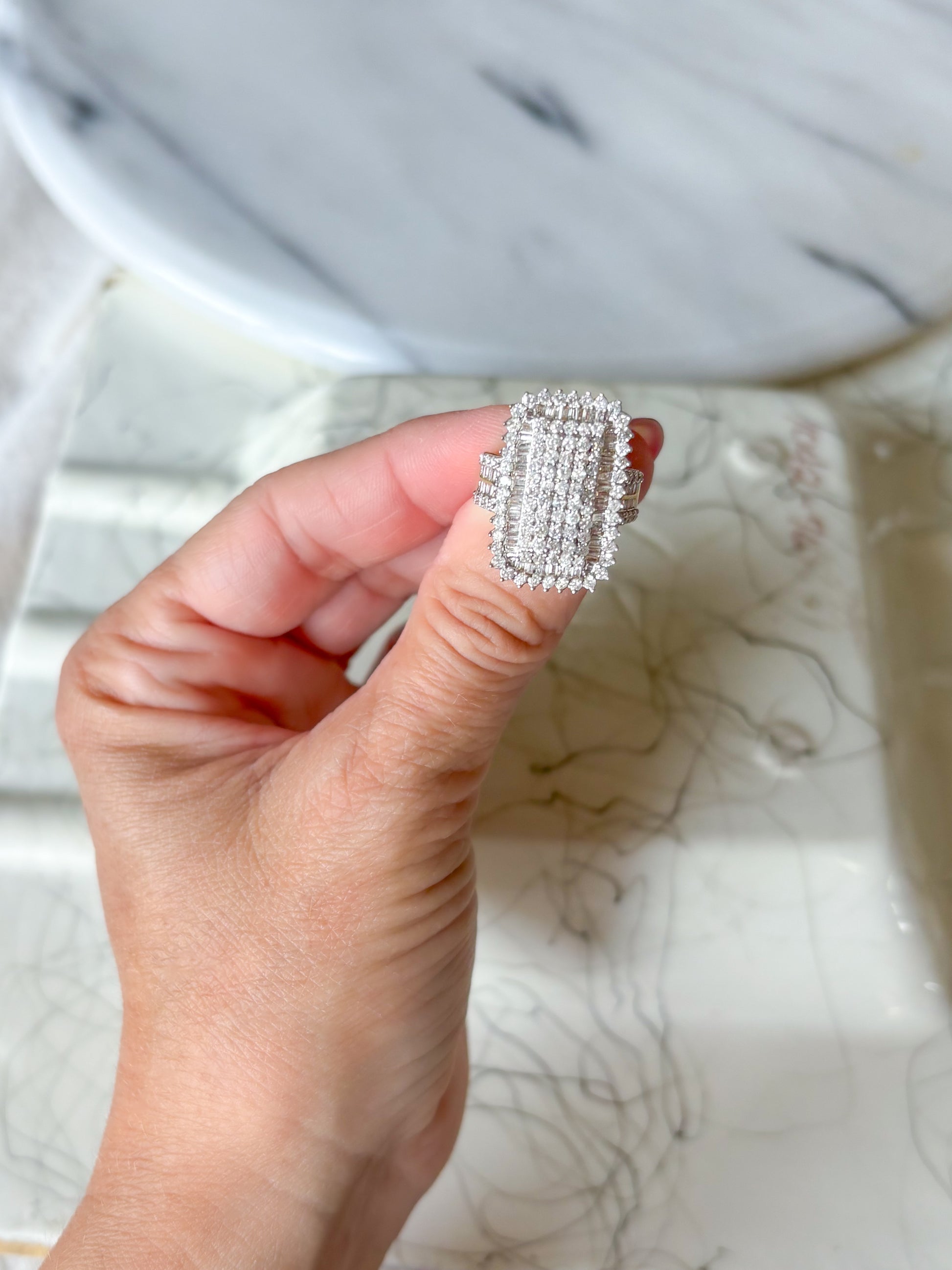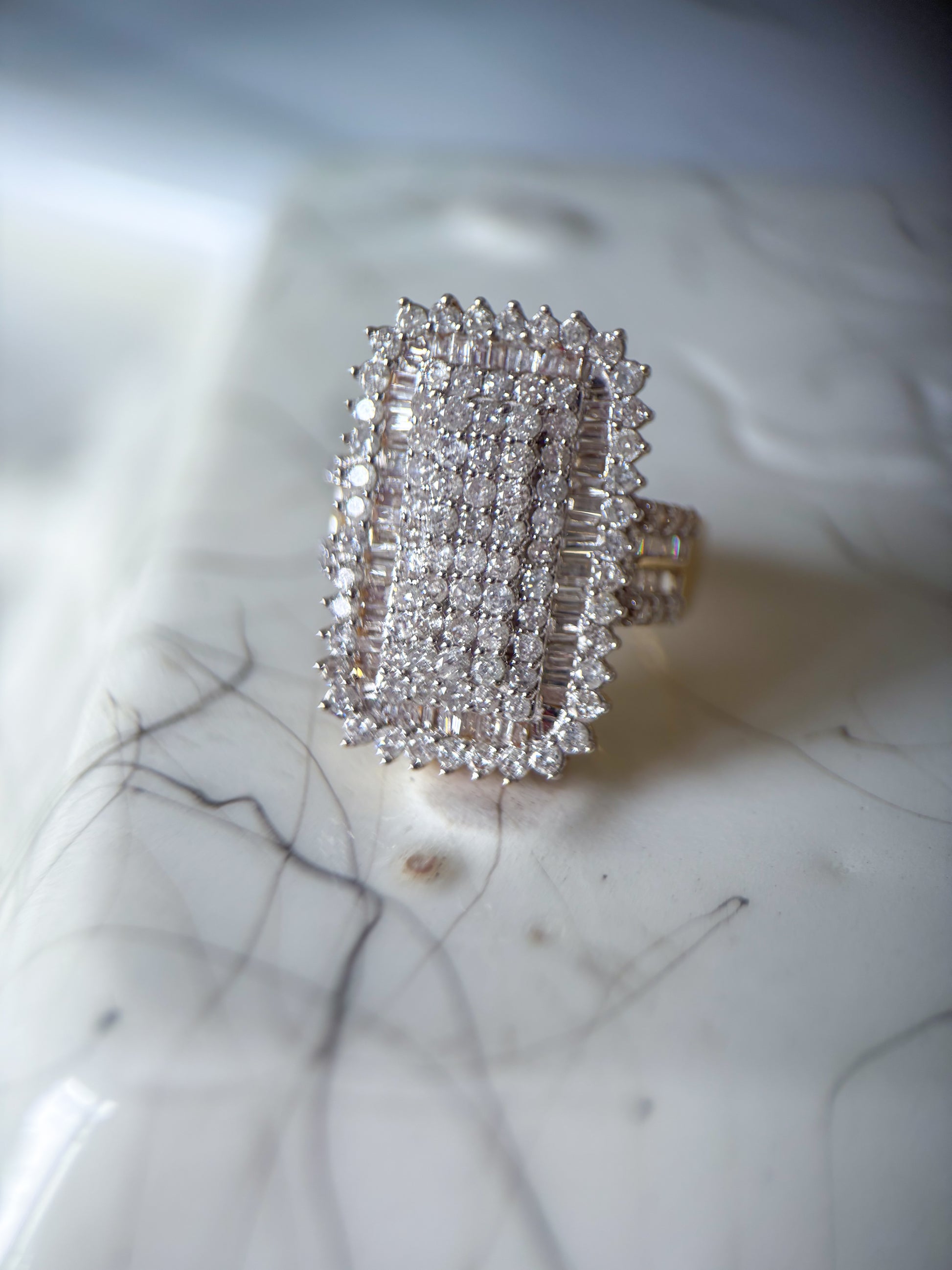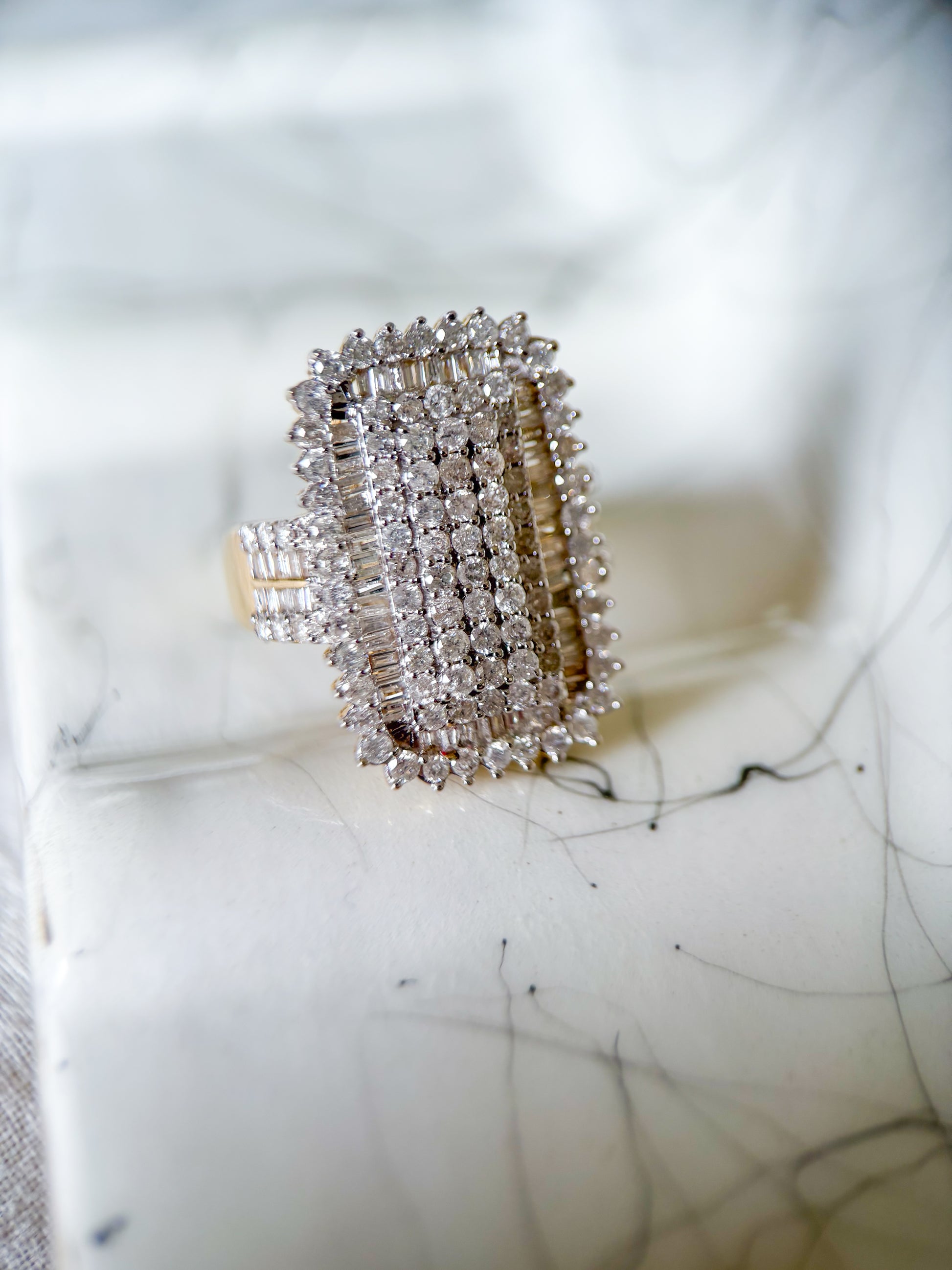 WOW! This vintage, 14k yellow gold and natural diamond ring is a show stopper! If you are looking for bling, this is your gal! This stunning ring features round and baguette shaped diamonds. Ring is a size 5 1/2 and can be resized at your local jeweler.