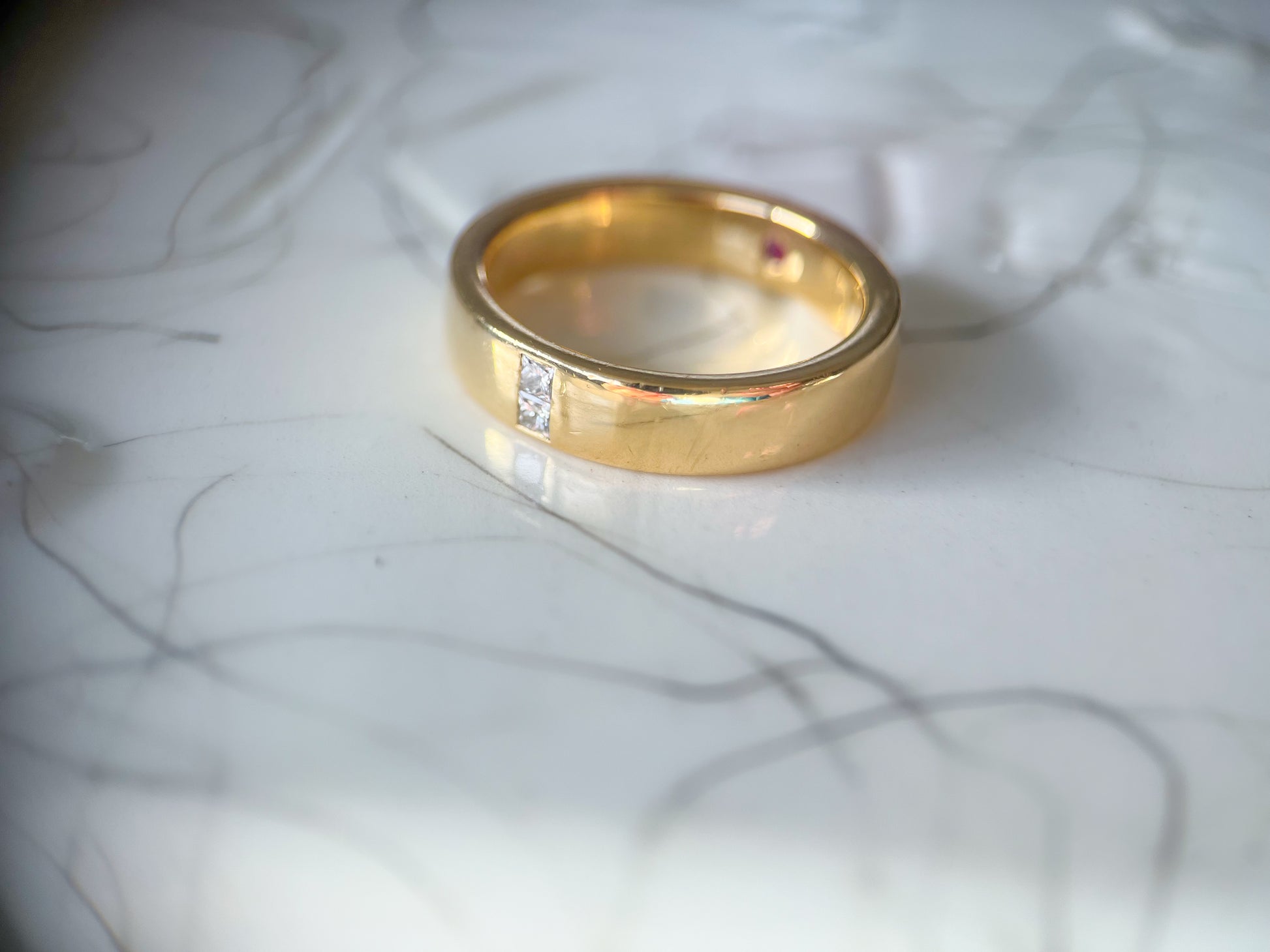 Absolutely beautiful, vintage heavy, 18k yellow gold band featuring 2 princess cut diamonds and 1 hidden ruby inside the band. This ring weighs over 9 grams and is a size 8. Can not be resized.