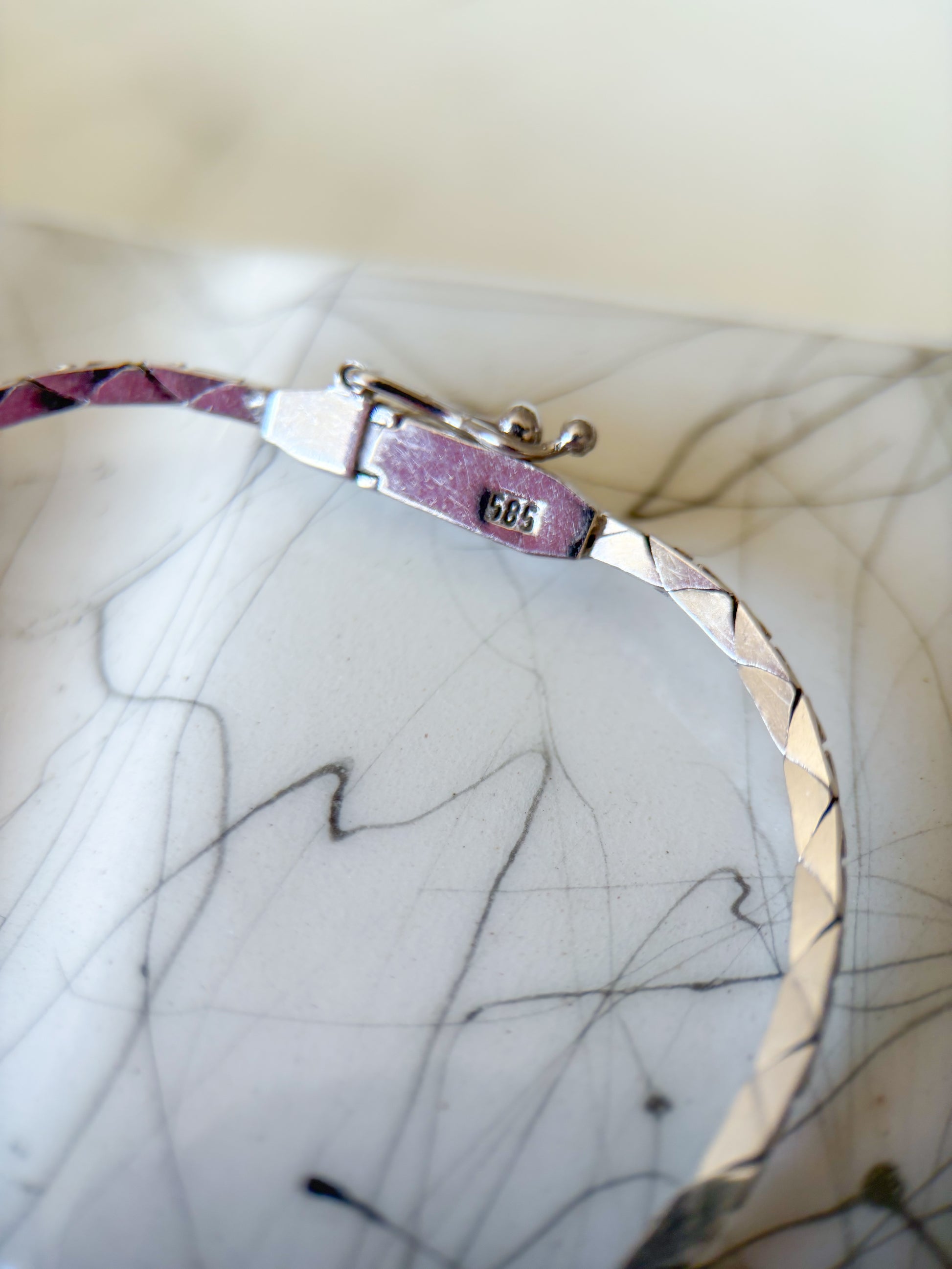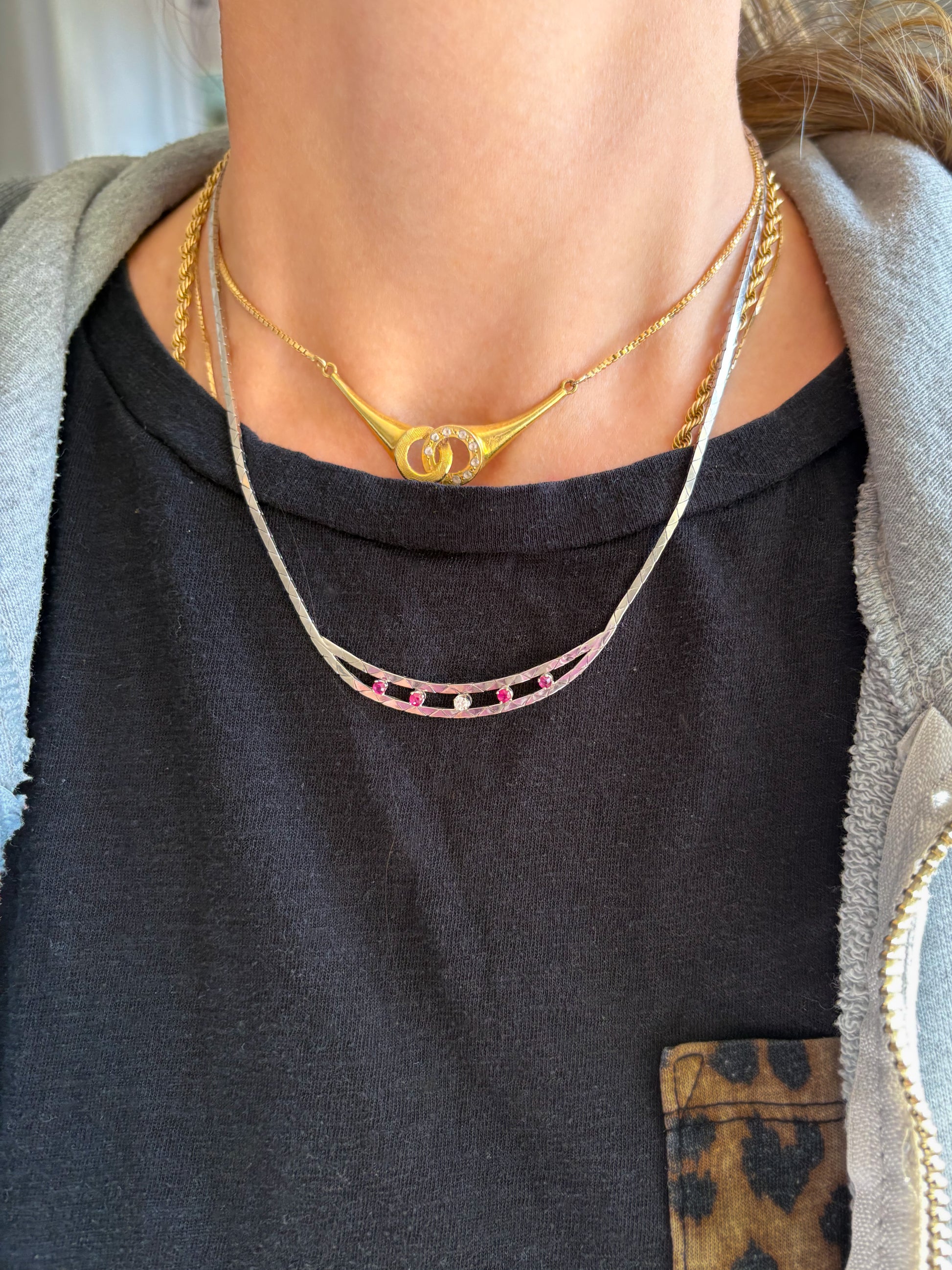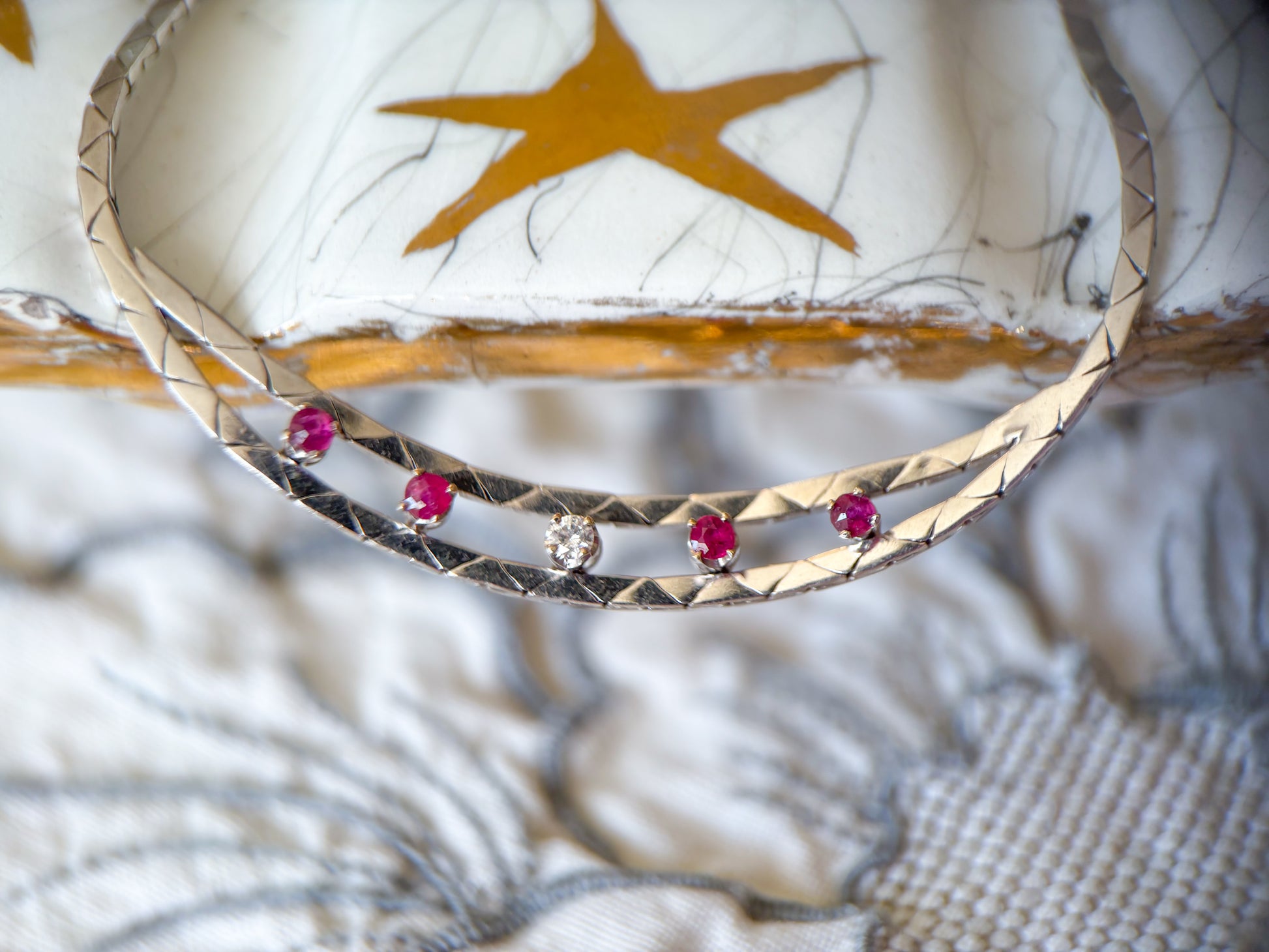 Completely obsessed with this 14k white gold cobra chain featuring natural rubies and one natural diamond. We have a matching necklace too!