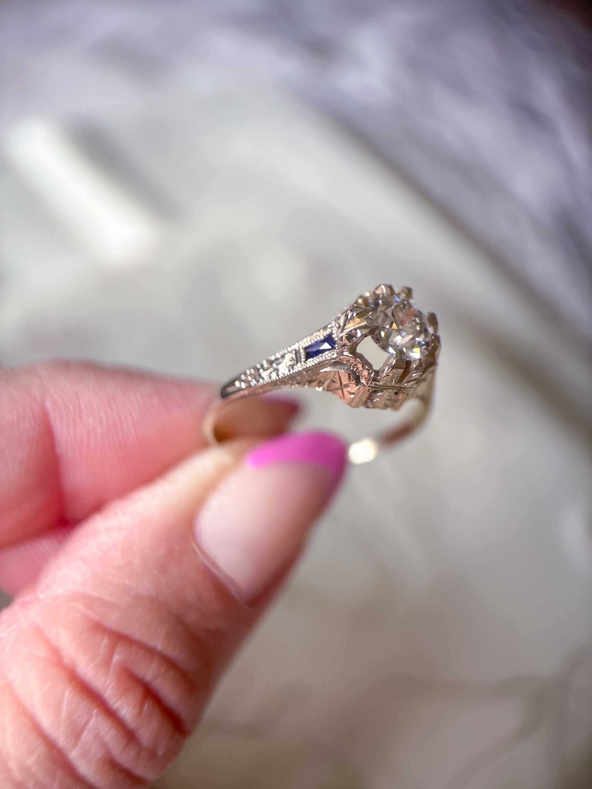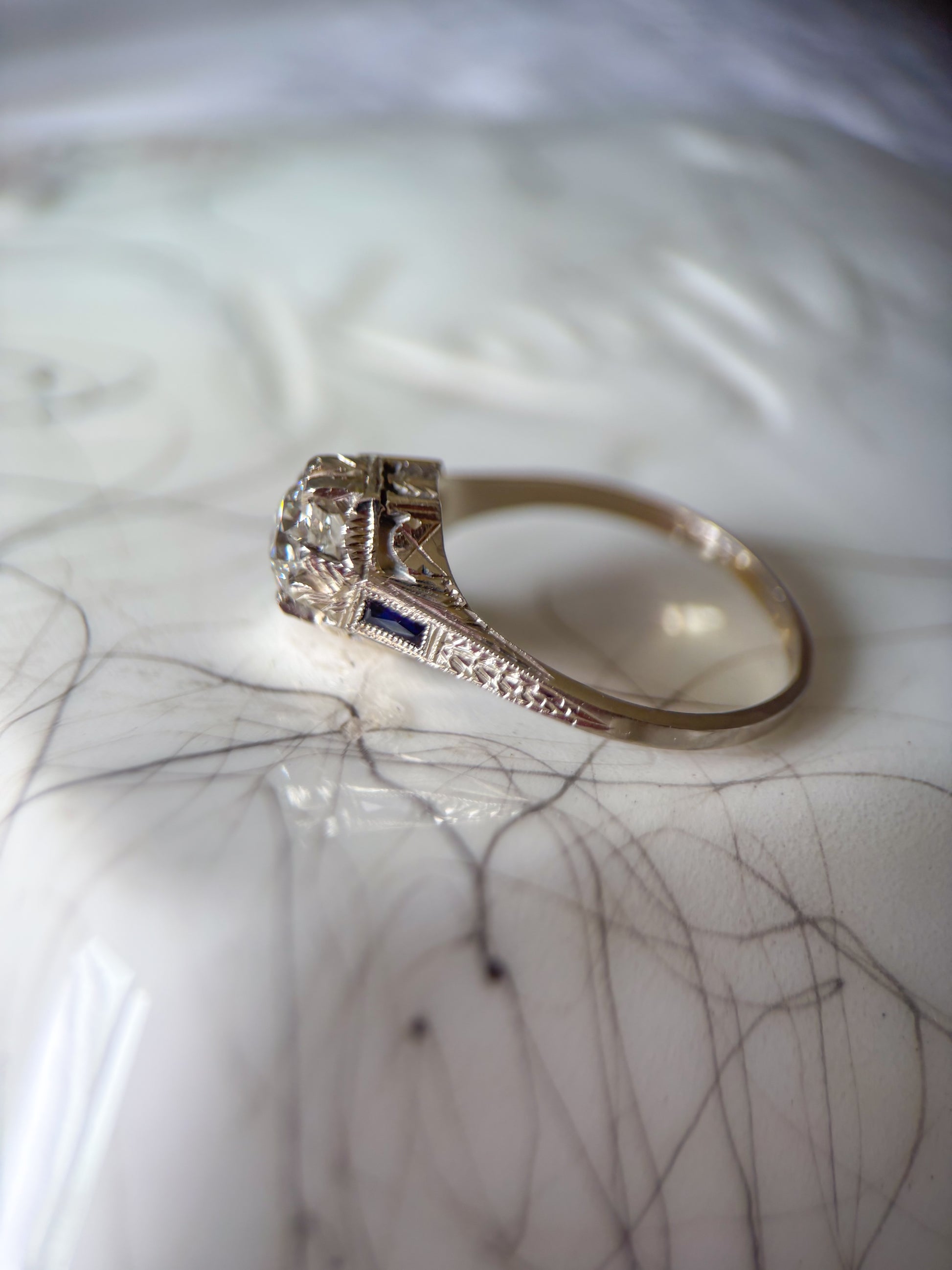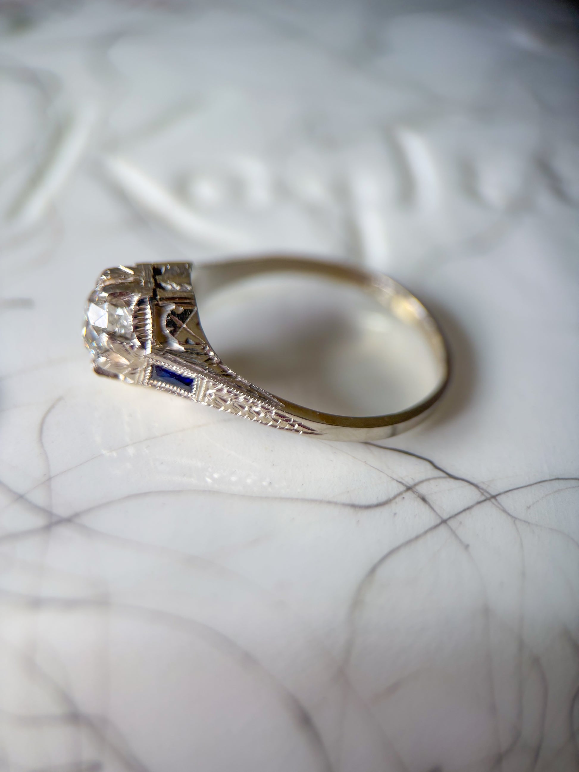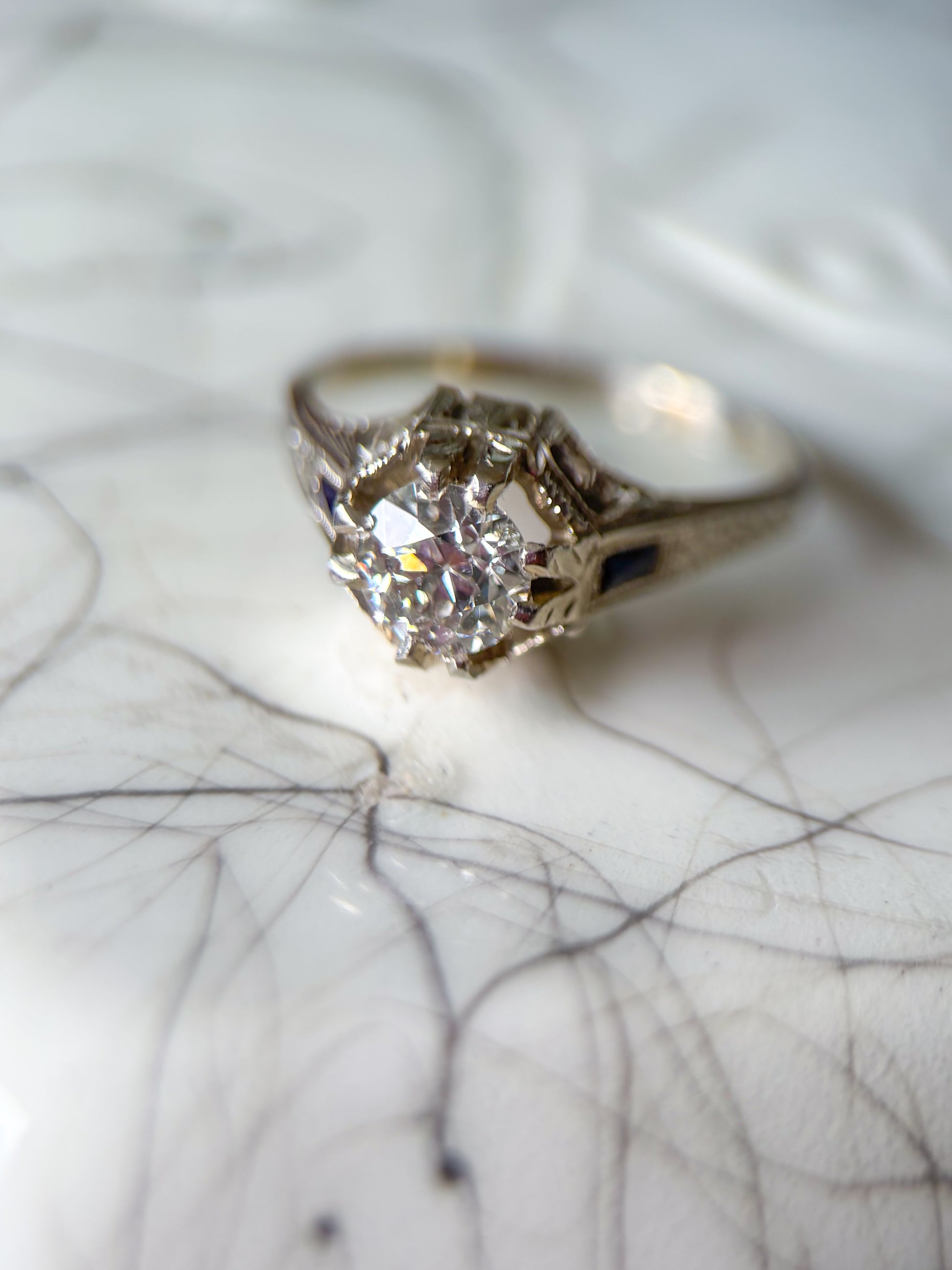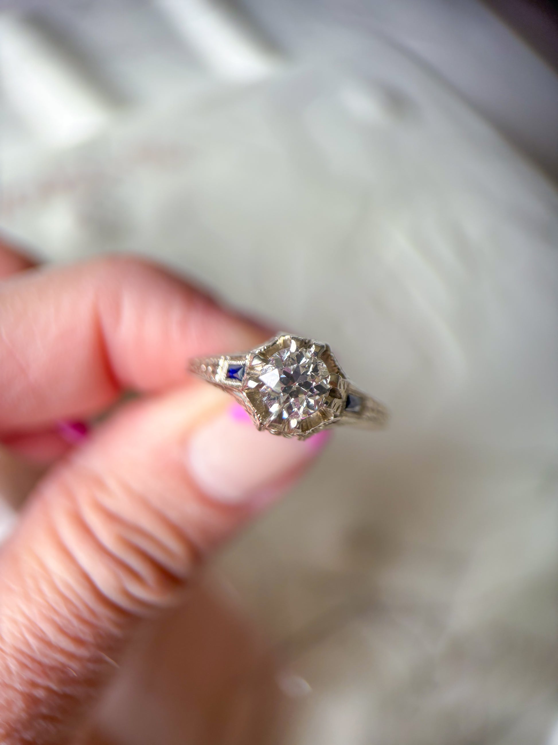 I am obsessed with old miner diamonds, so therefore I am obsessed with this ring. This vintage, 18k white gold ring features an old mine diamond and natural sapphires. A simply stunning piece. This ring is a size 8 1/2 and can be resized at your local jeweler.