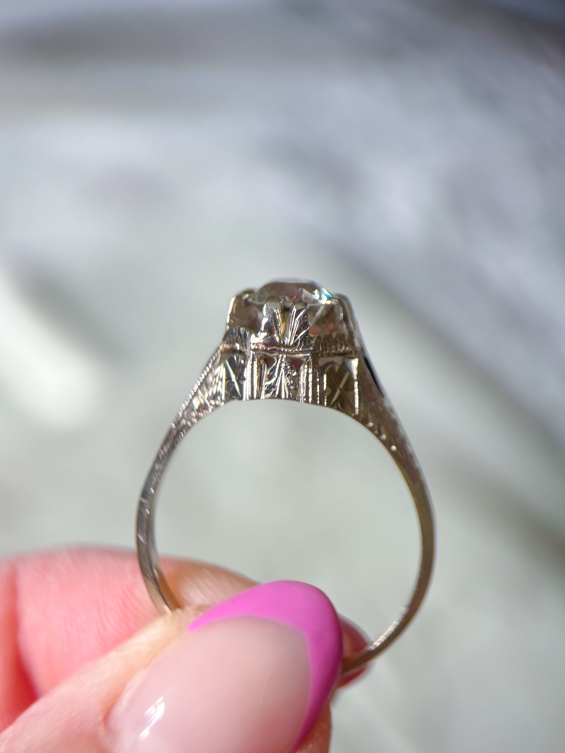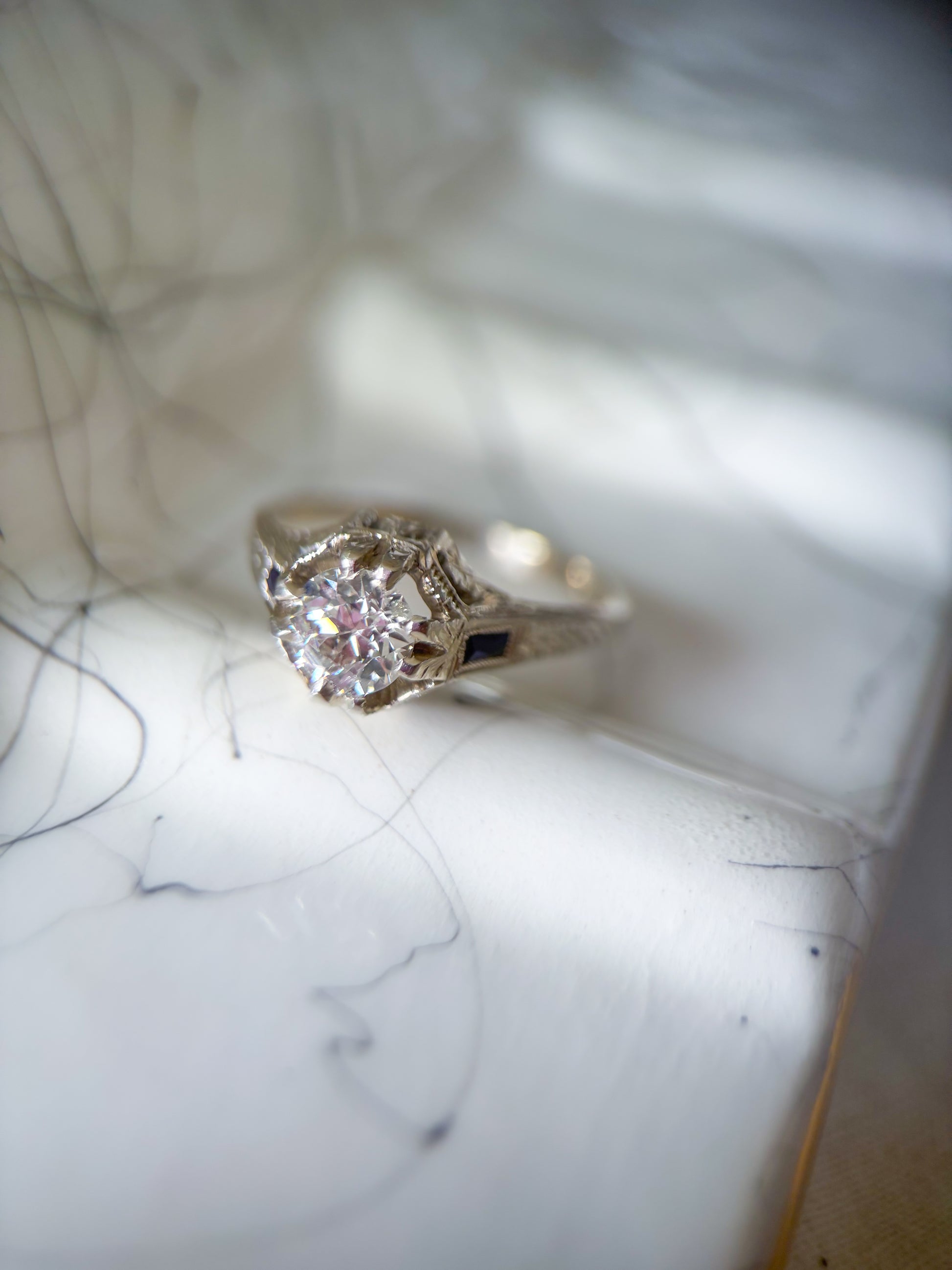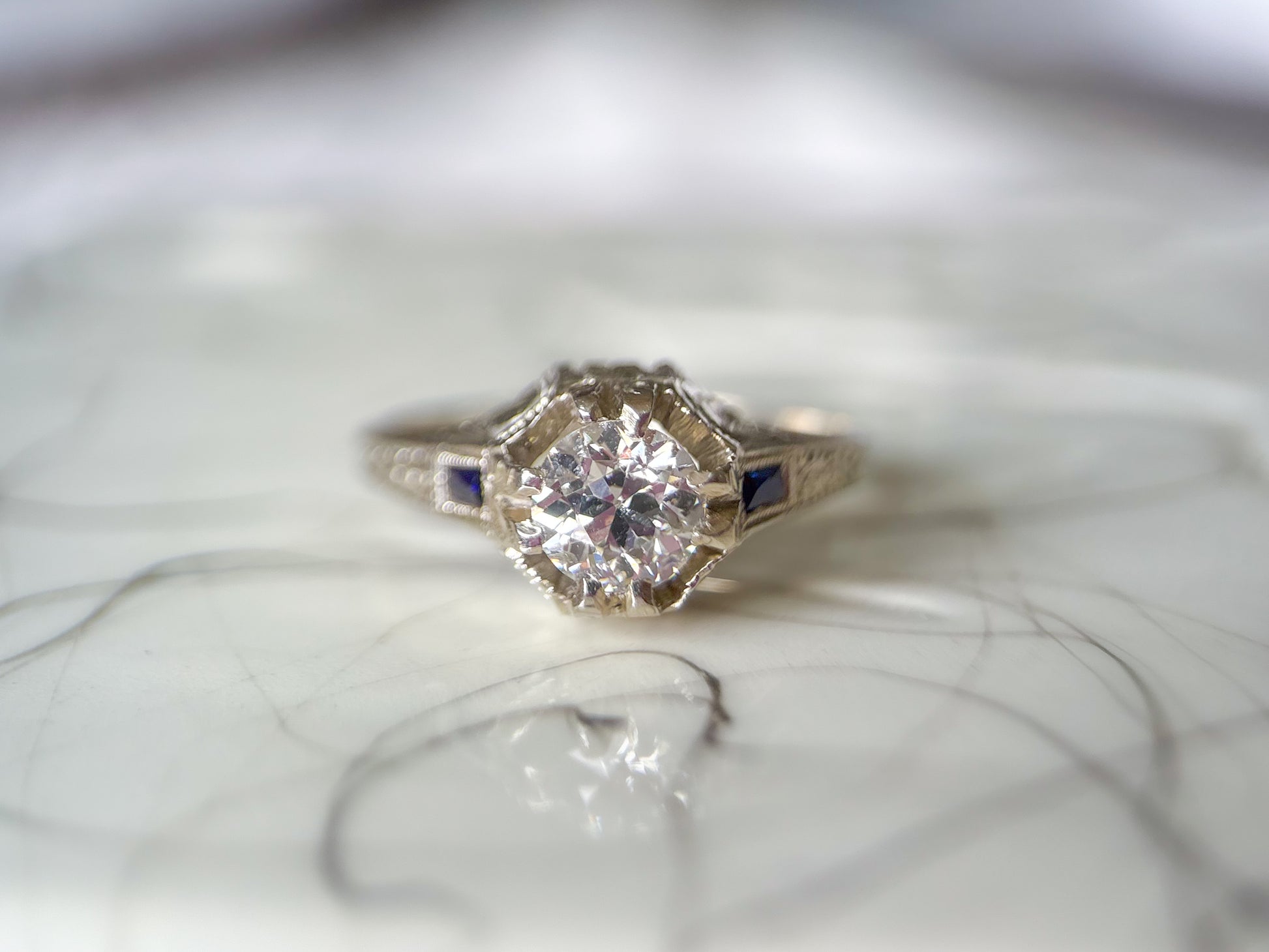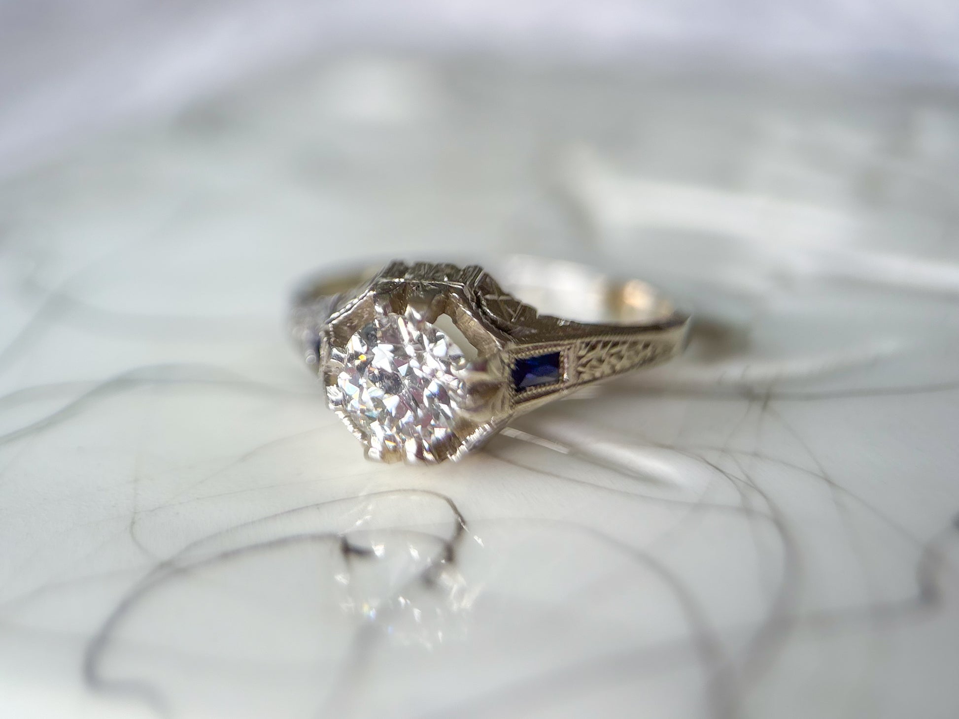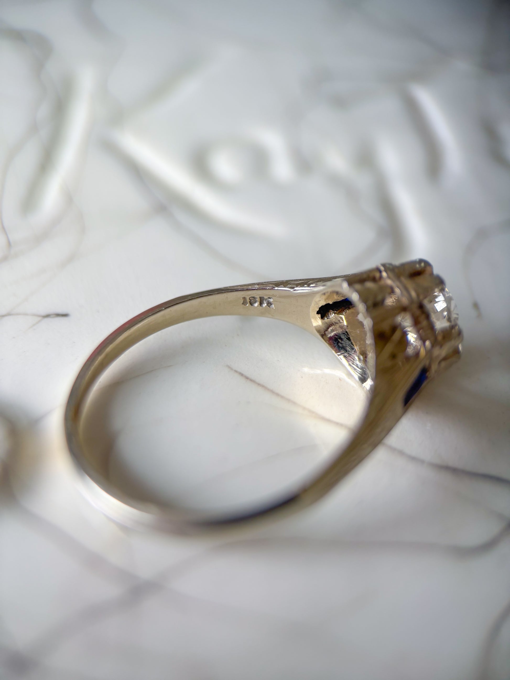 I am obsessed with old miner diamonds, so therefore I am obsessed with this ring. This vintage, 18k white gold ring features an old mine diamond and natural sapphires. A simply stunning piece. This ring is a size 8 1/2 and can be resized at your local jeweler.