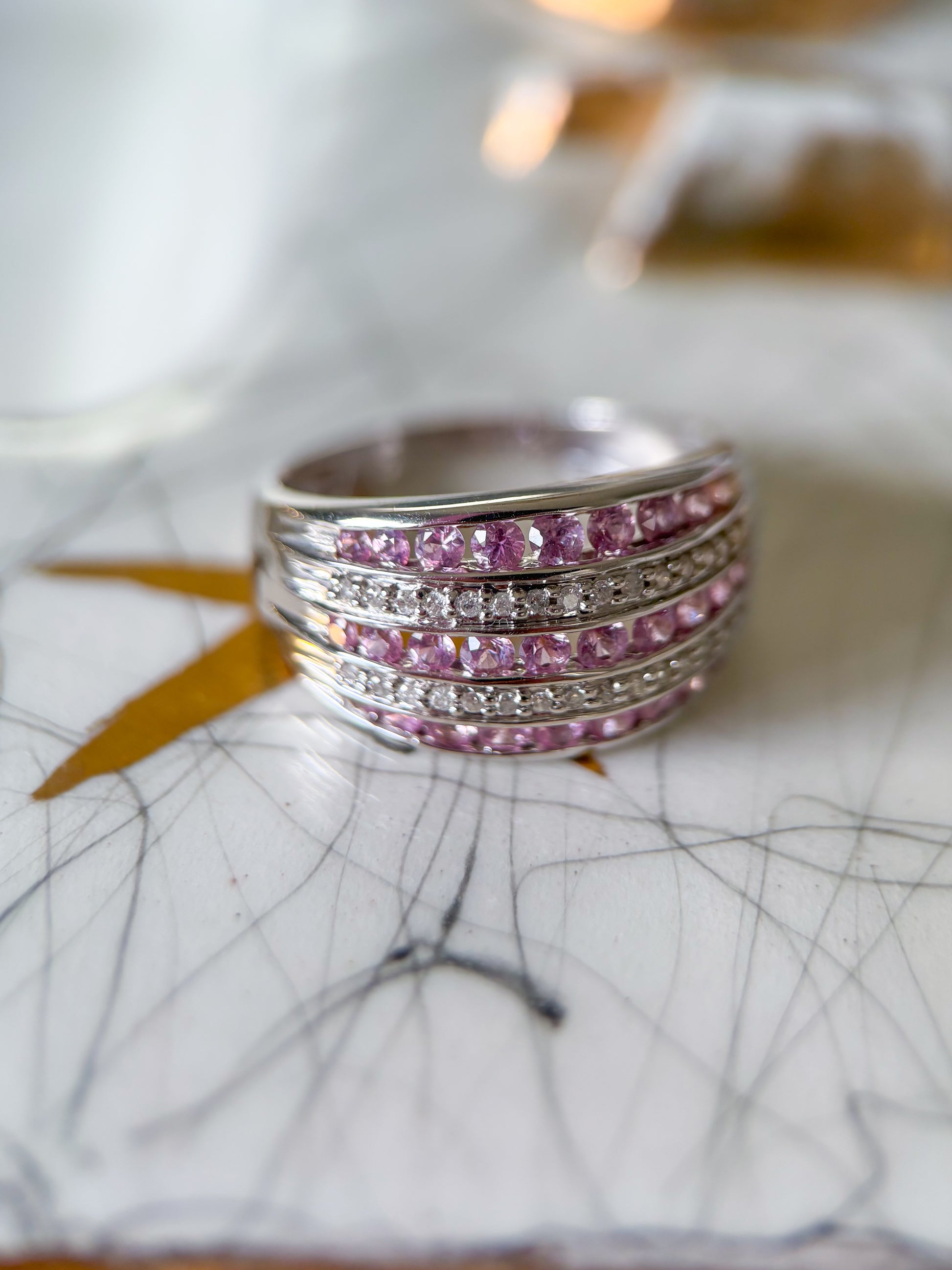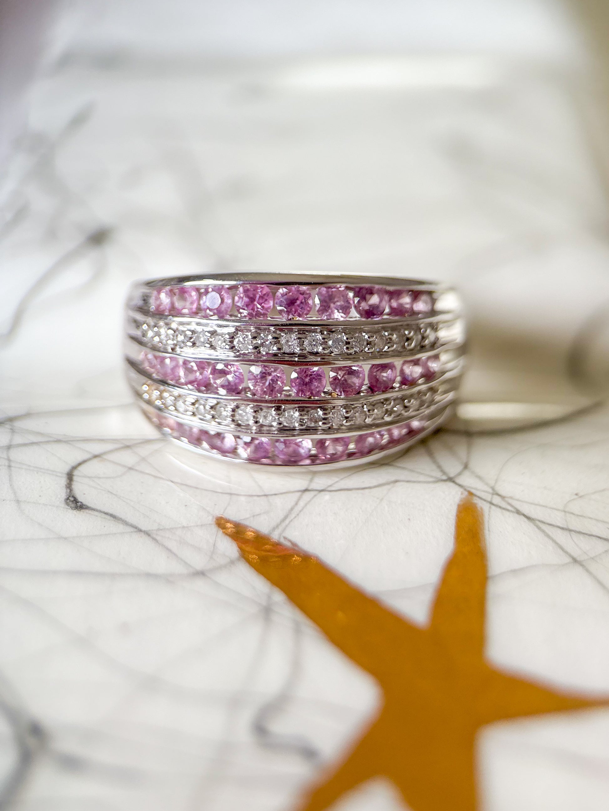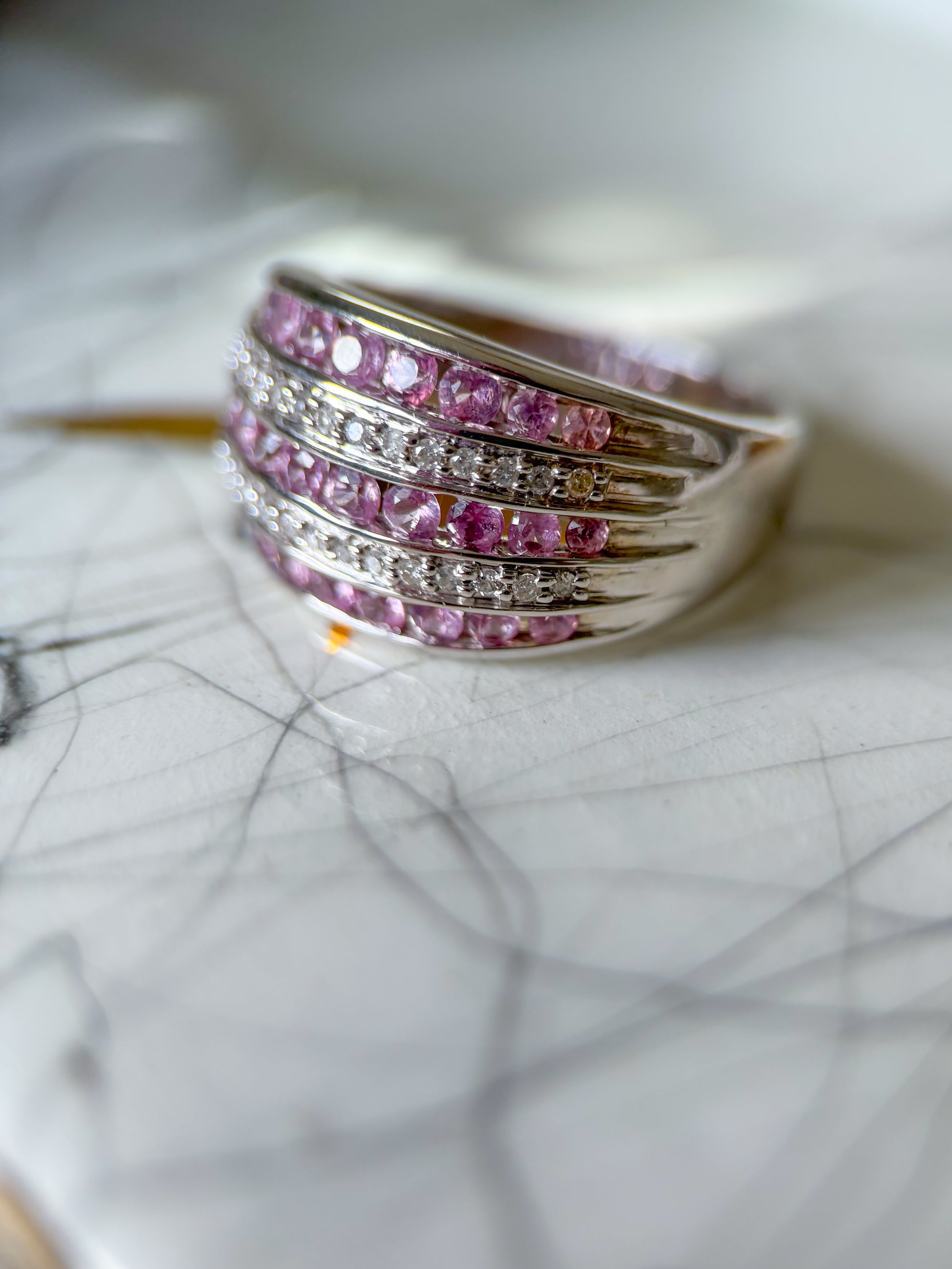 Vintage, 14k white gold chunky ring featuring natural diamonds and synthetic pink topaz. Ring is a size 7 and can be resized at your local jeweler.