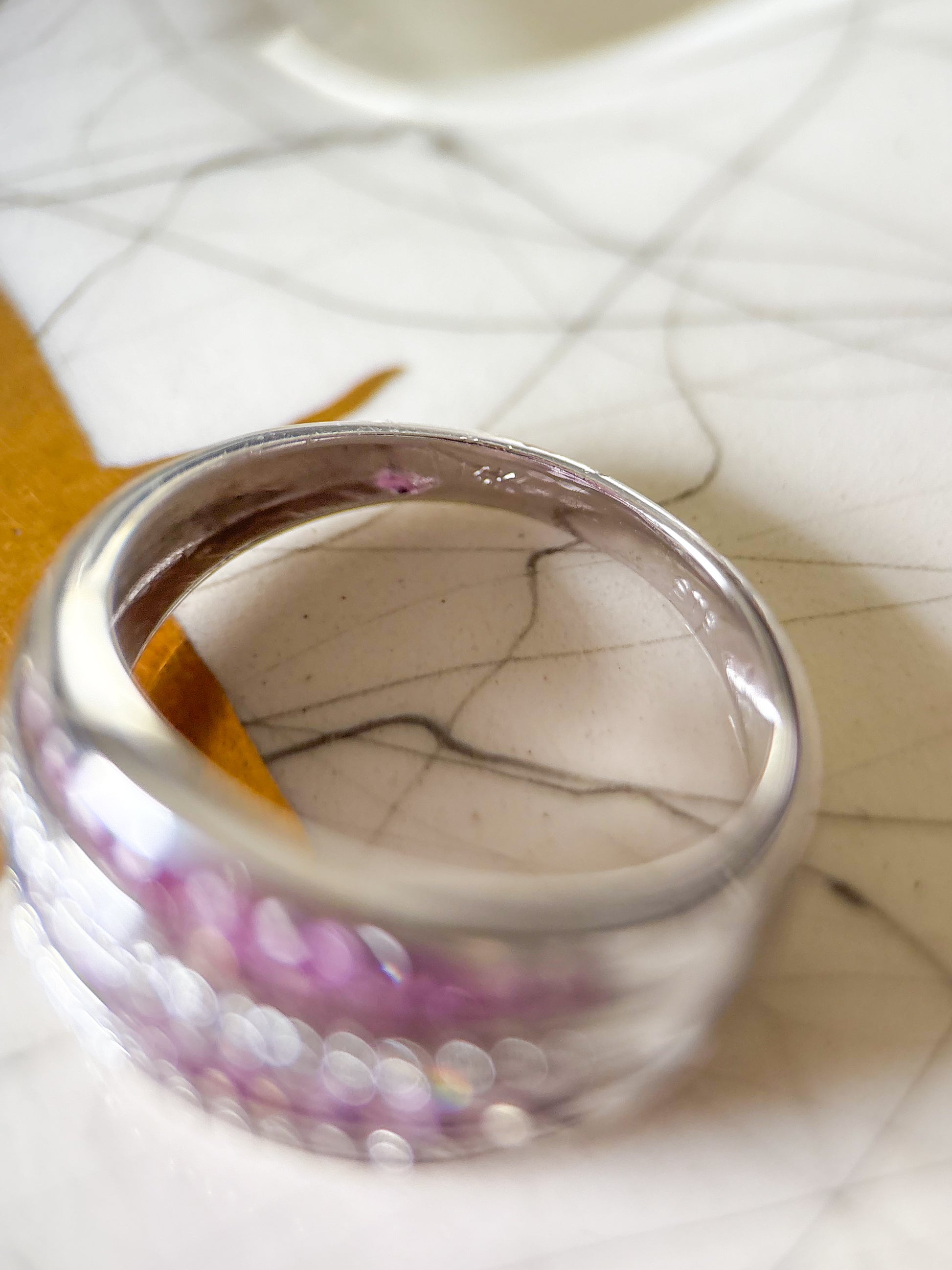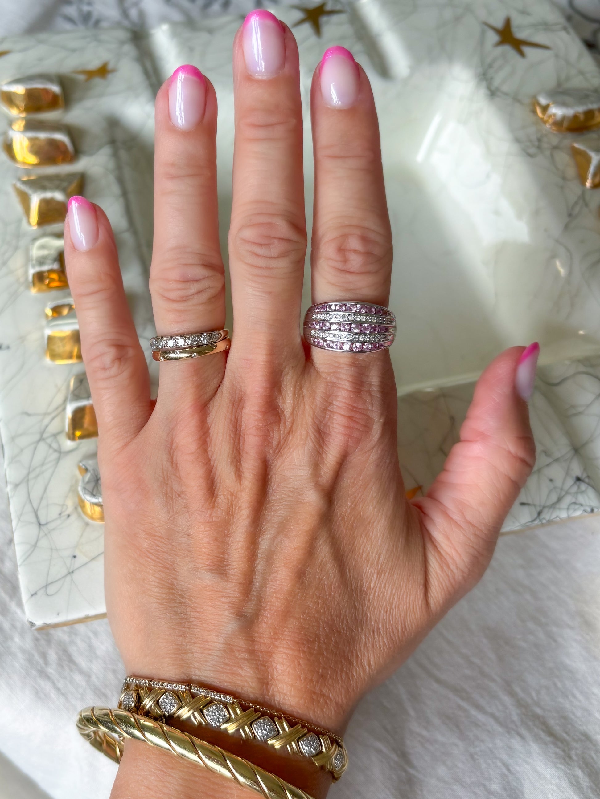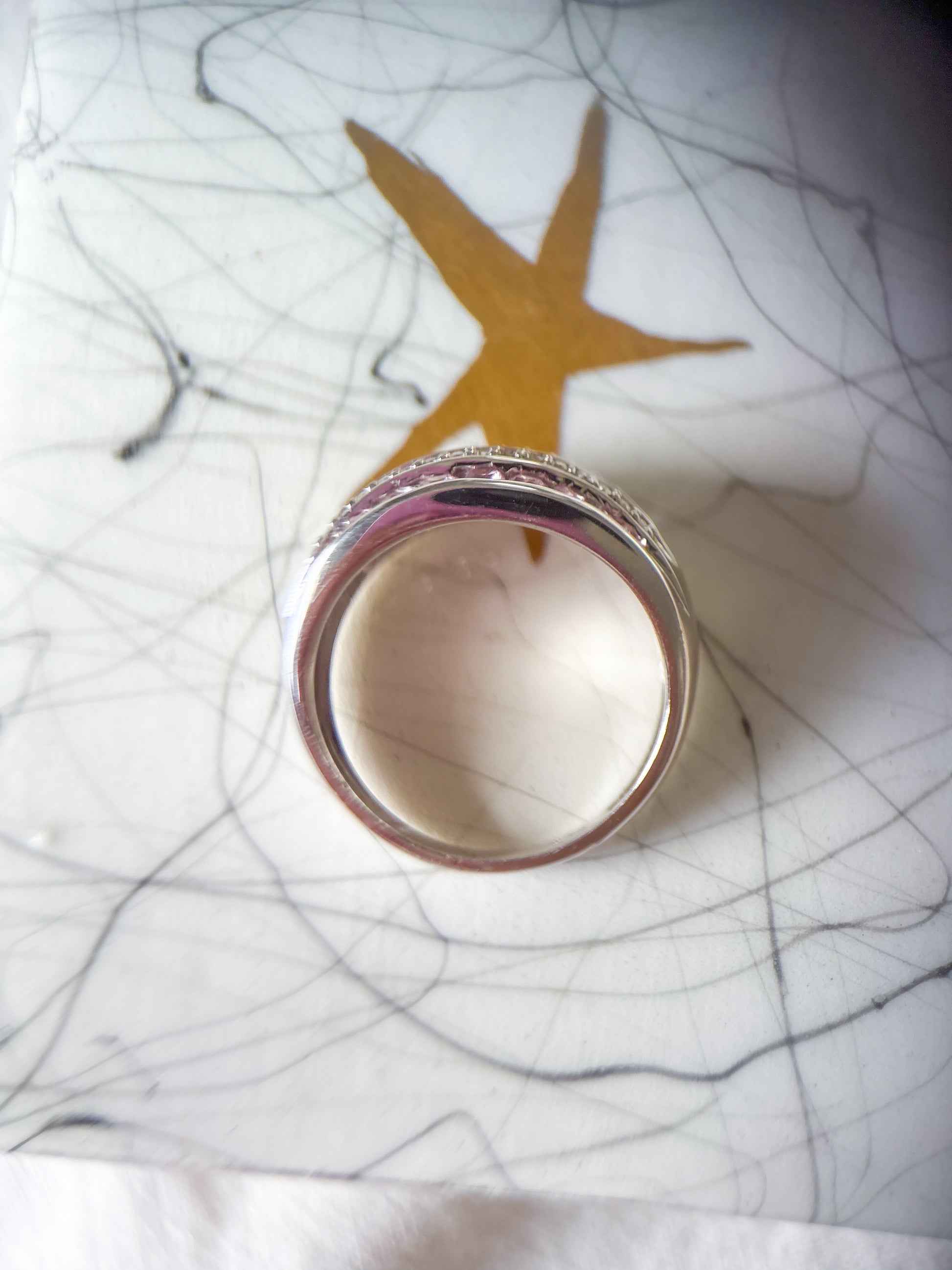 Vintage, 14k white gold chunky ring featuring natural diamonds and synthetic pink topaz. Ring is a size 7 and can be resized at your local jeweler.