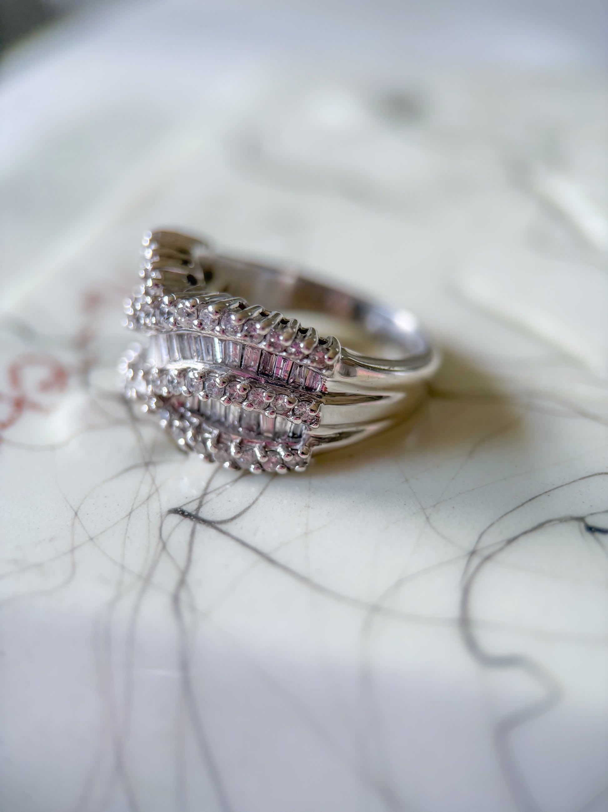 Absolutely stunning, 14k white gold, and natural diamond, vintage ring. This ring is a size 6 1/2 and can be resized at your local jeweler. We have matching huggies too!