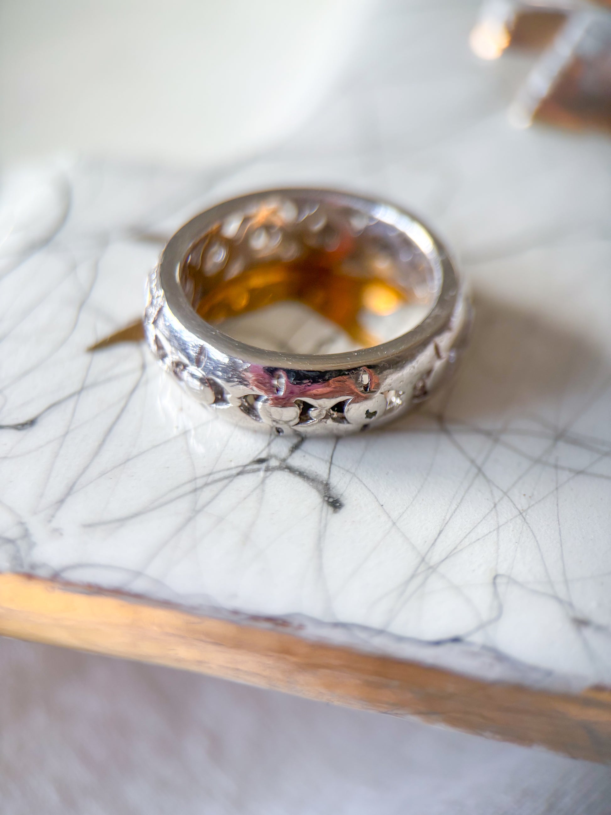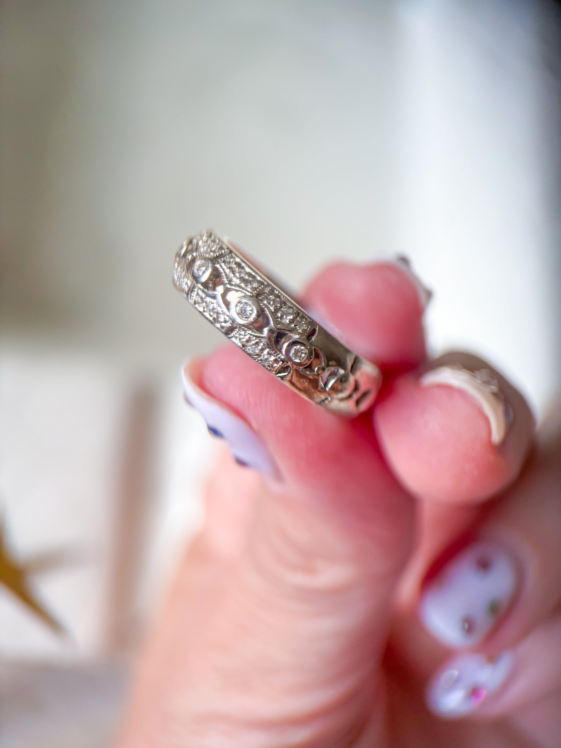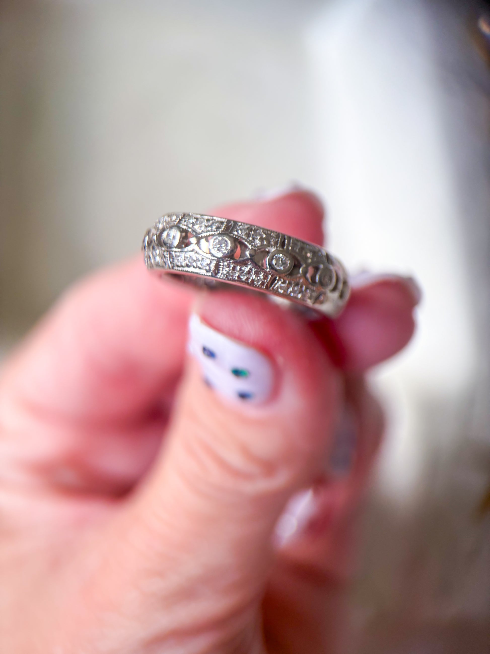 This is a really beautiful, vintage, 18k white gold band featuring natural diamonds. Ring is a size 5 3/4 and can be resized at your local jeweler.