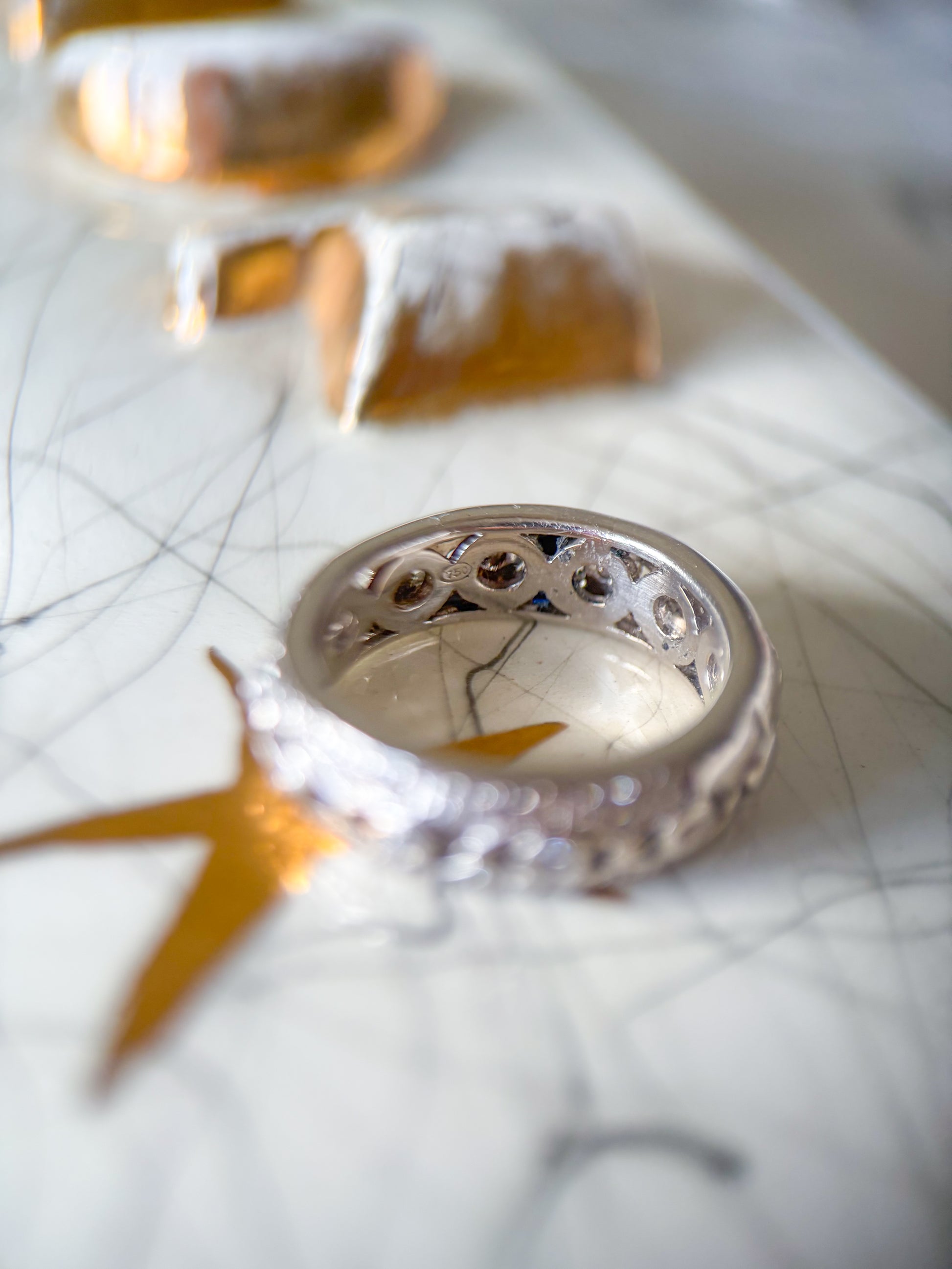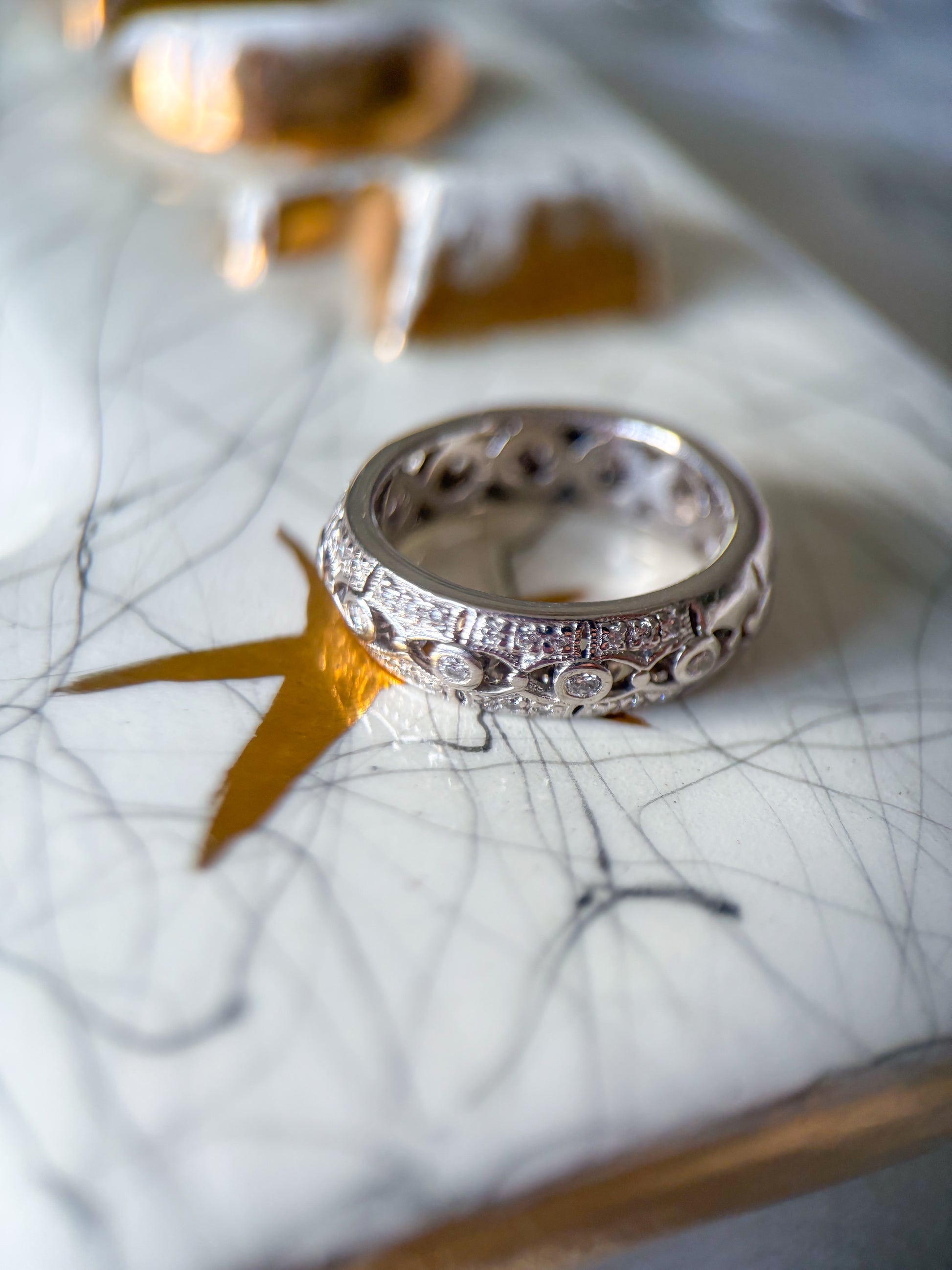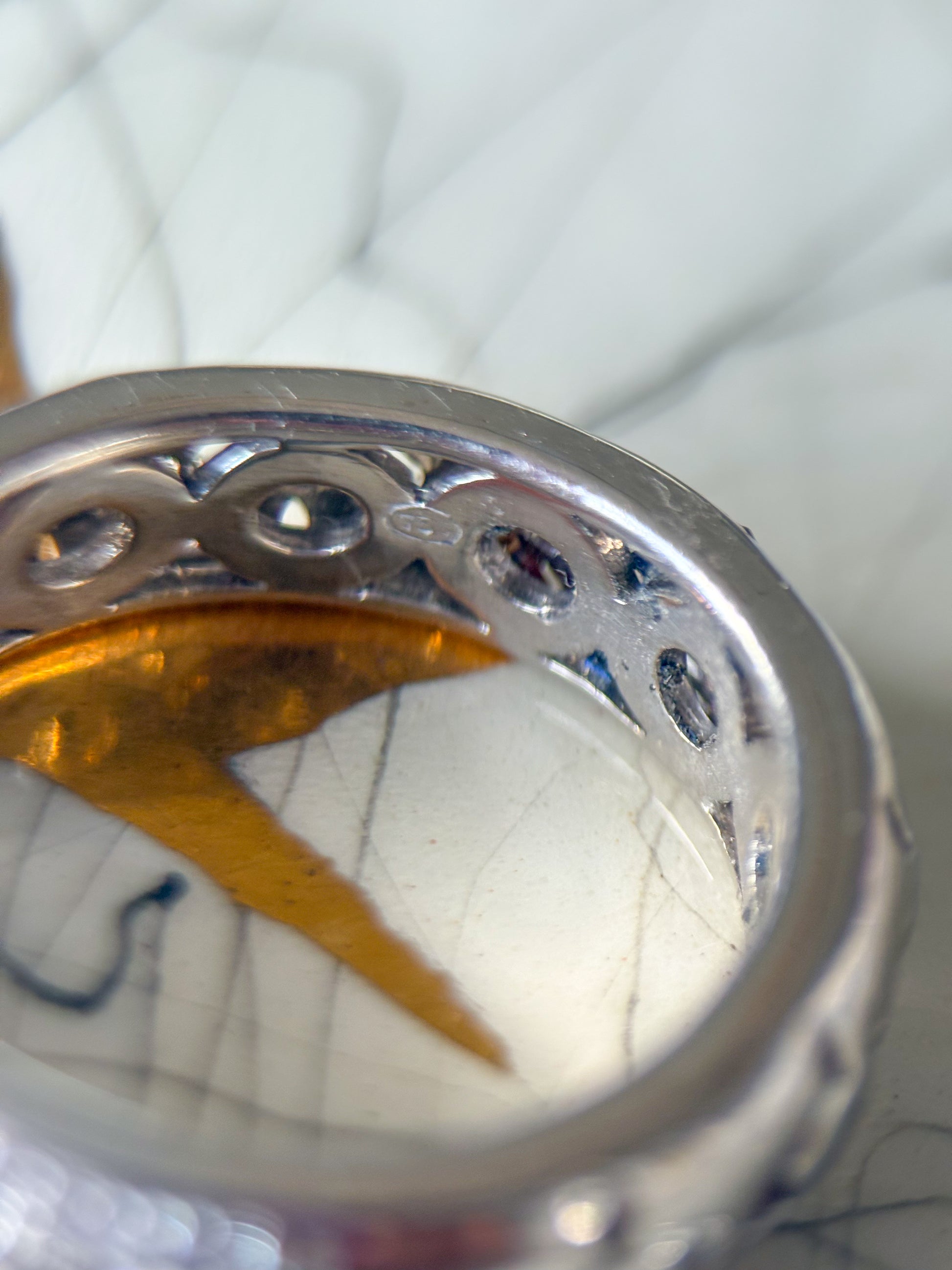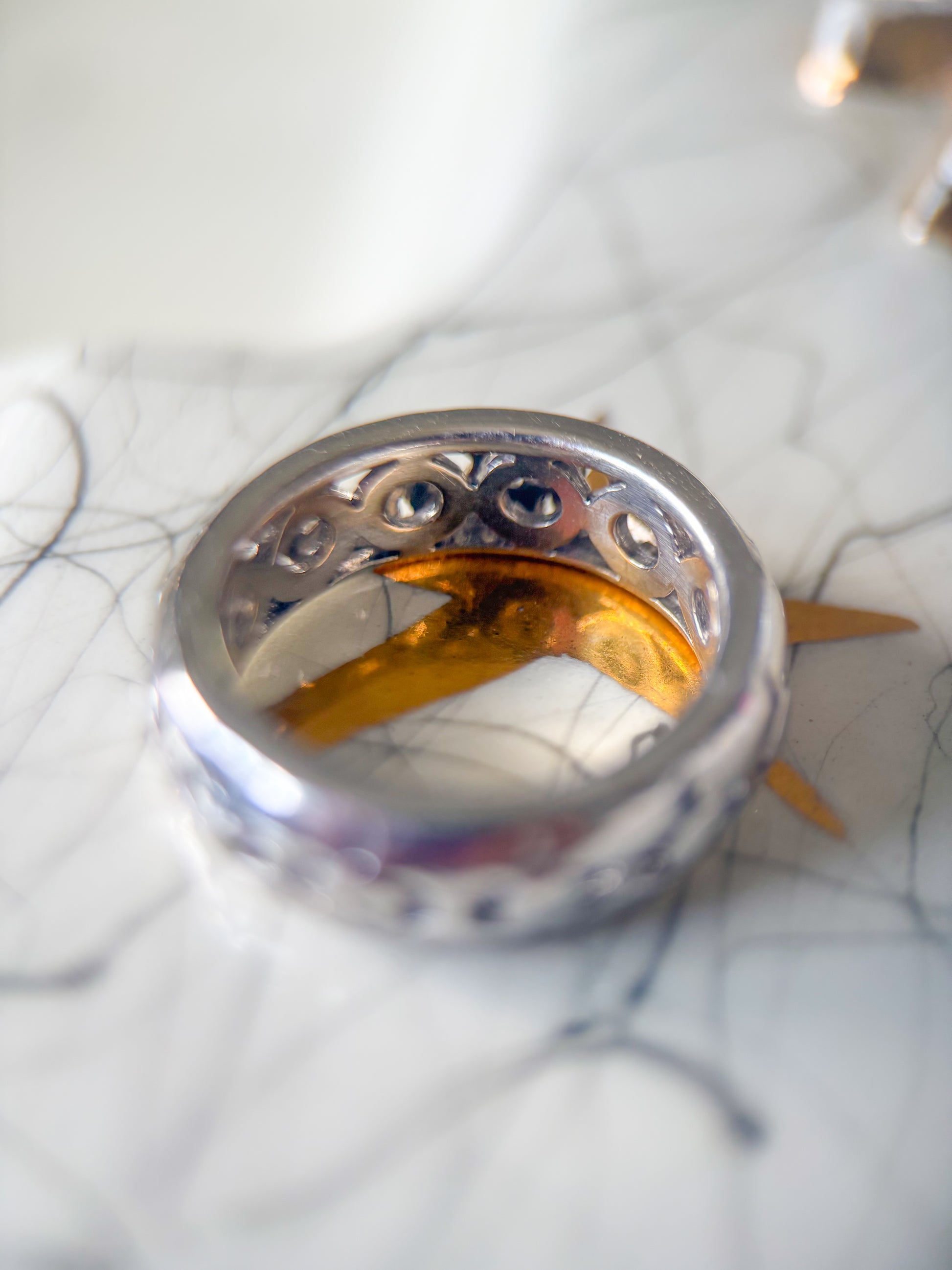 This is a really beautiful, vintage, 18k white gold band featuring natural diamonds. Ring is a size 5 3/4 and can be resized at your local jeweler.