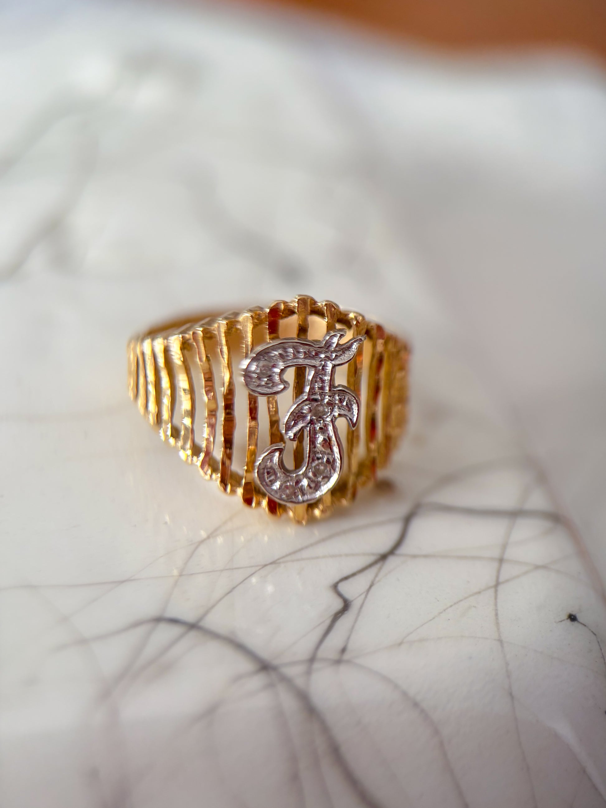 Vintage Natural Diamond Letter "F" 14k Yellow Gold Ring
