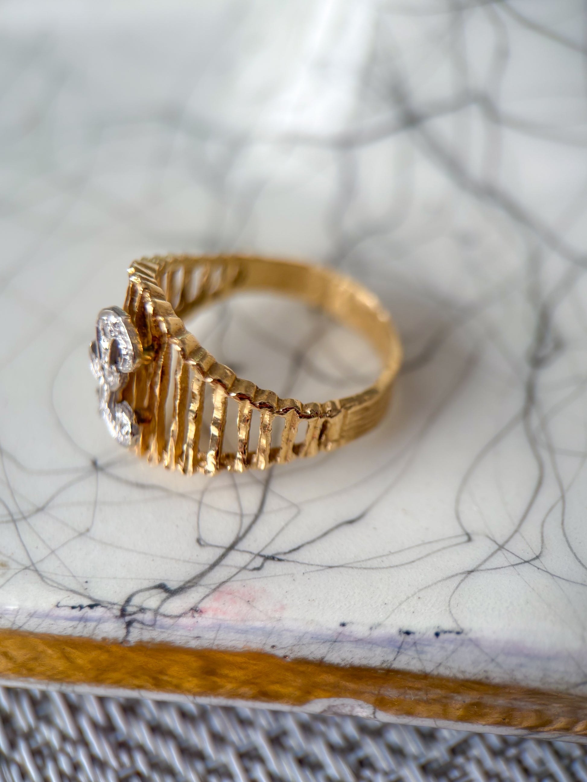 In love with this vintage, 14k yellow gold ring featuring a diamond F. LOVE IT! This is ring is most likely from the 70's. Ring is a size 6.5 and can be resized at your local jeweler.