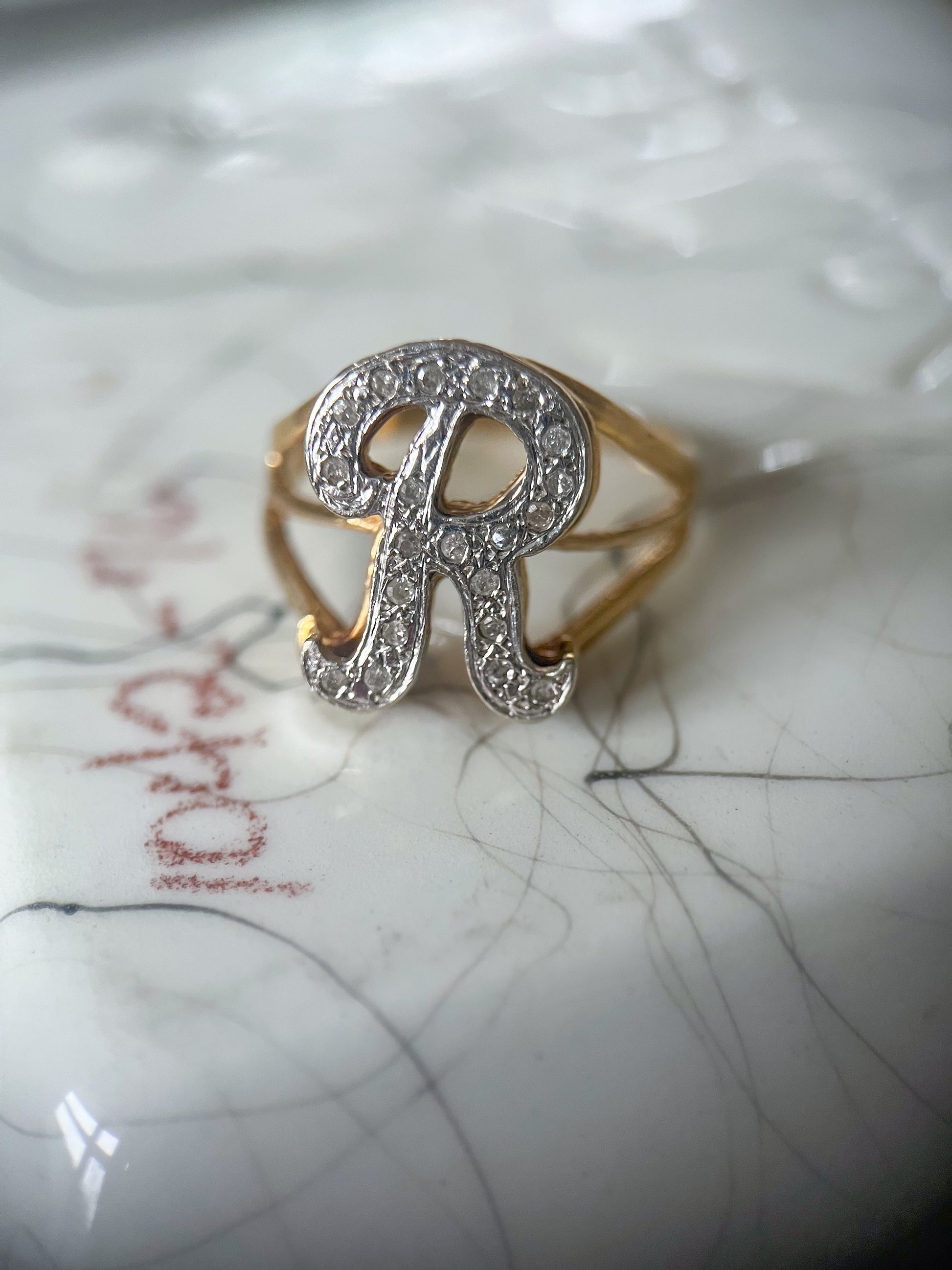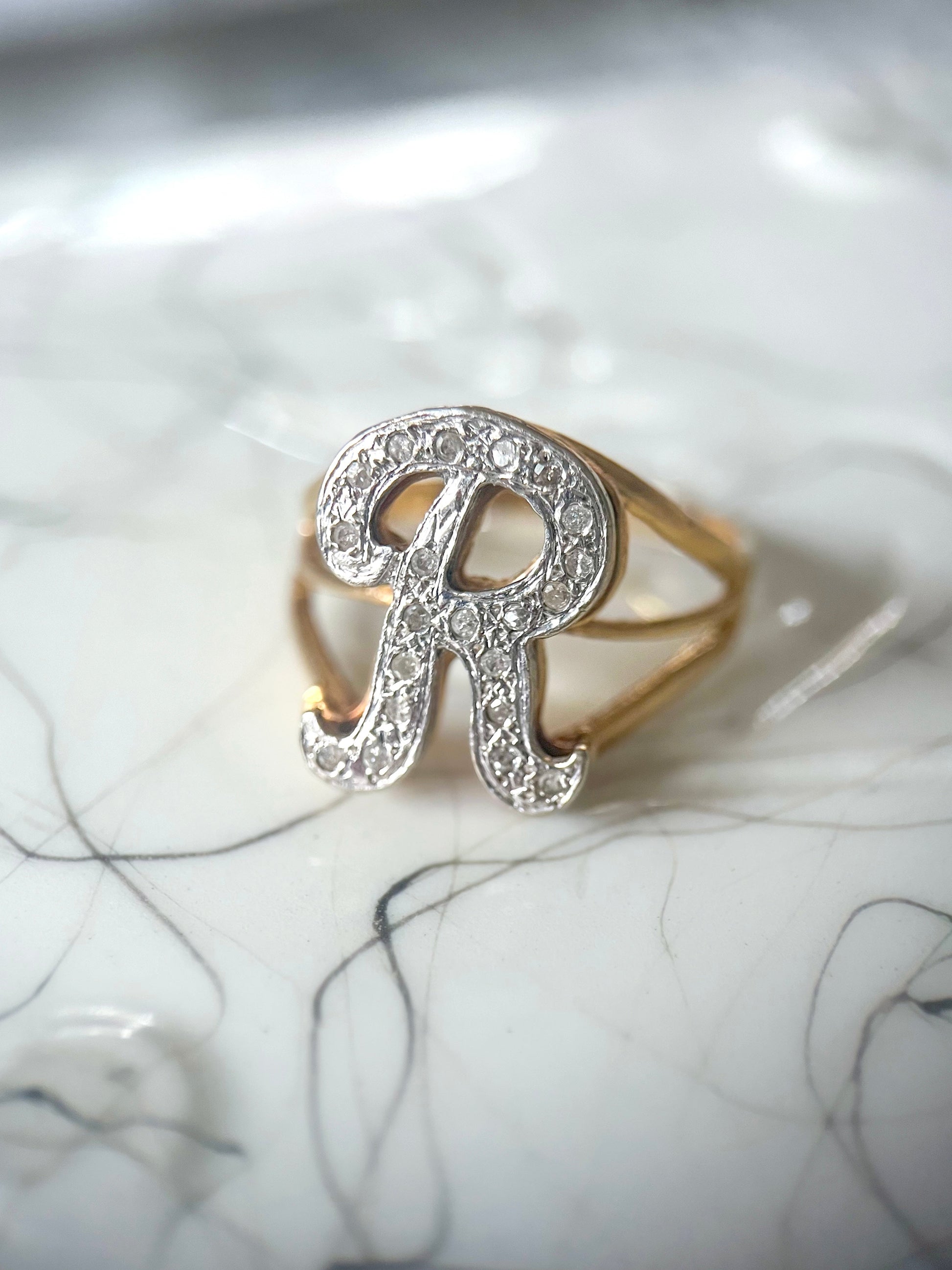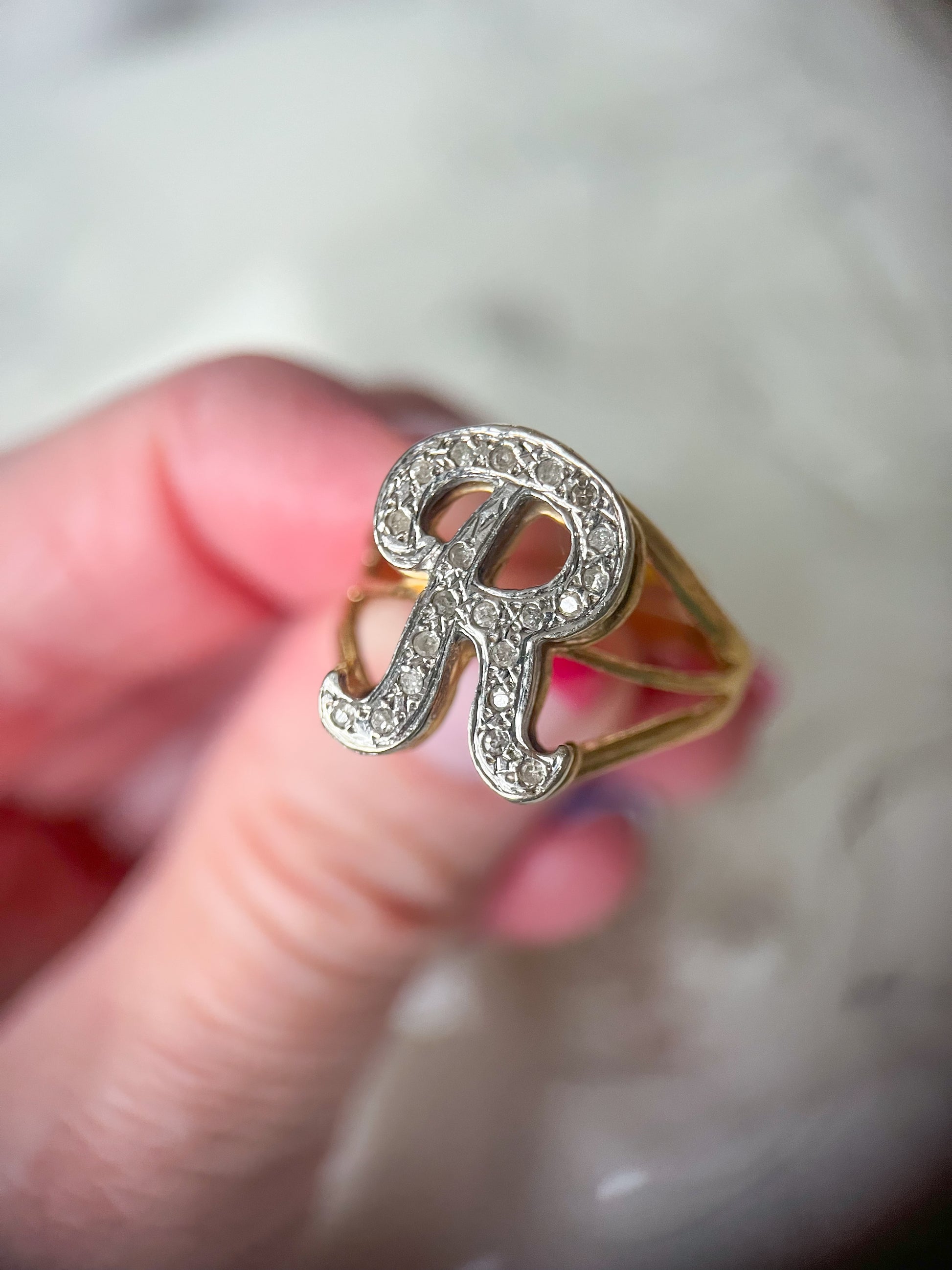 Vintage Natural Diamond Letter "R" 14k Yellow Gold Ring
