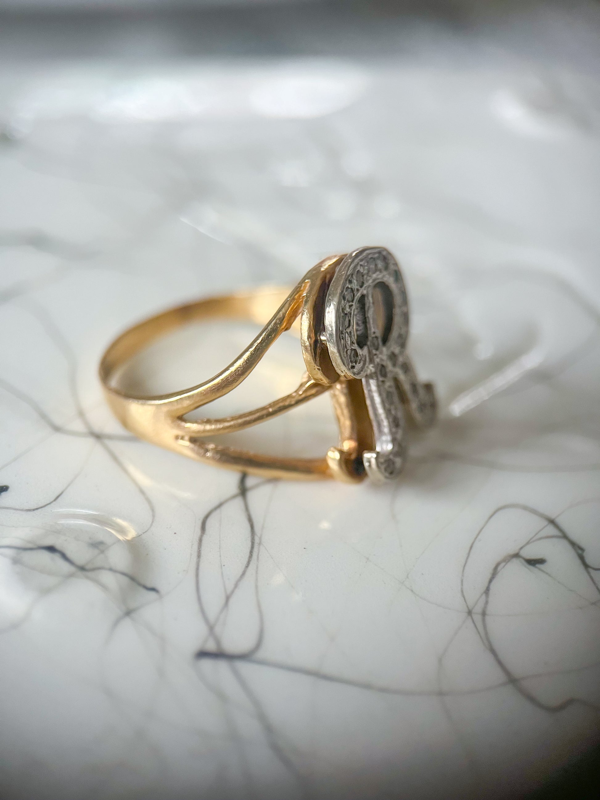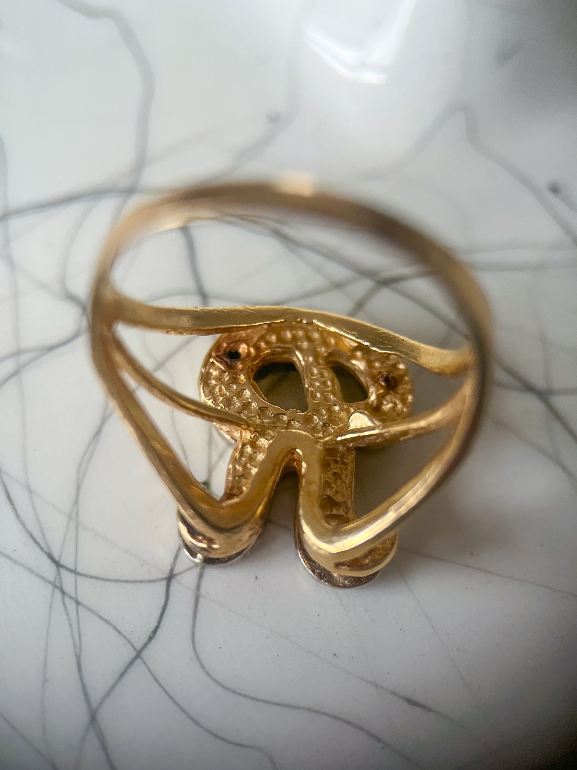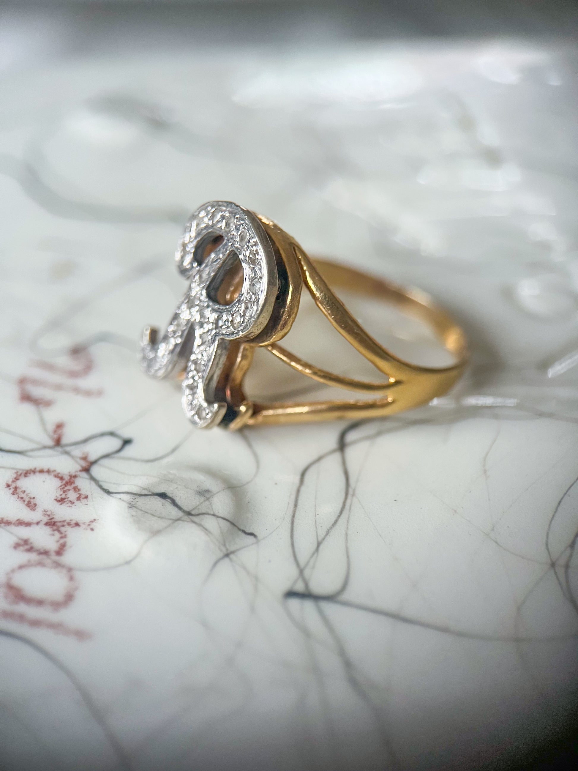 Vintage Natural Diamond Letter "R" 14k Yellow Gold Ring