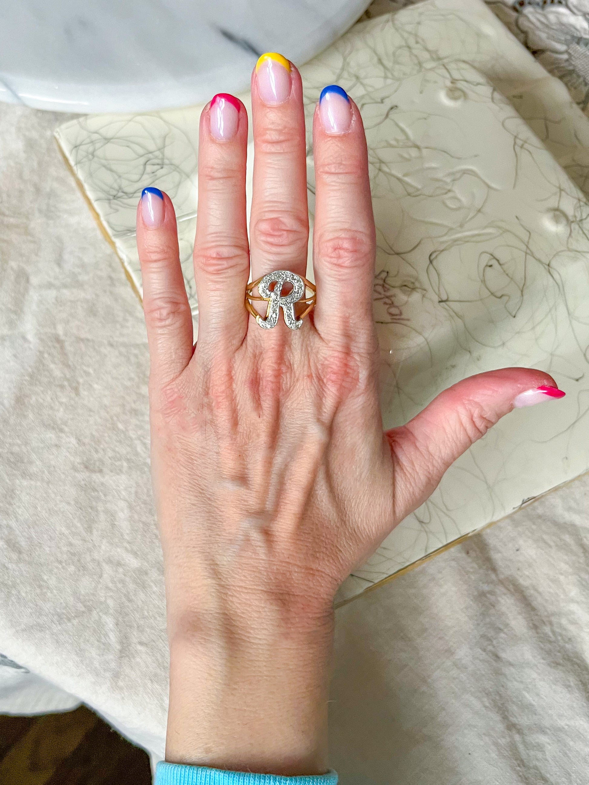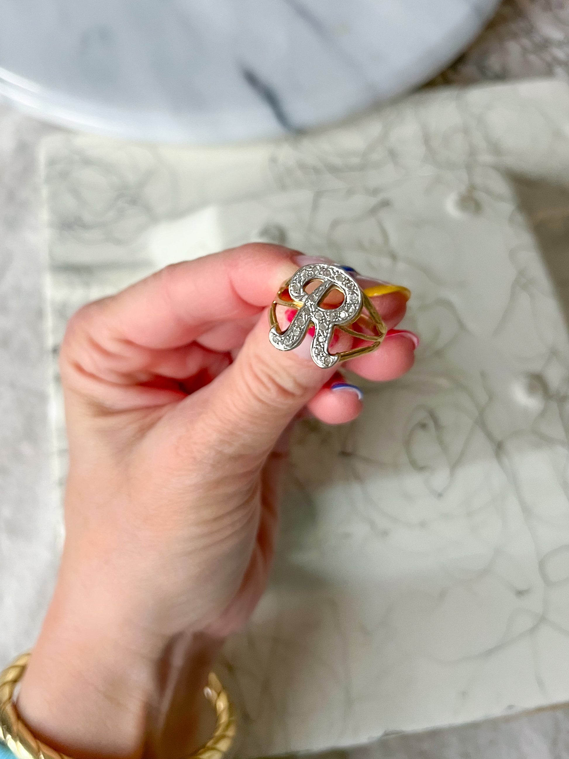 No words needed! :) This stunning, vintage, natural diamond "R" ring is a size 9 and can be resized at your local jeweler.